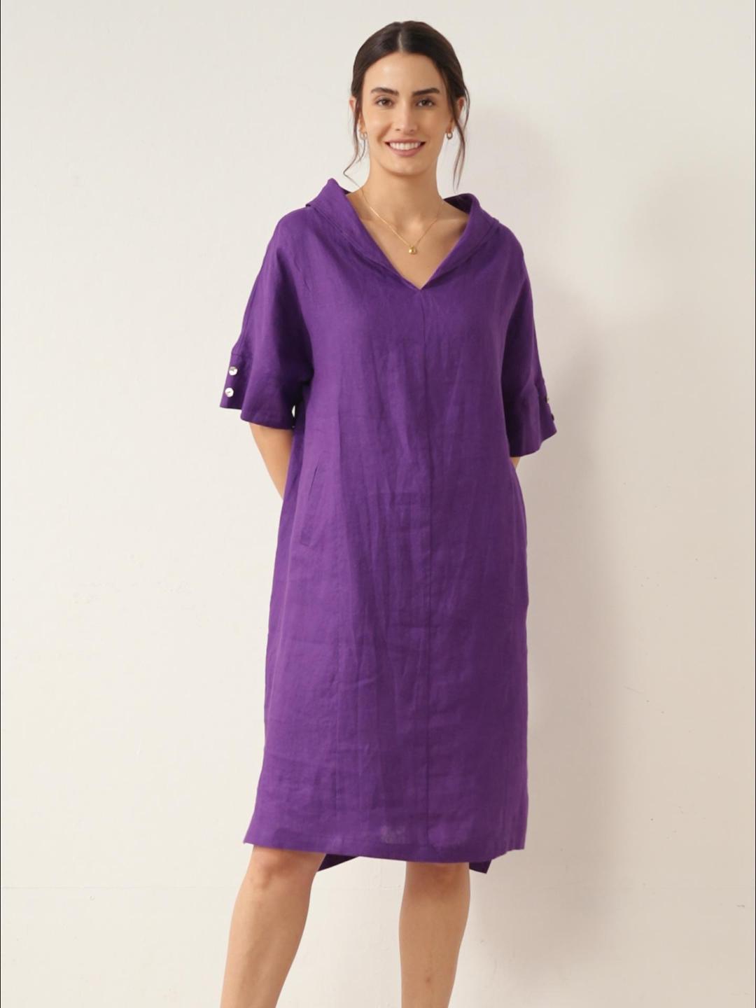 100% Linen V-Neck Pullover Midi Dress AUBREY
