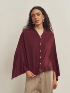 This Multi-Cape in textured viscose and wool, featuring a button scarf, shawl, stole, and muffler poncho, offers versatile styling options that showcase a distinctive layered silhouette, suitable for various fashion styles. With every movement, it exudes elegance and sophistication. Simple yet designed, it embodies a sense of understated luxury.