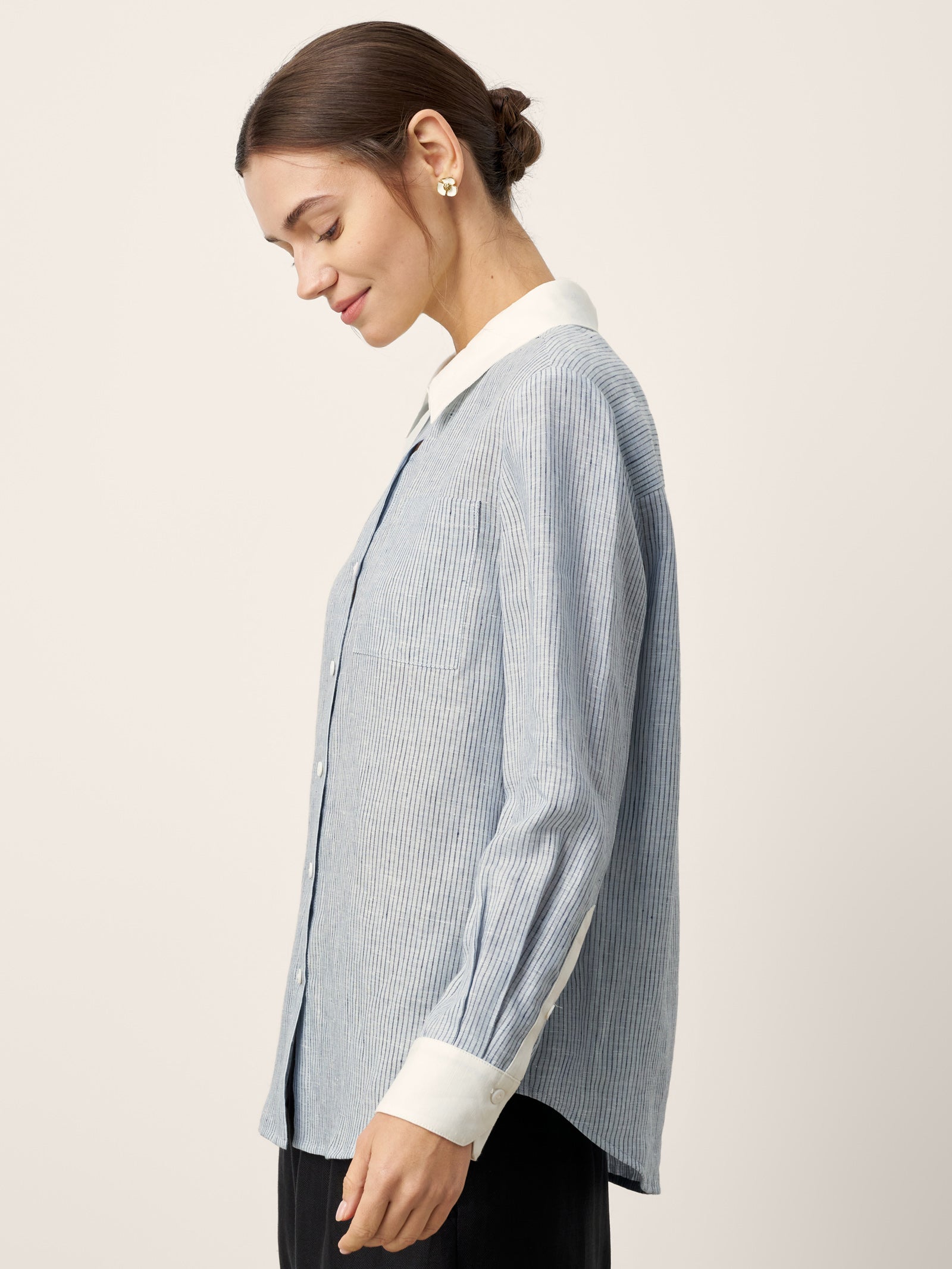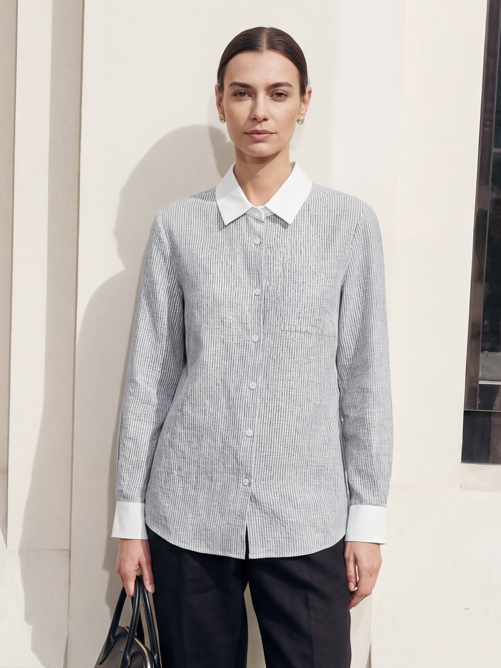 - Contrast Collar & Cuffs: Pure white detailing cuts sharply through striped fabric, amplifying visual depth while projecting polished professionalism.