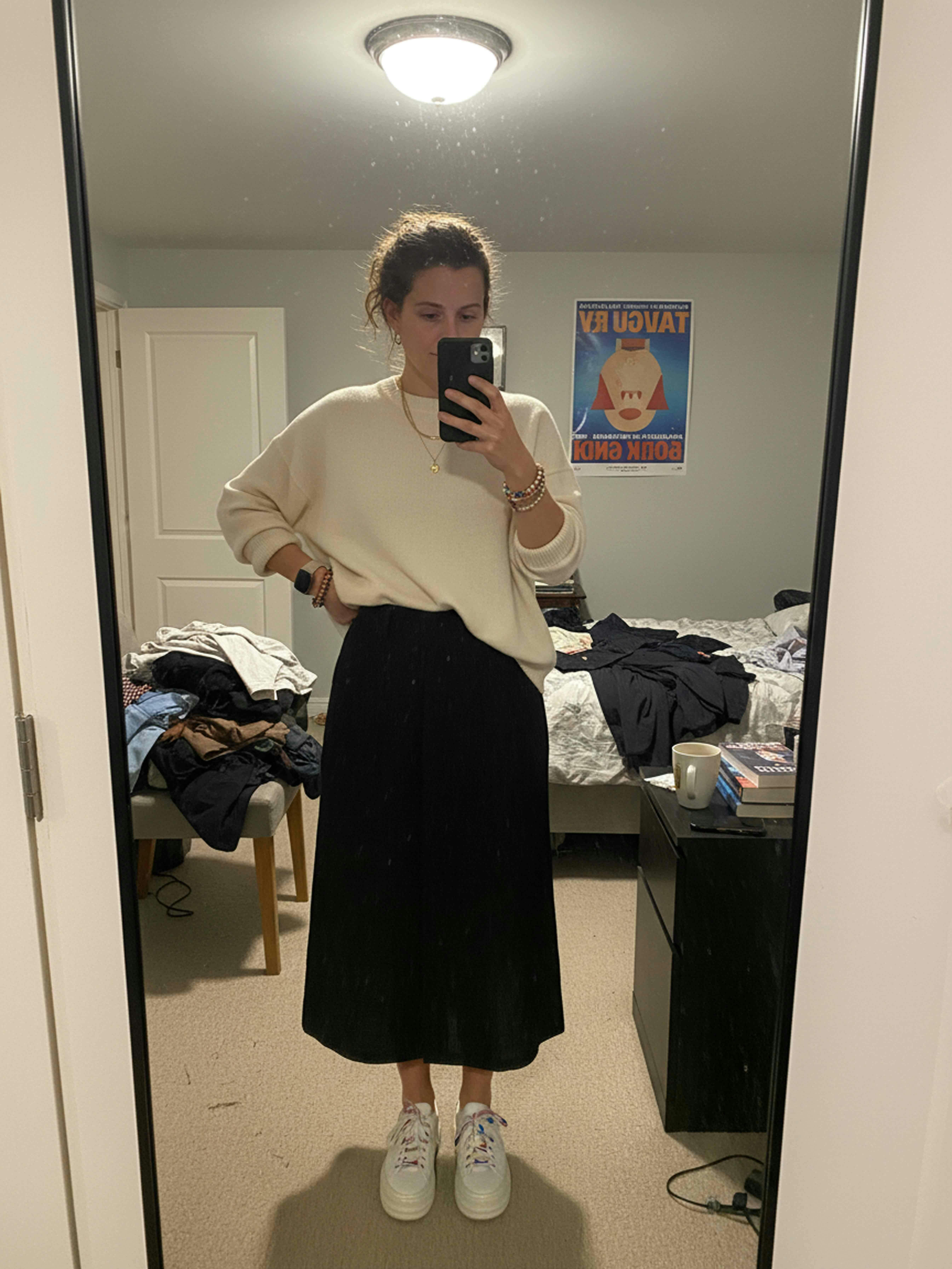 - Creative Workspace: Fitted turtleneck + block-heel ankle boots + structured satchel