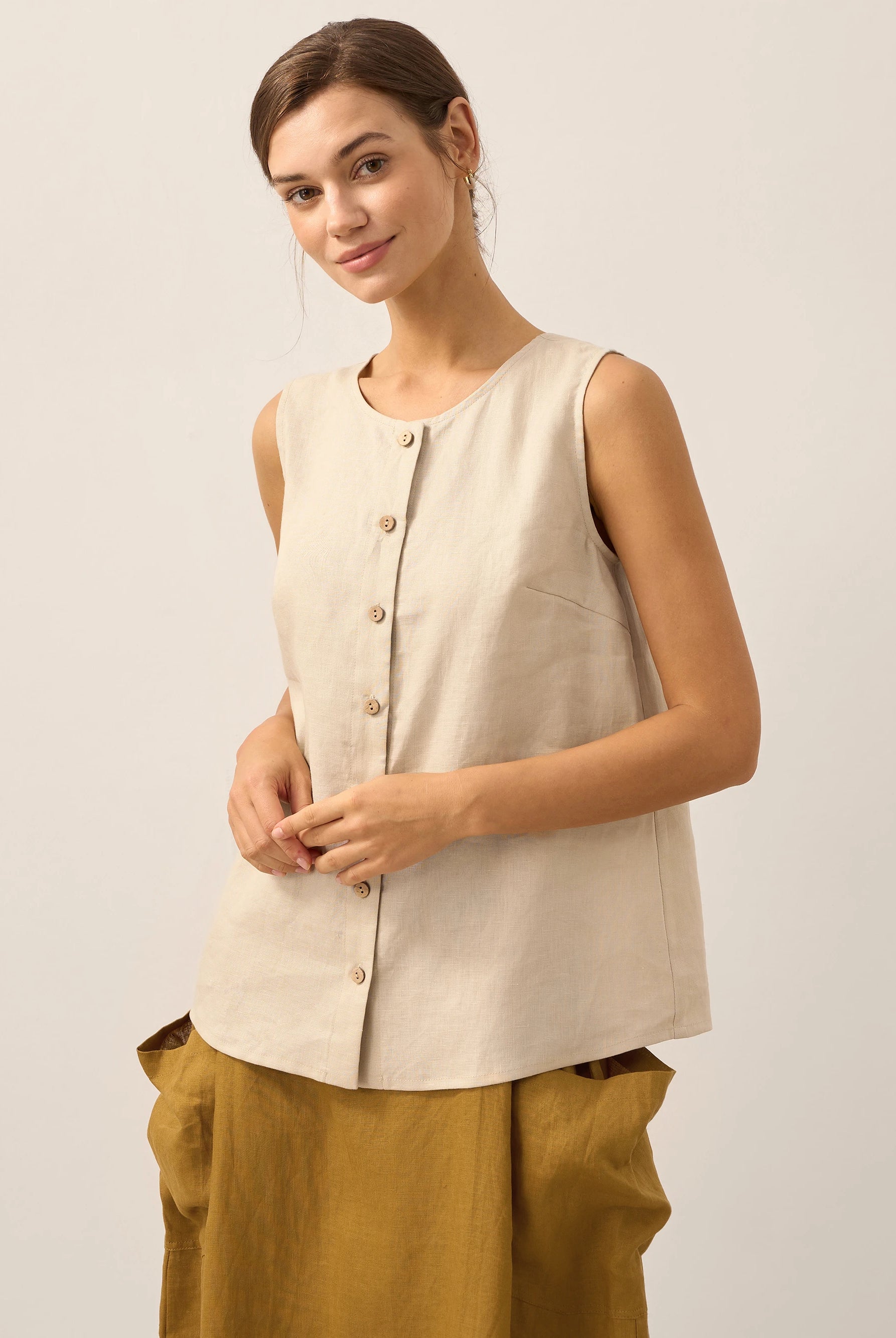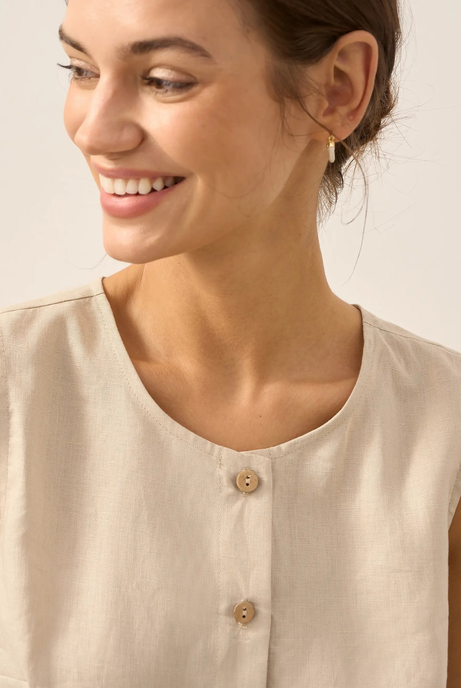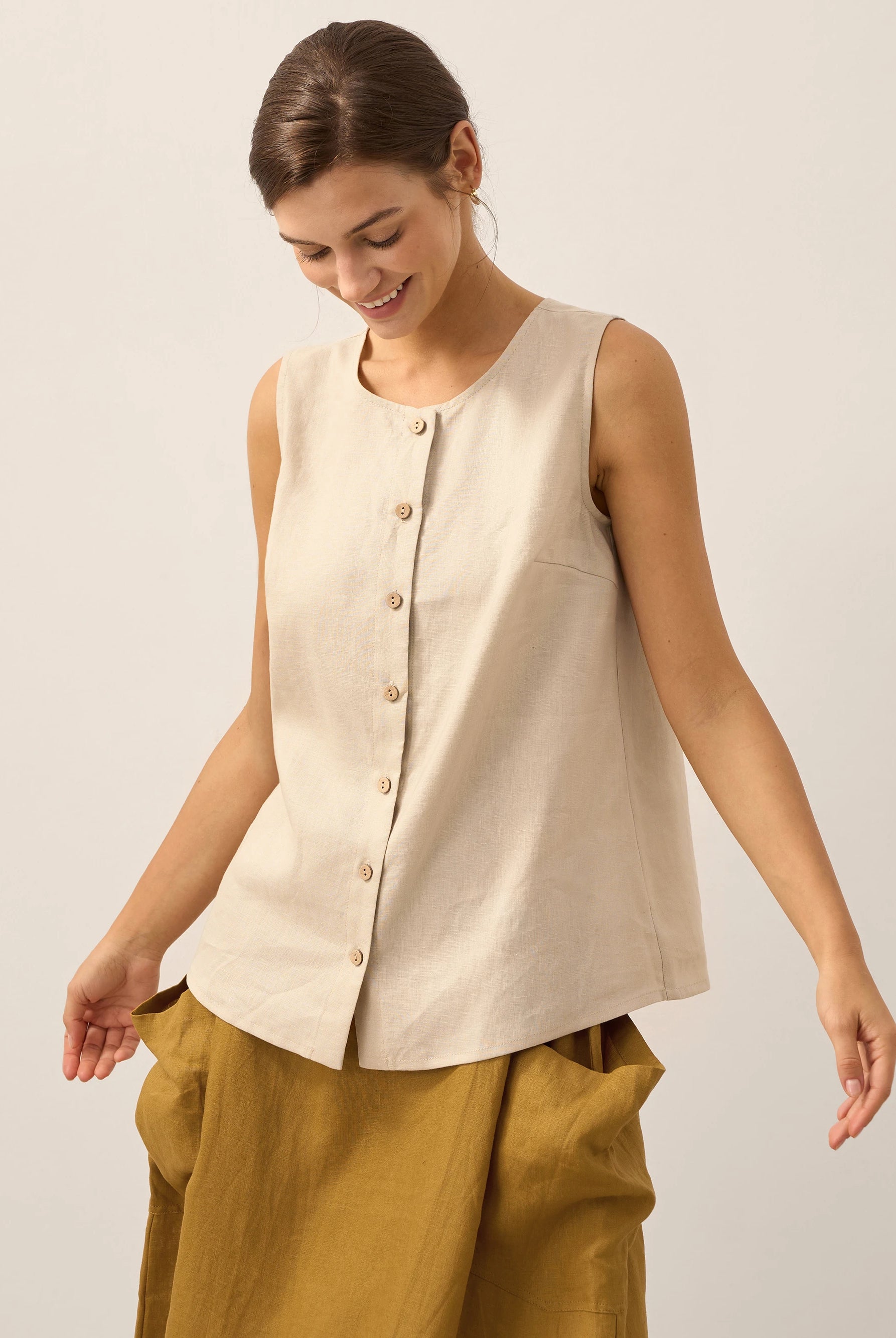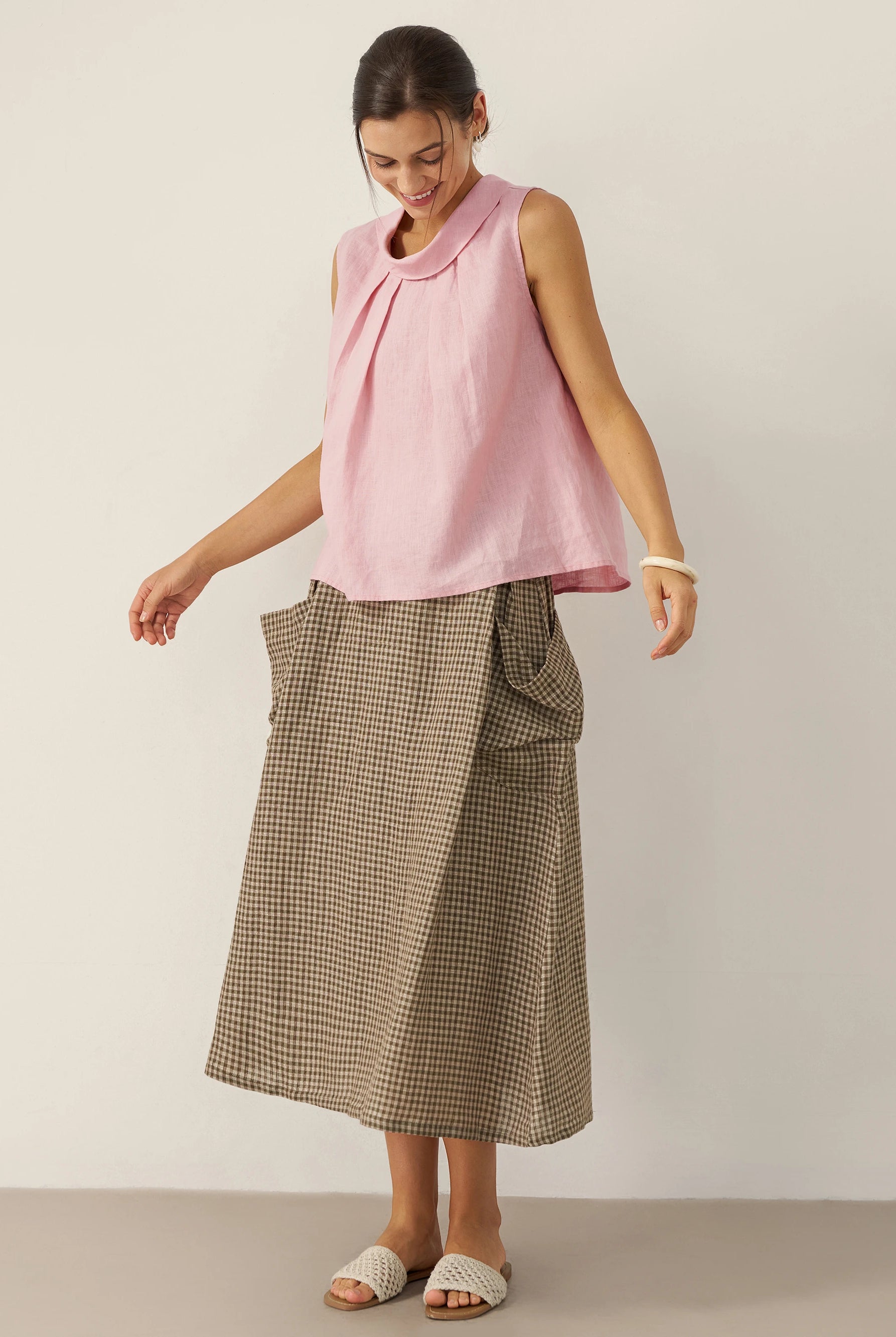 This eco-friendly checked linen top is a true gem, soft and breathable, with an incredibly flattering empire-line fit. I love the press-stud front, and it looks great with jeans, white pants, or even shorts in summer. Truly a timeless, sustainable piece!