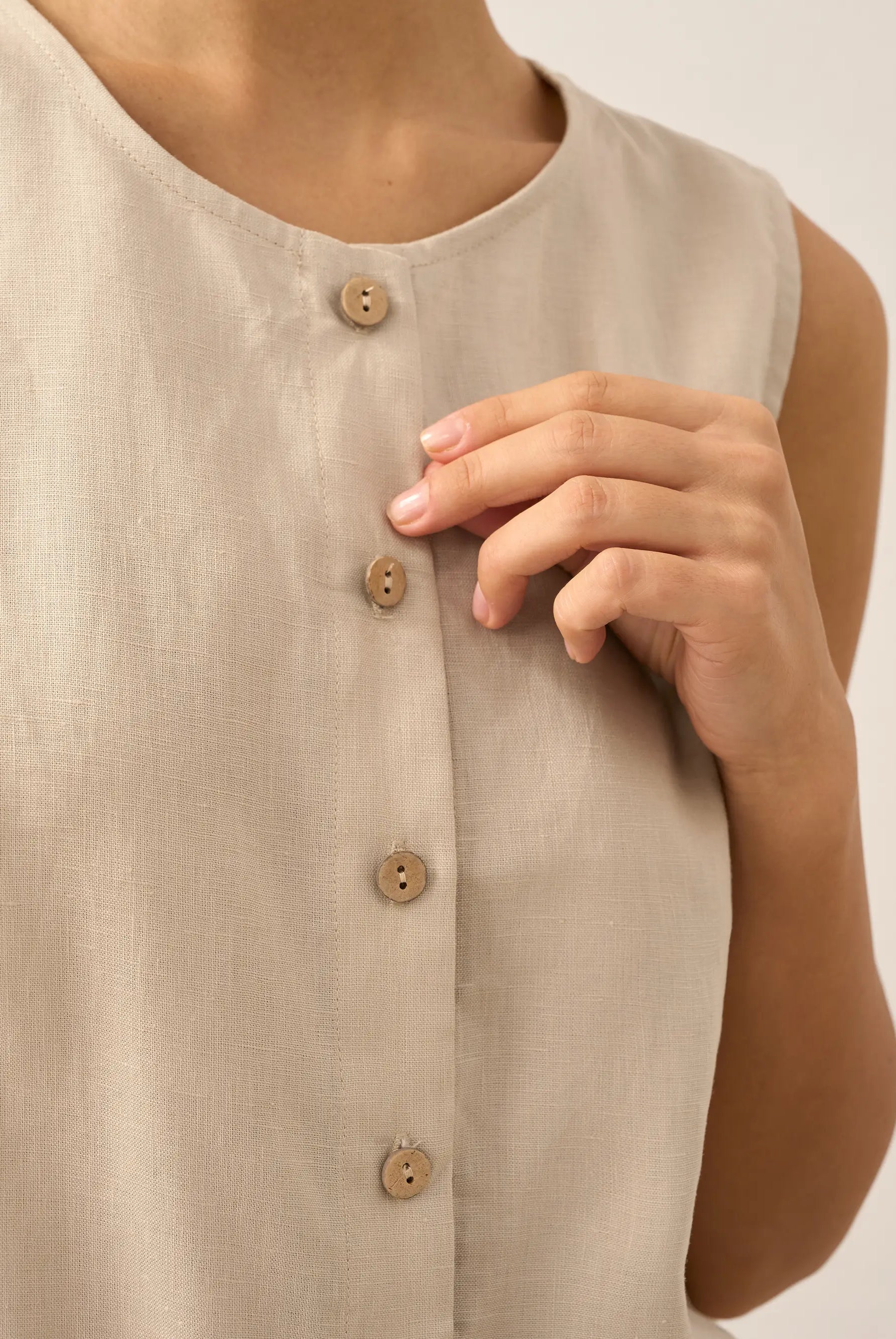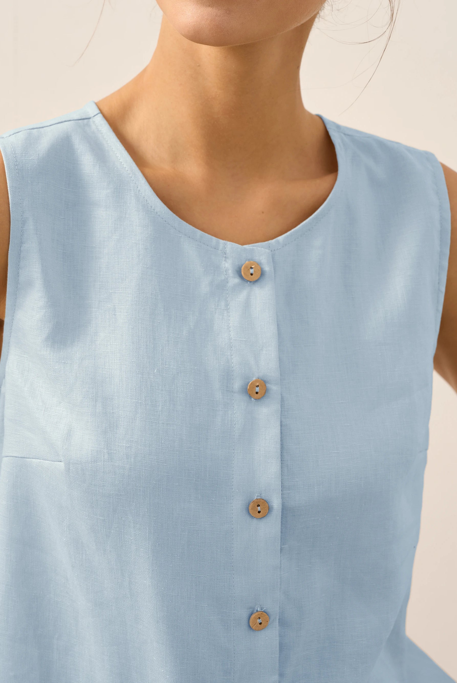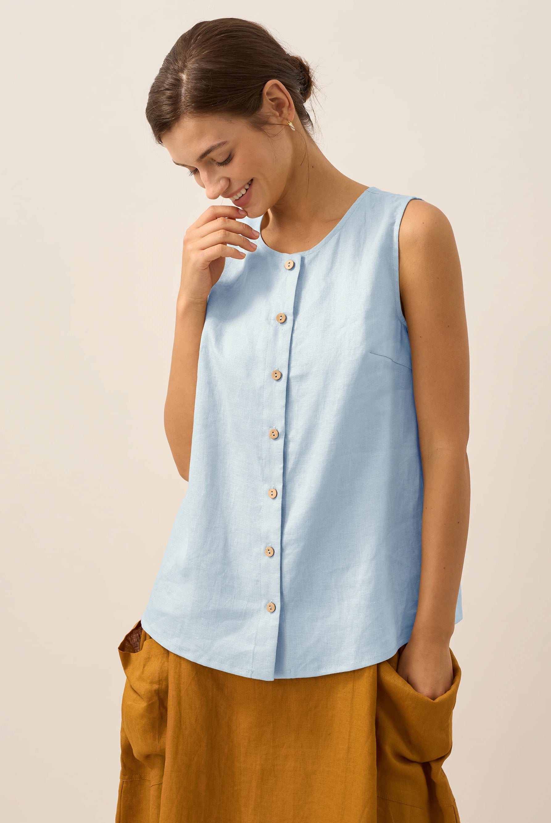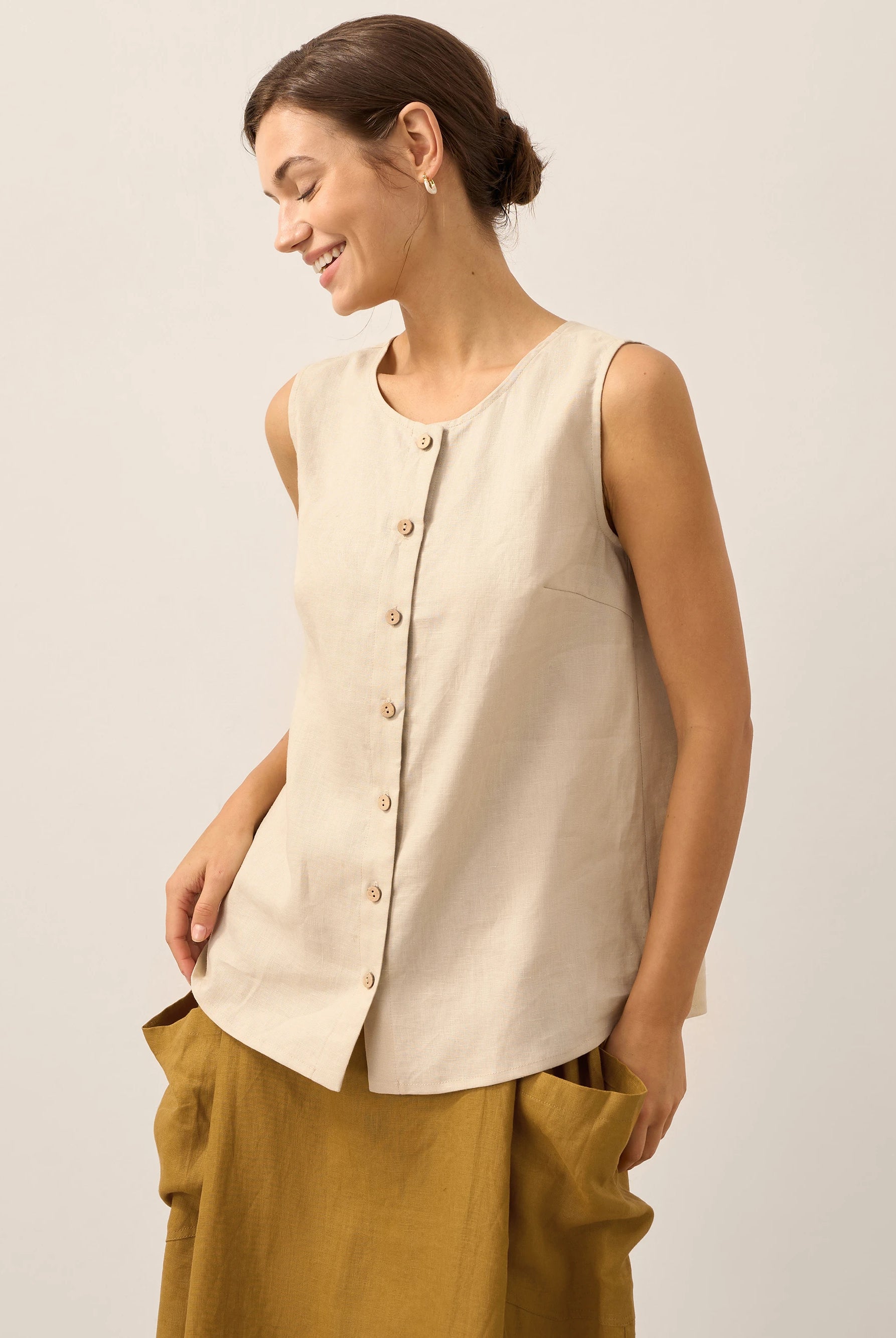 This eco-friendly checked linen top is a true gem, soft and breathable, with an incredibly flattering empire-line fit. I love the press-stud front, and it looks great with jeans, white pants, or even shorts in summer. Truly a timeless, sustainable piece!