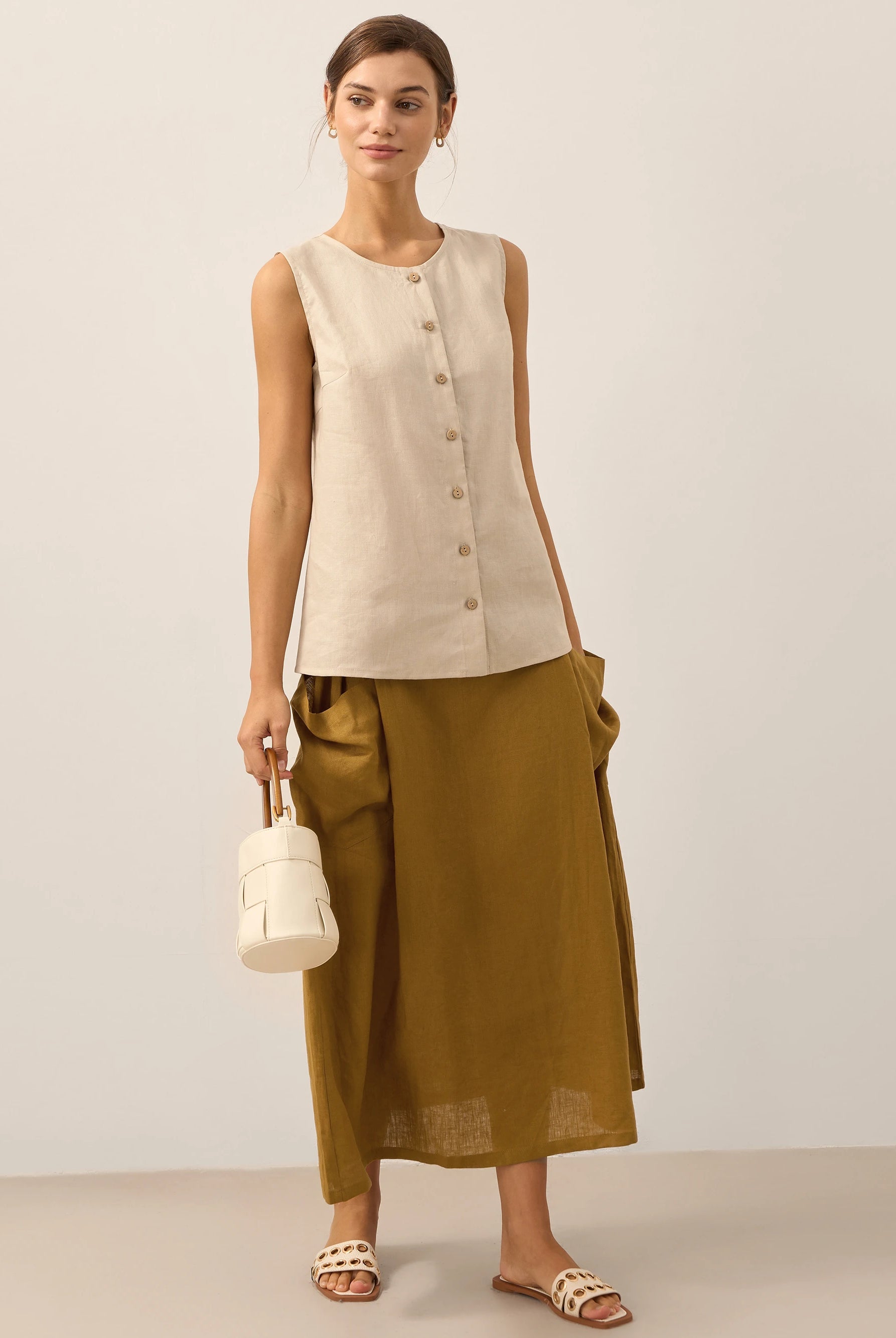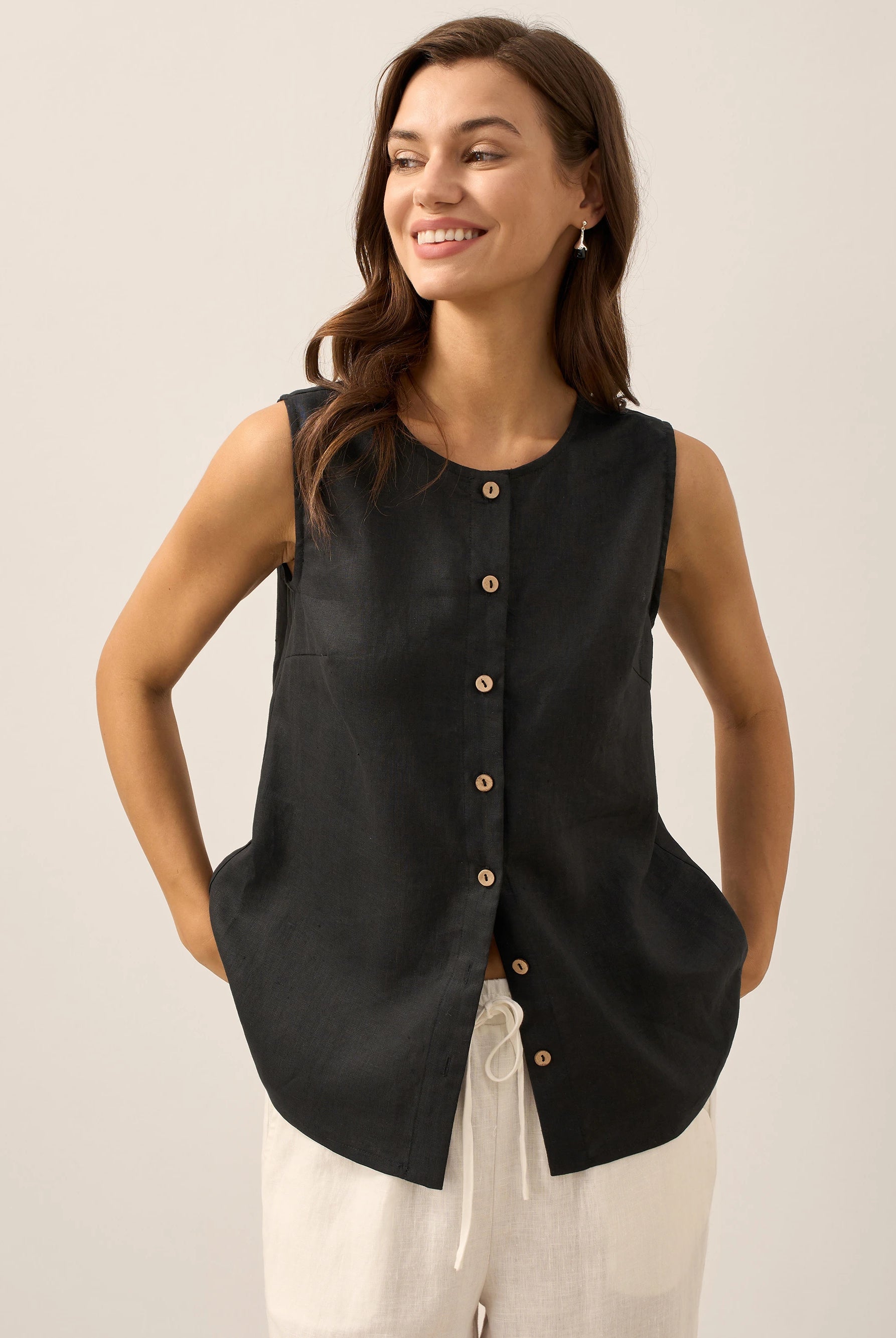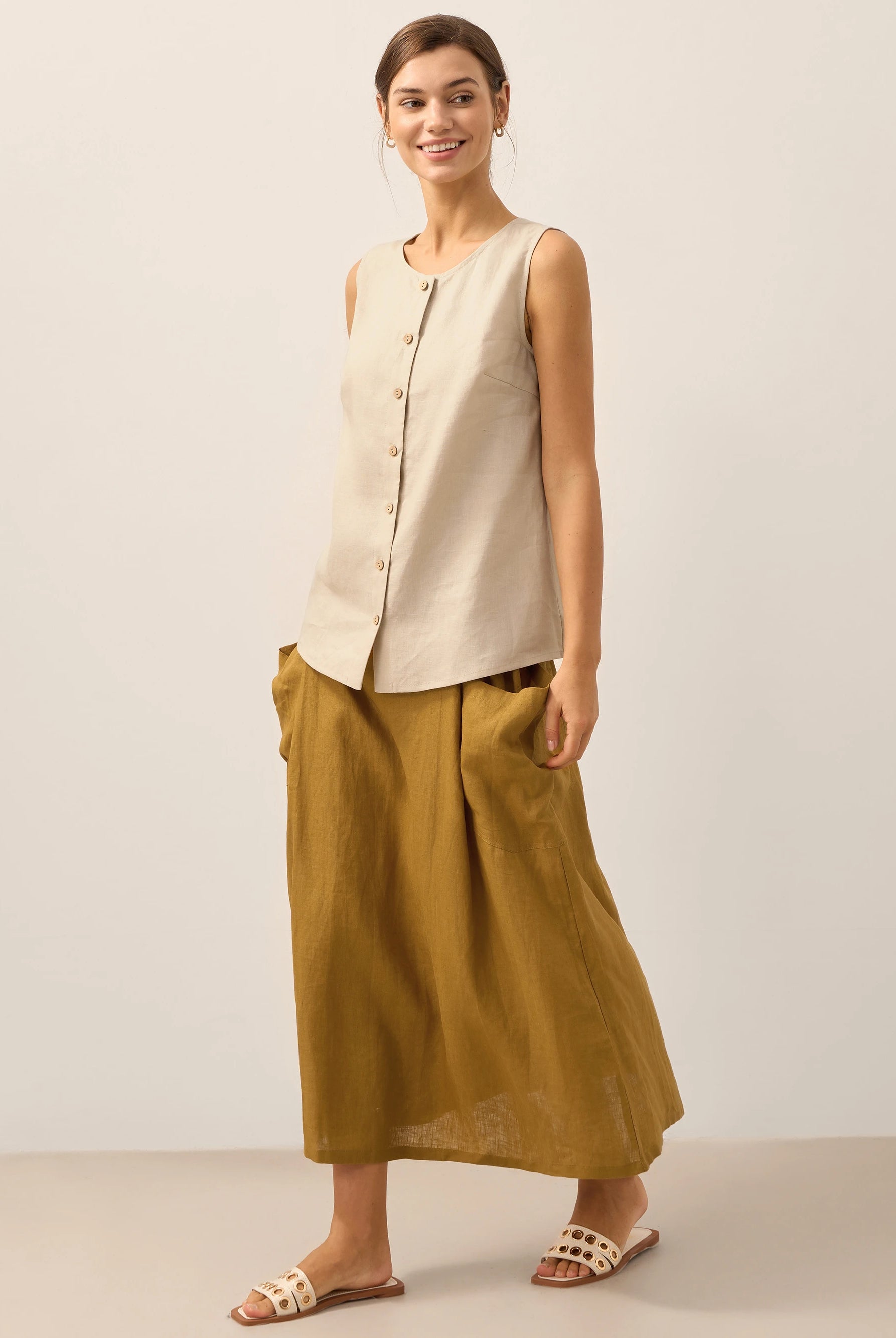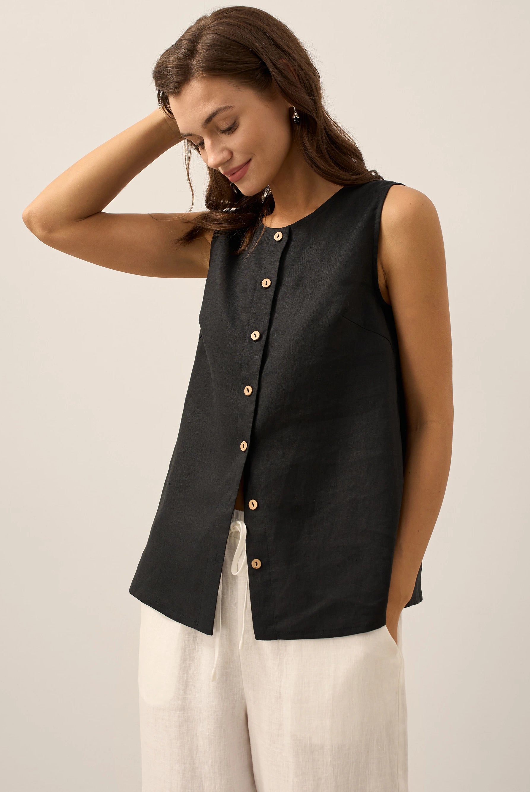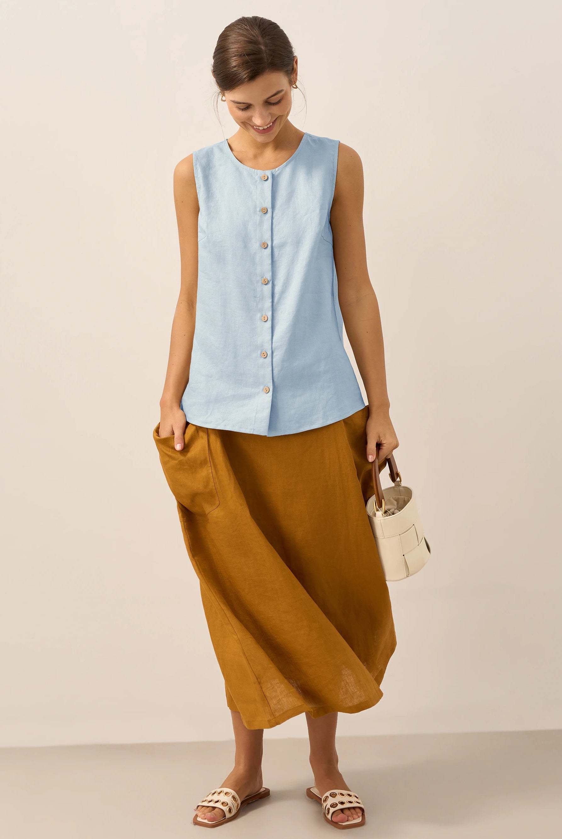 This eco-friendly checked linen top is a true gem, soft and breathable, with an incredibly flattering empire-line fit. I love the press-stud front, and it looks great with jeans, white pants, or even shorts in summer. Truly a timeless, sustainable piece!