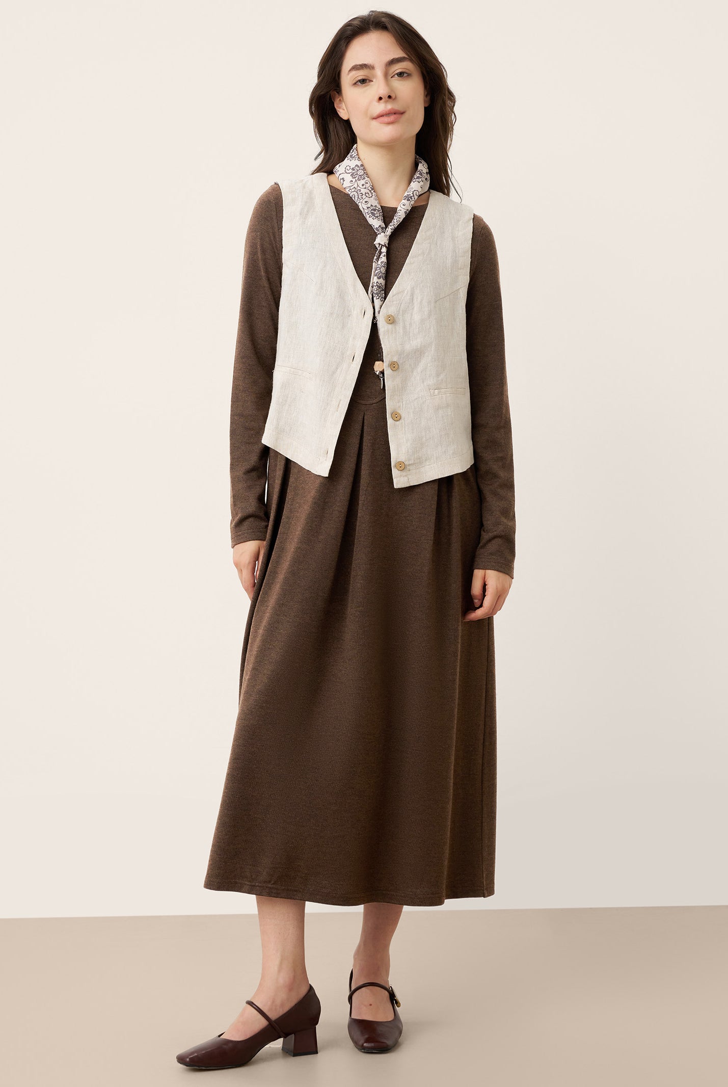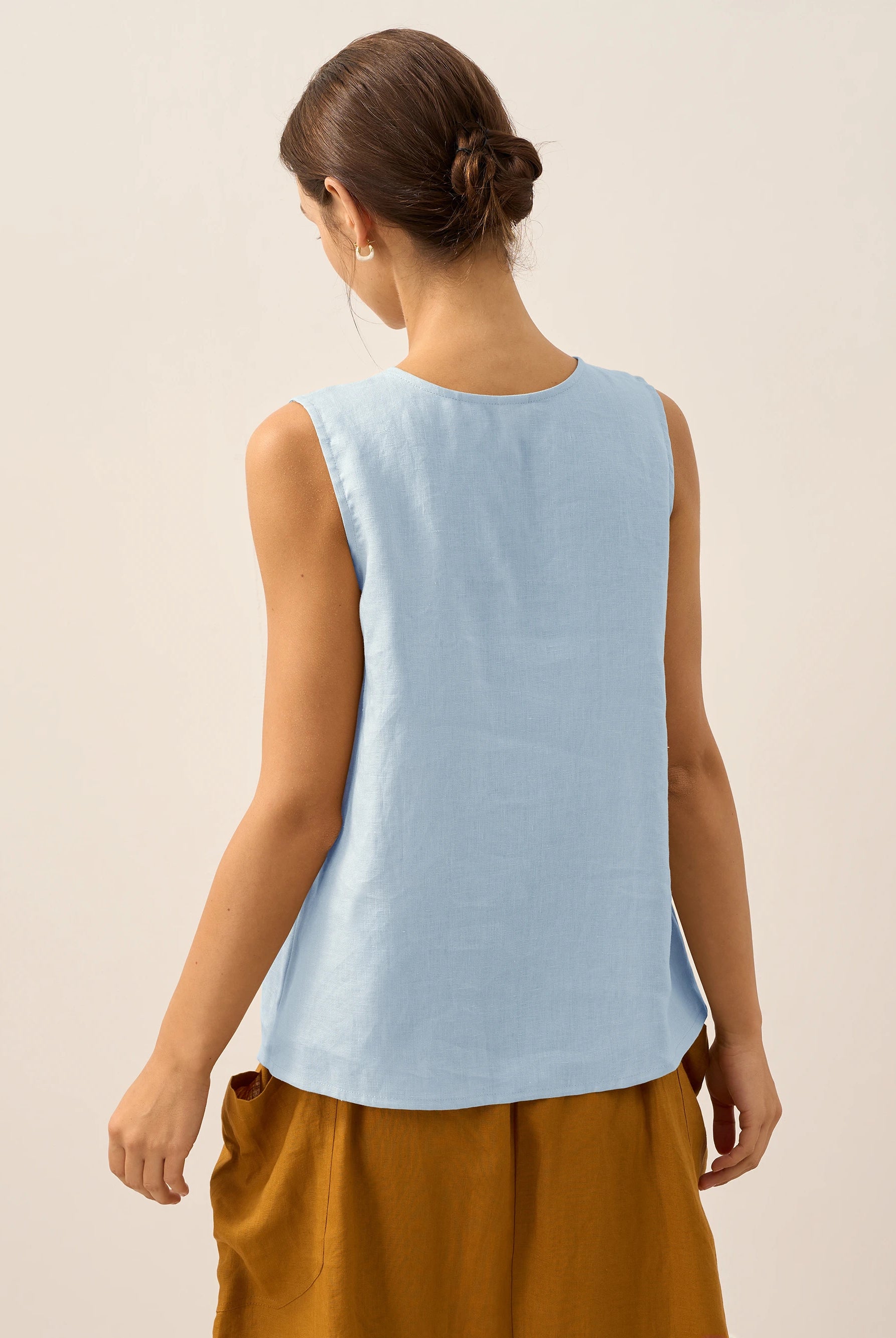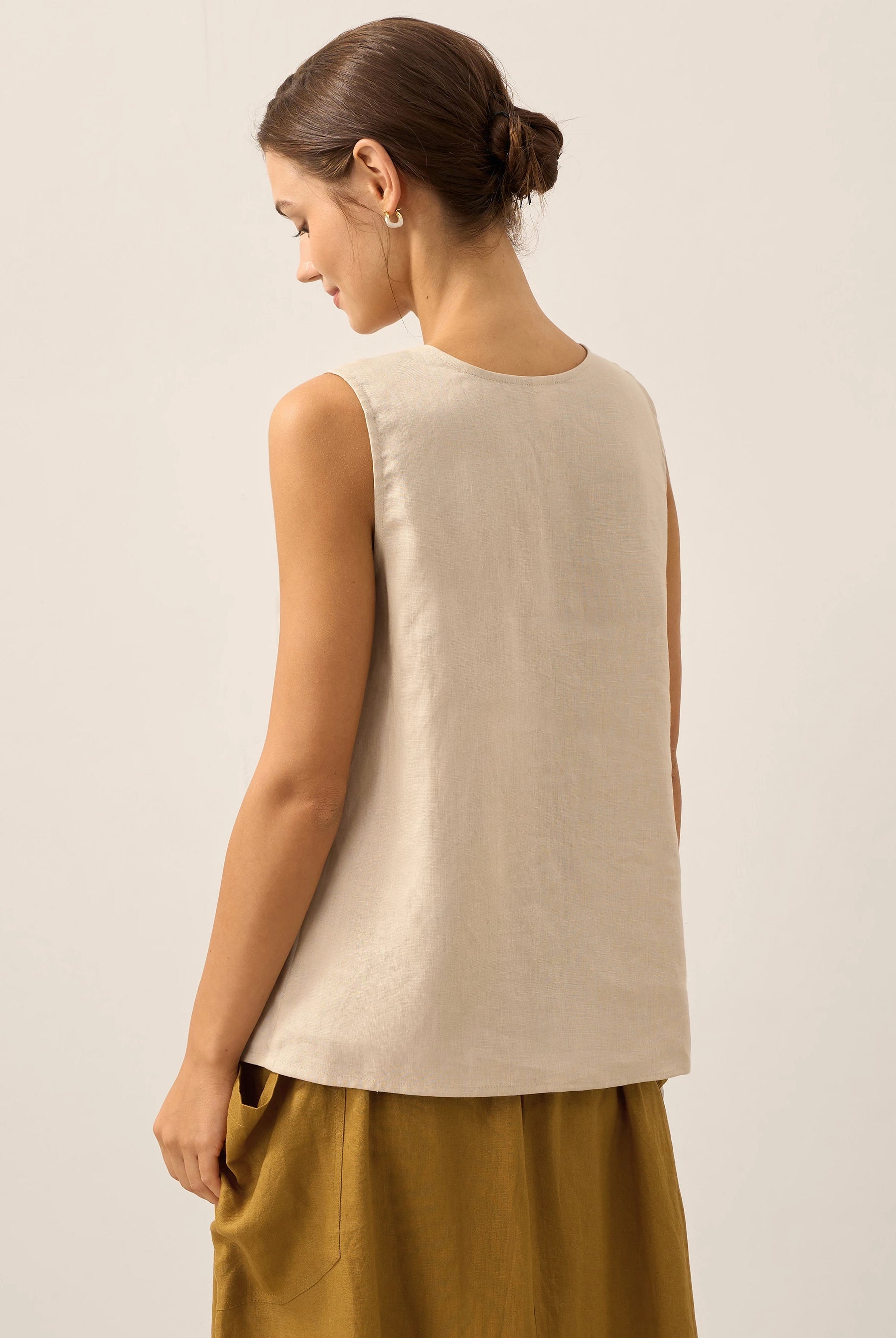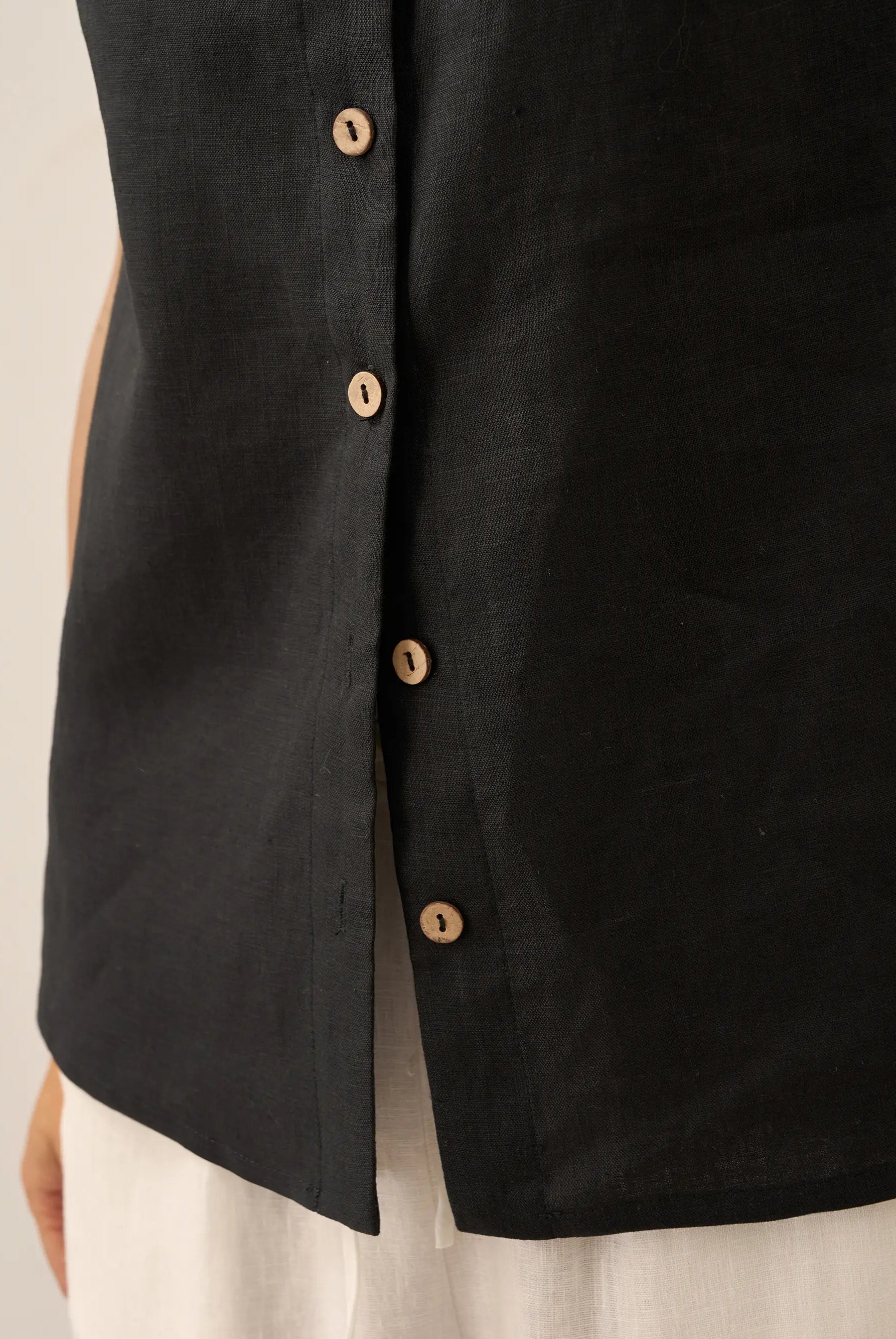 This eco-friendly checked linen top is a true gem, soft and breathable, with an incredibly flattering empire-line fit. I love the press-stud front, and it looks great with jeans, white pants, or even shorts in summer. Truly a timeless, sustainable piece!