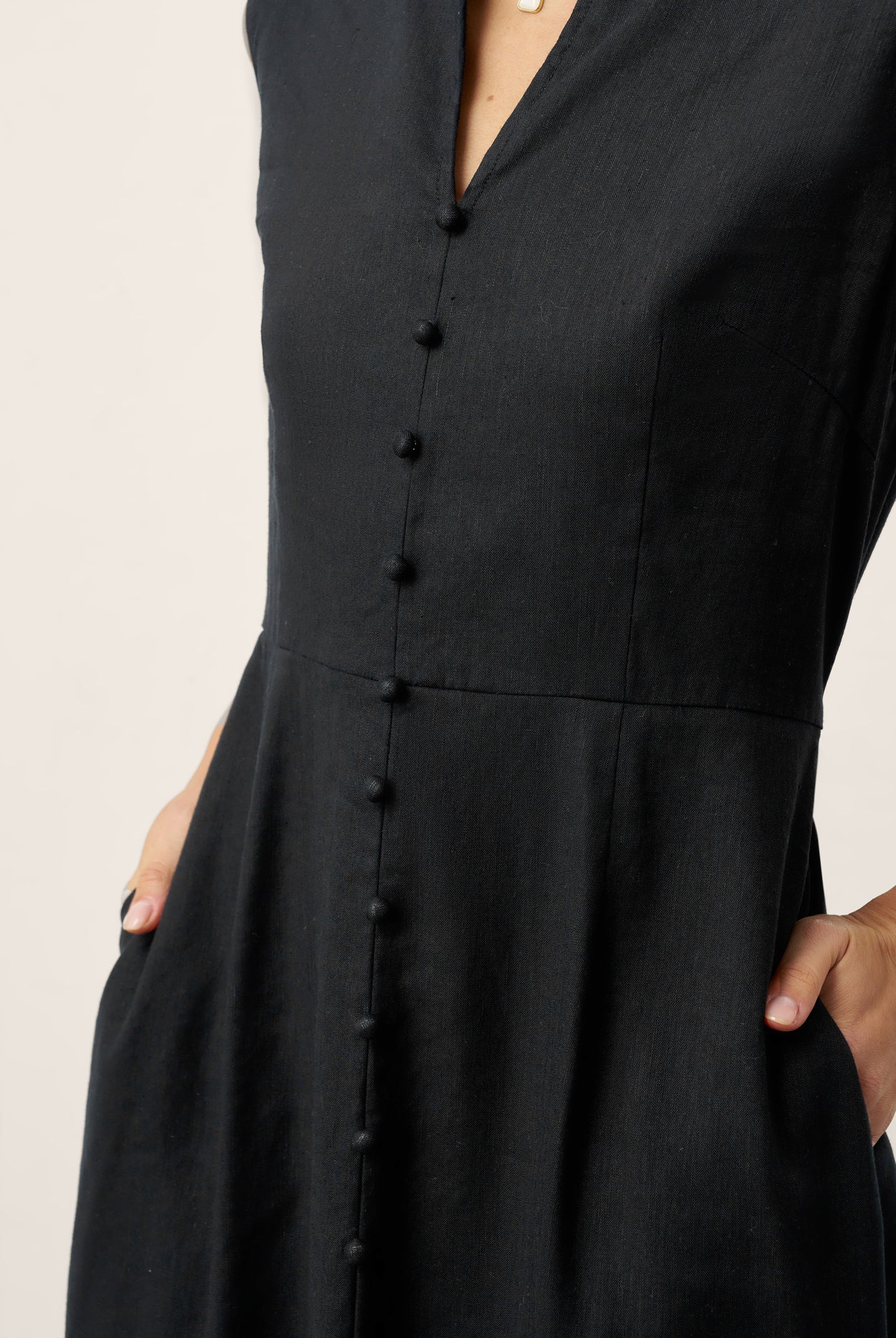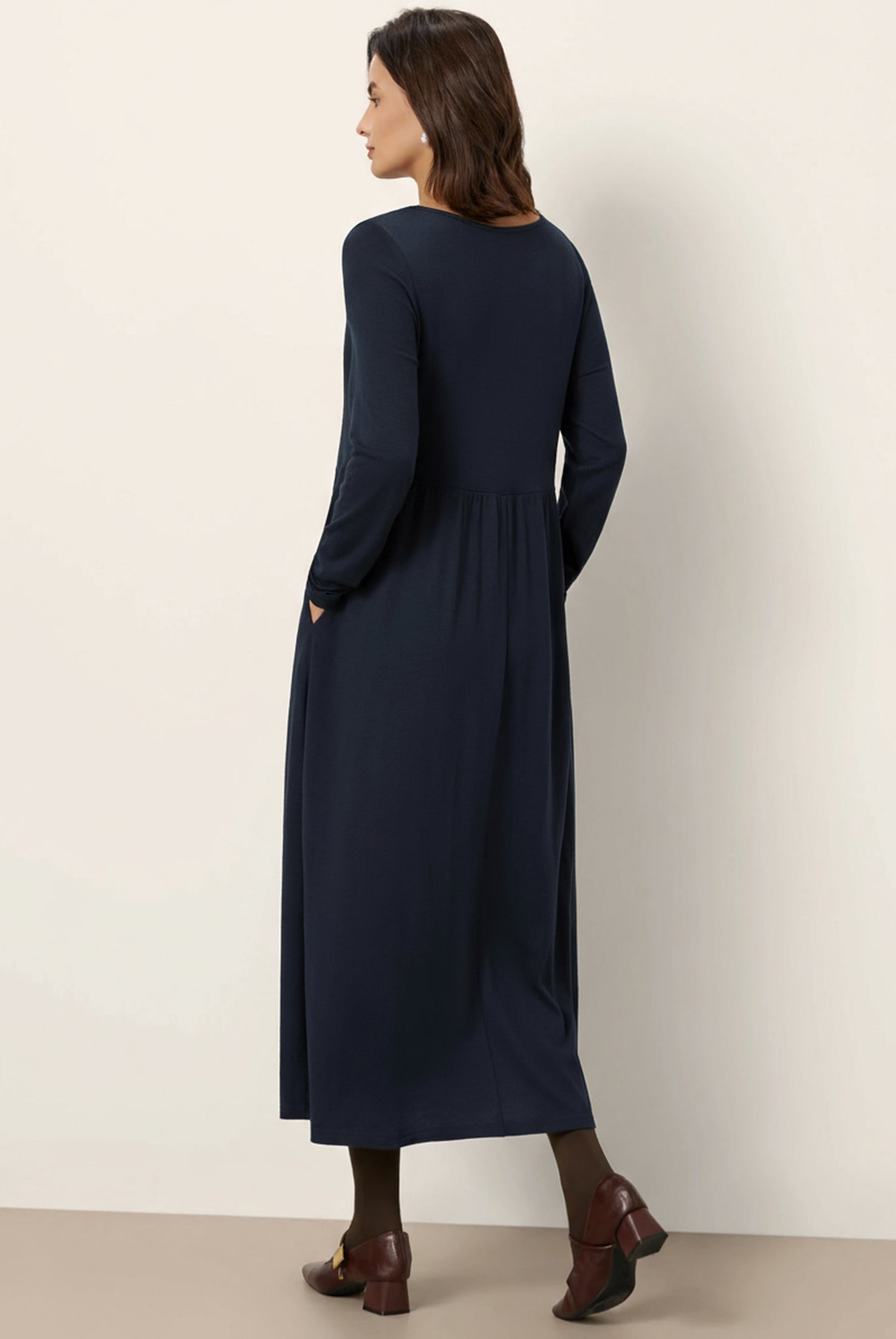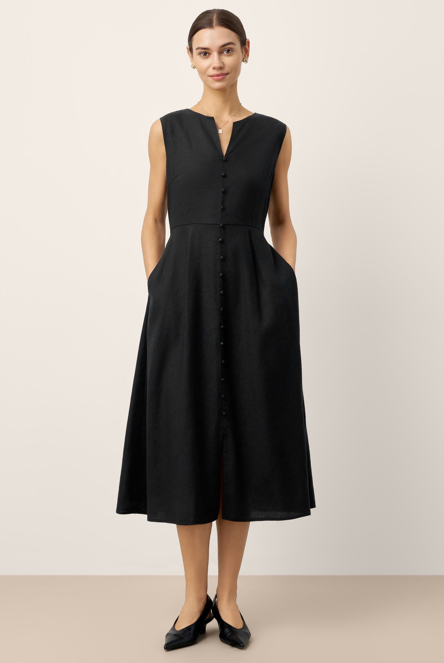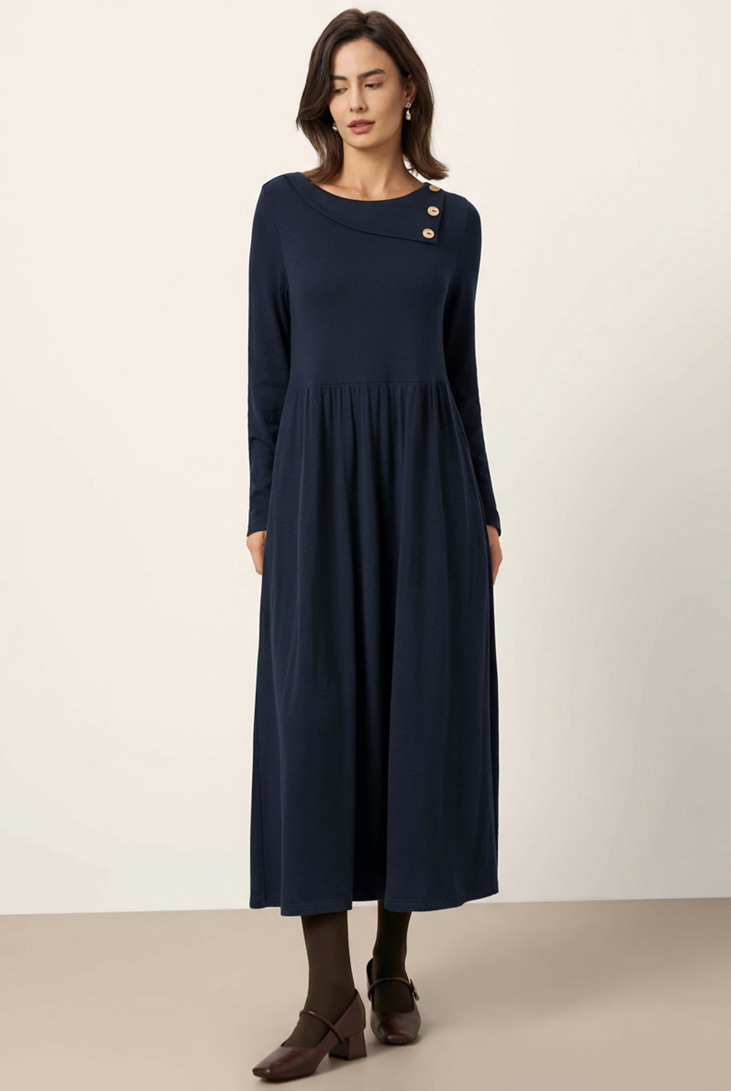 Love this dress the moment I tried it on. The fabric feels soft and breathable, perfect for warm days, and the white trim gives it a really clean, elegant look. The pockets are a nice surprise.