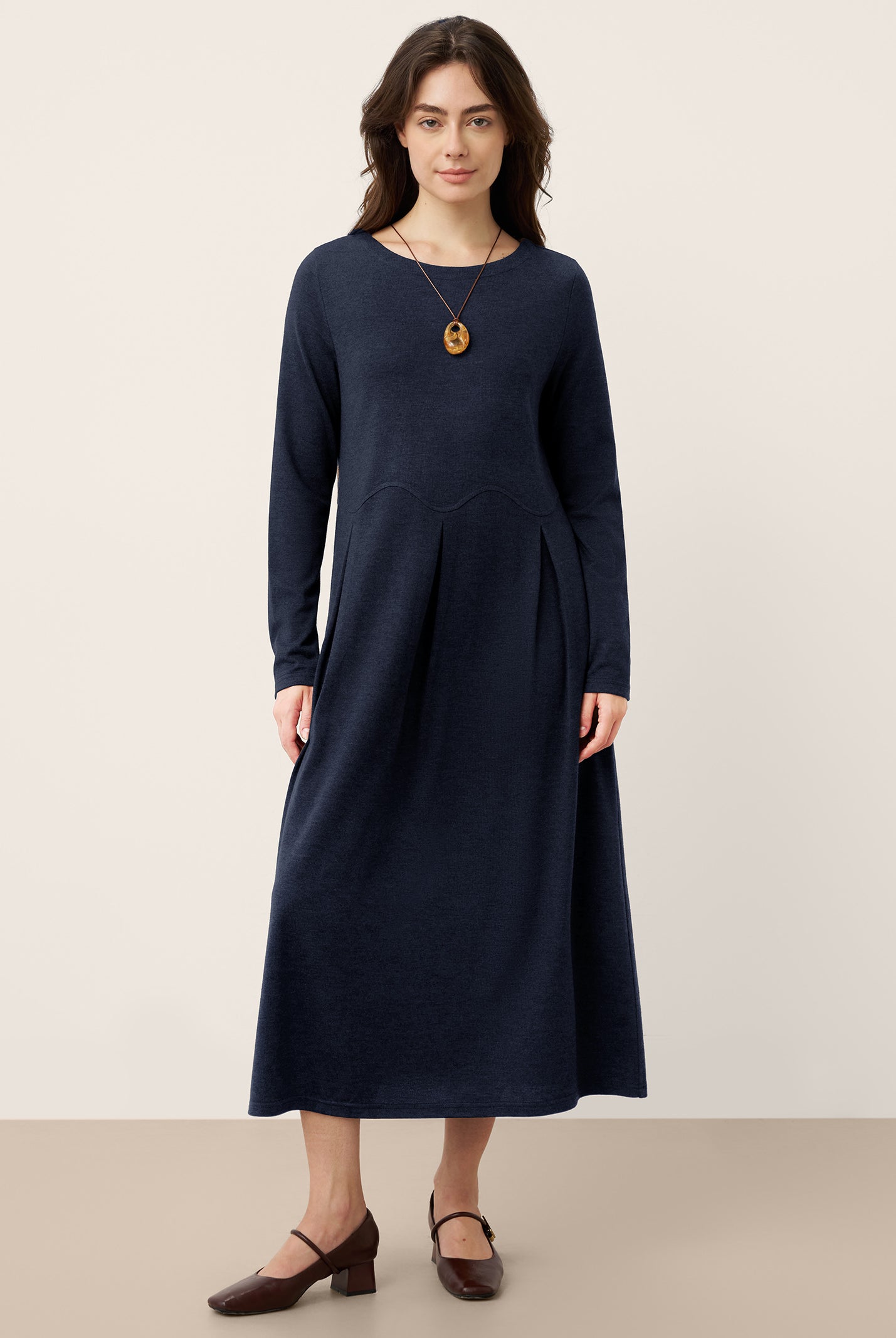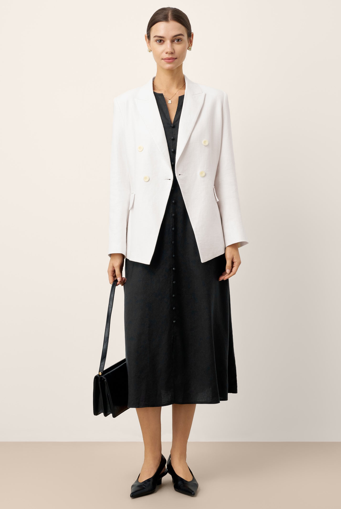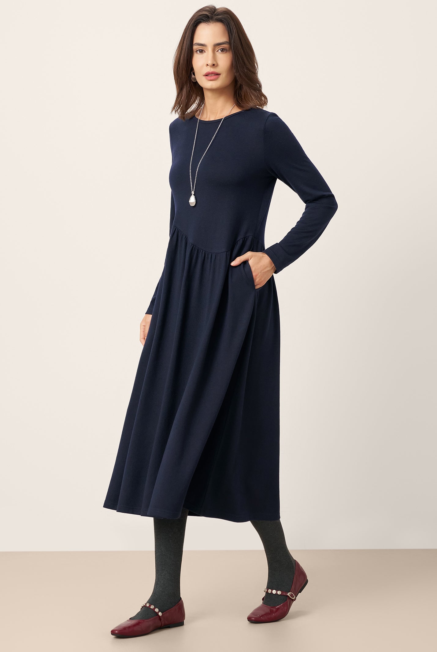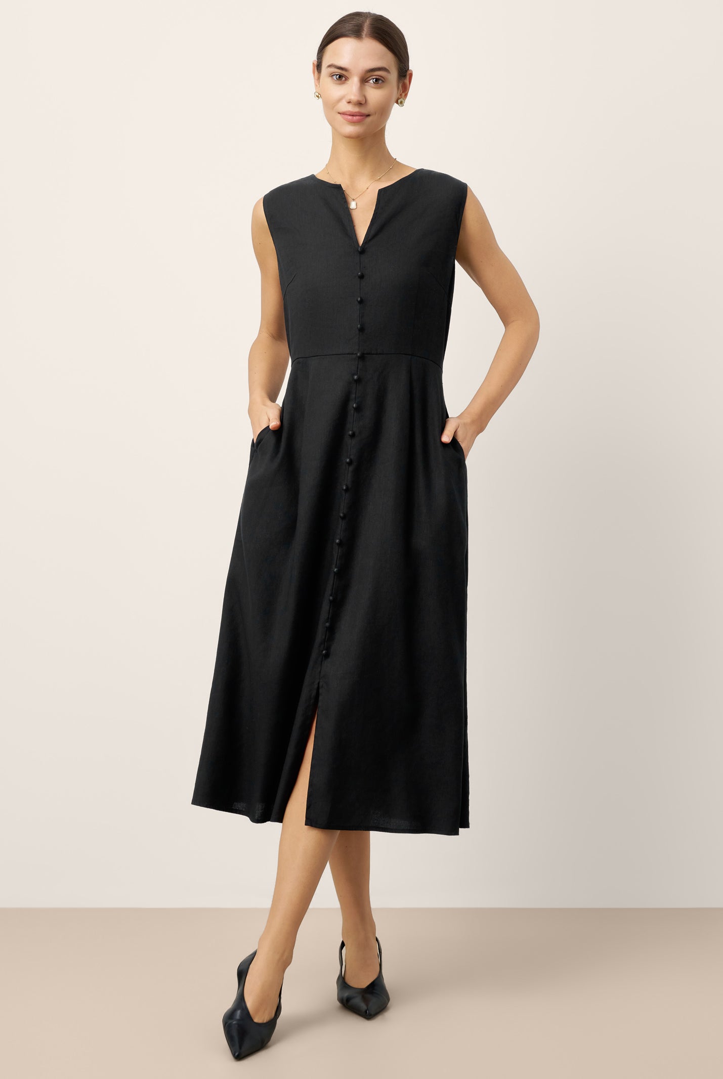 Love this dress the moment I tried it on. The fabric feels soft and breathable, perfect for warm days, and the white trim gives it a really clean, elegant look. The pockets are a nice surprise.