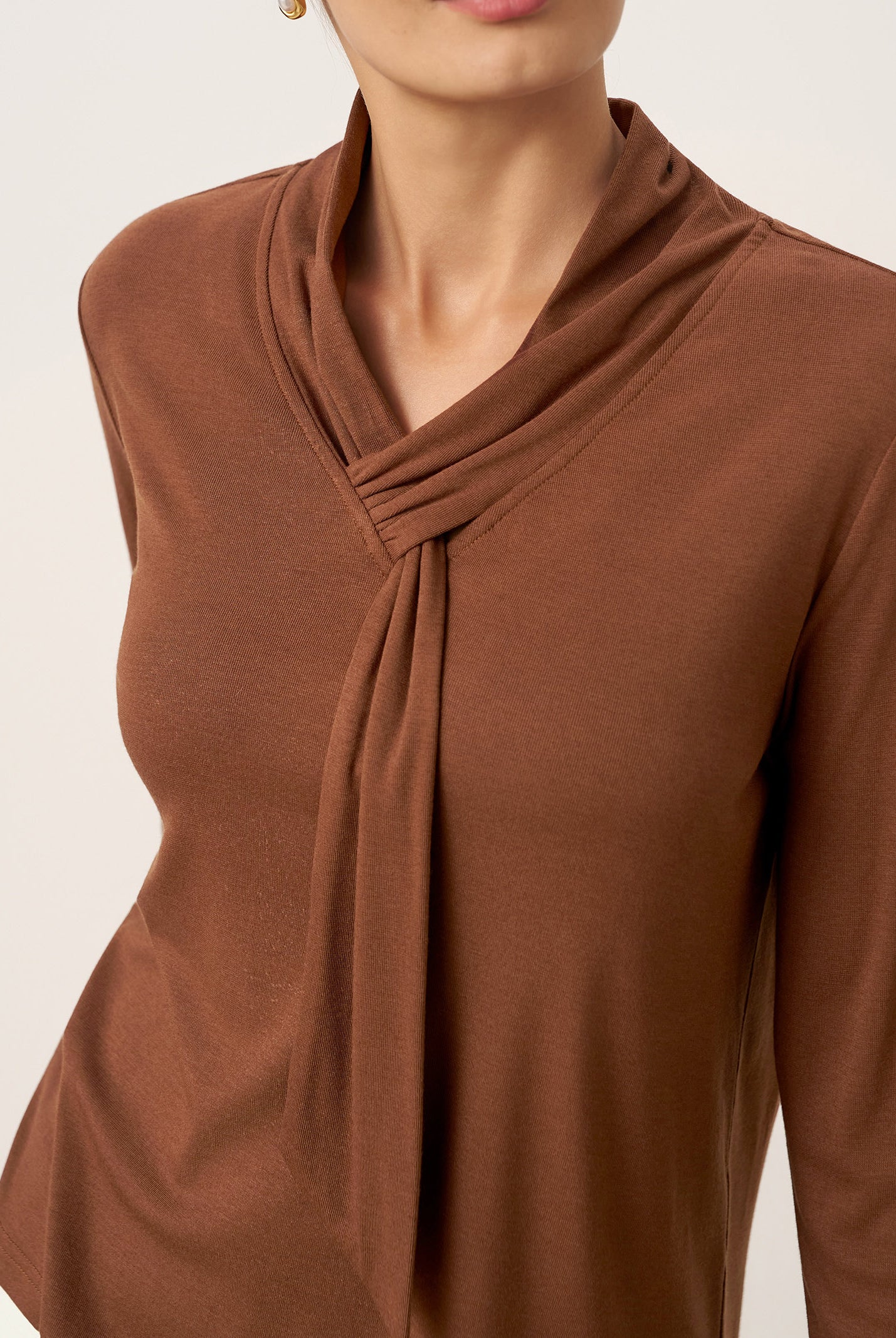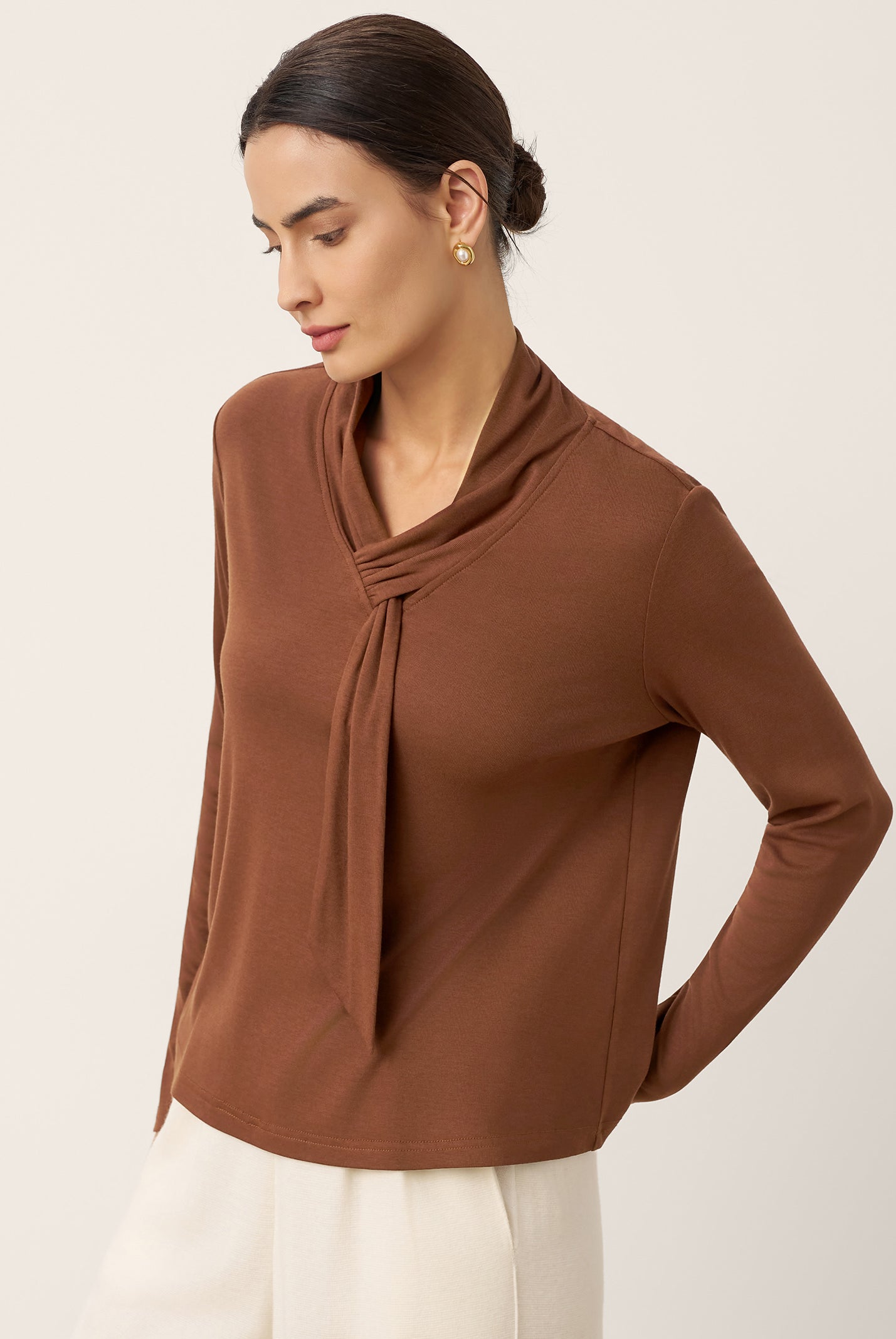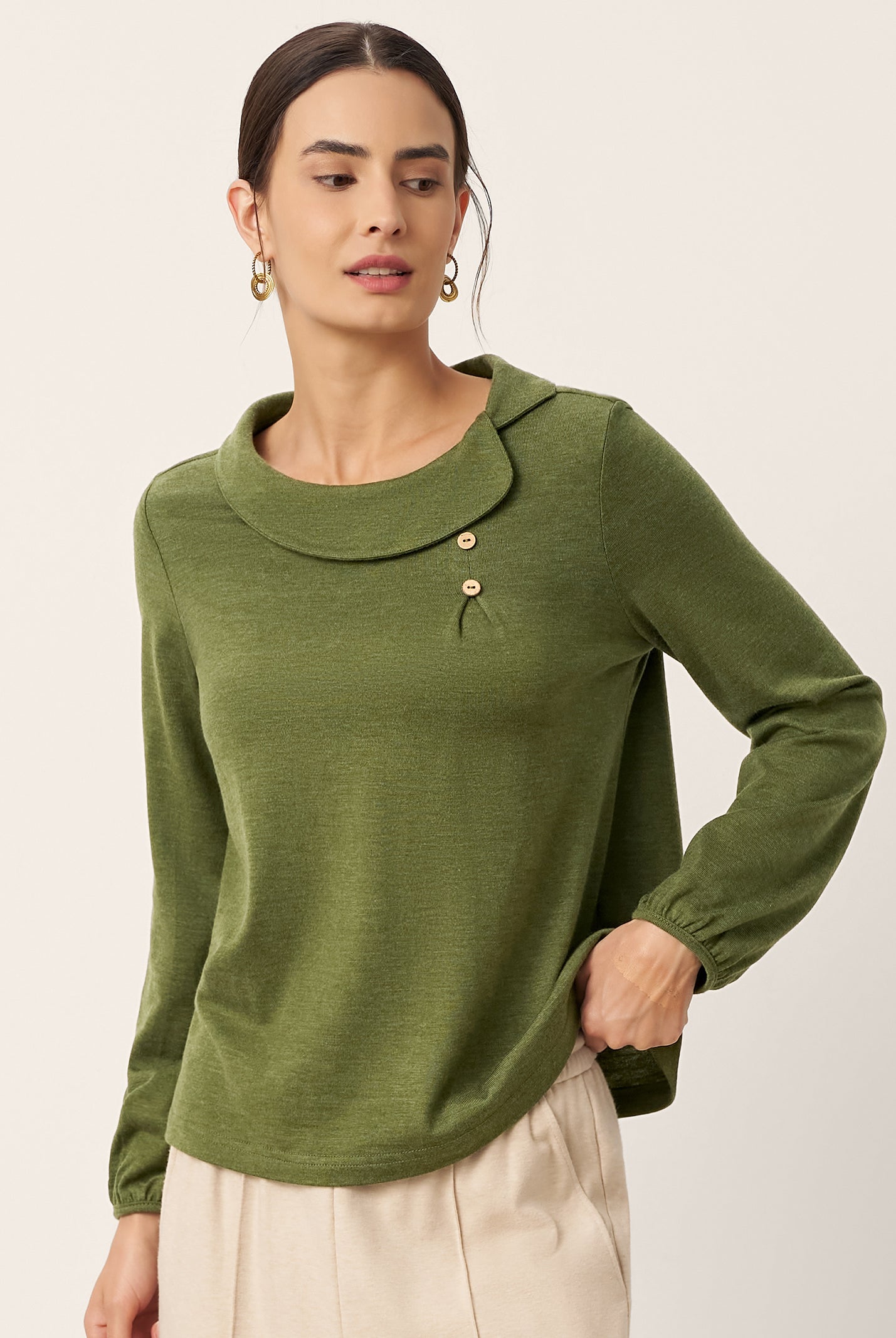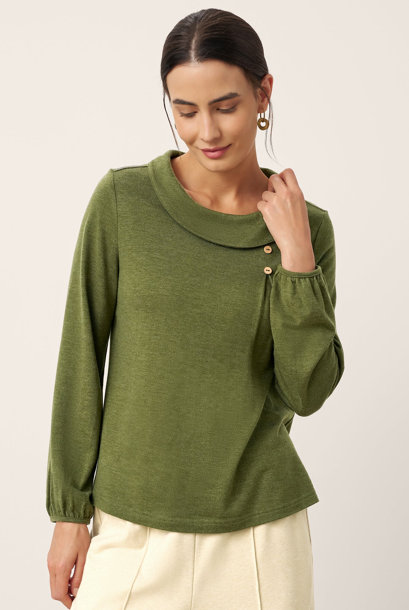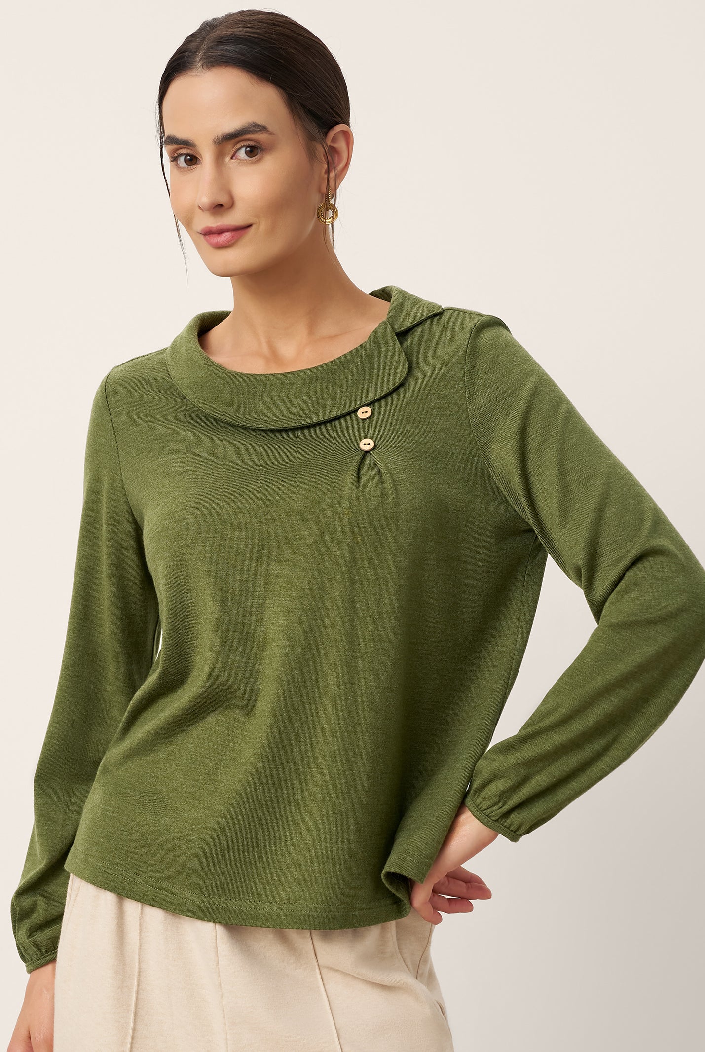 The cotton draped neck top is so comfortable and stylish. The A line fit flatters my figure perfectly and the long sleeves are great for cooler days. I get compliments every time I wear it and it pairs well with everything in my closet.