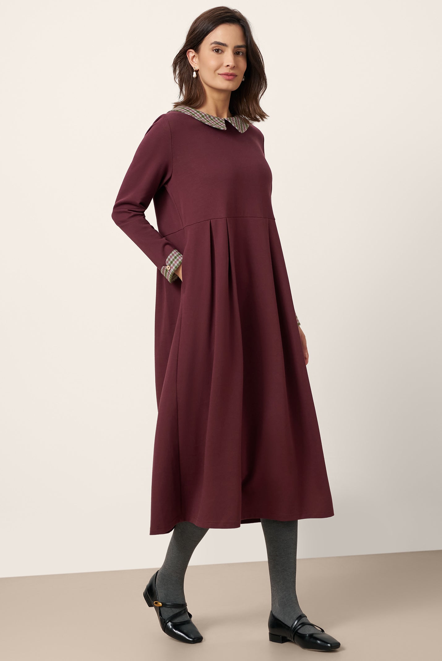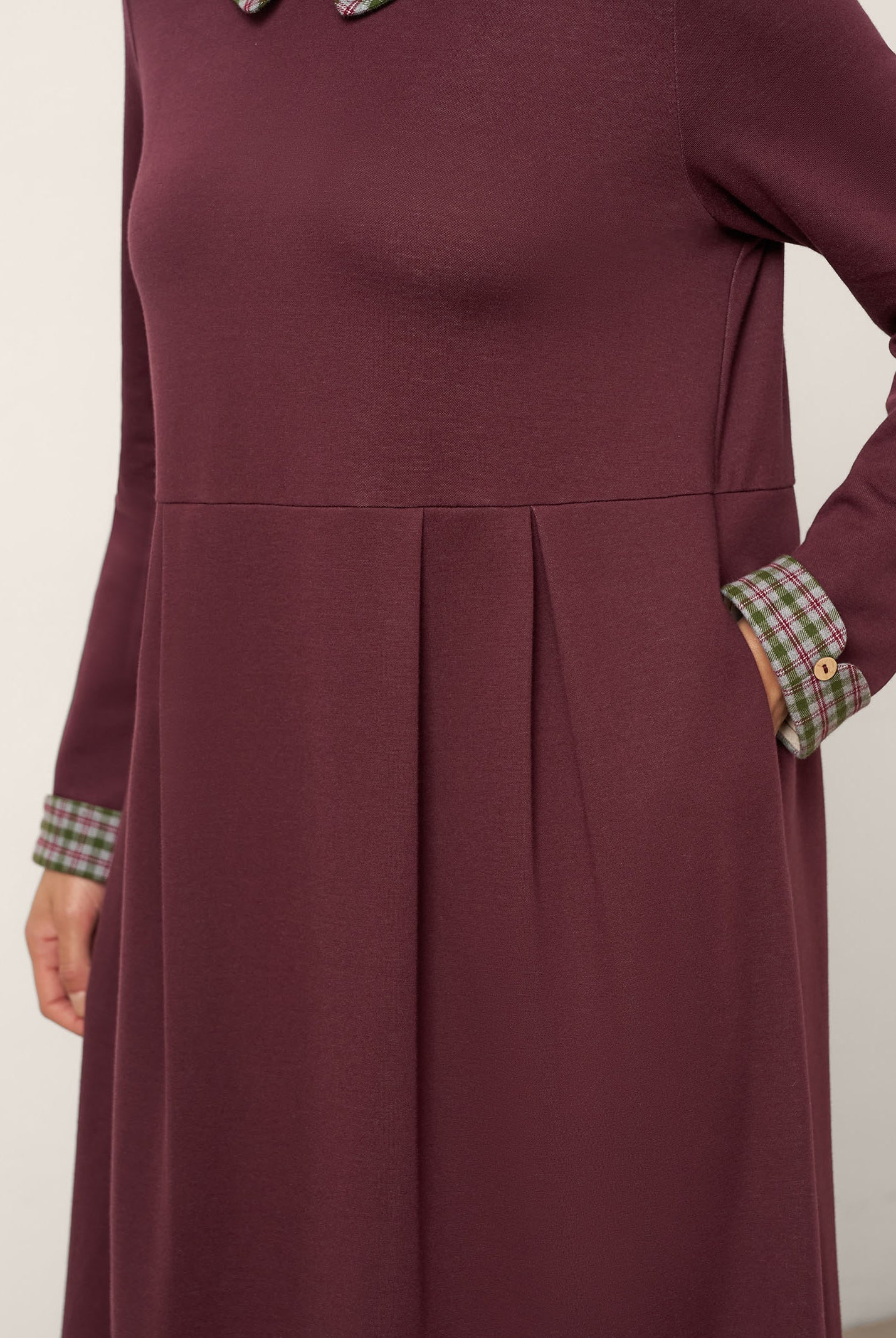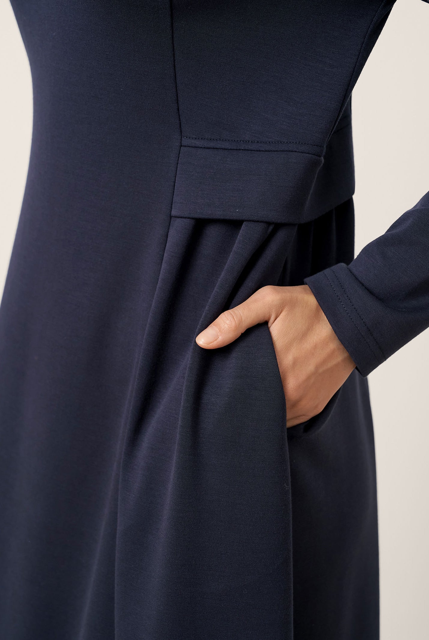 This is such a nice dress! The material is smooth and comfortable, and the fit is very flattering. The pleat detail is a subtle but stylish feature that makes it perfect.