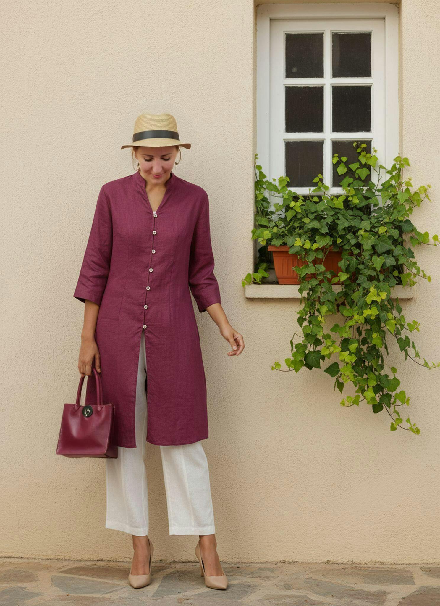 The linen top is super comfy and breathable, perfect for warm days. Hand buttons add a cute detail, fit true to size, and look great in skirts. Love it!