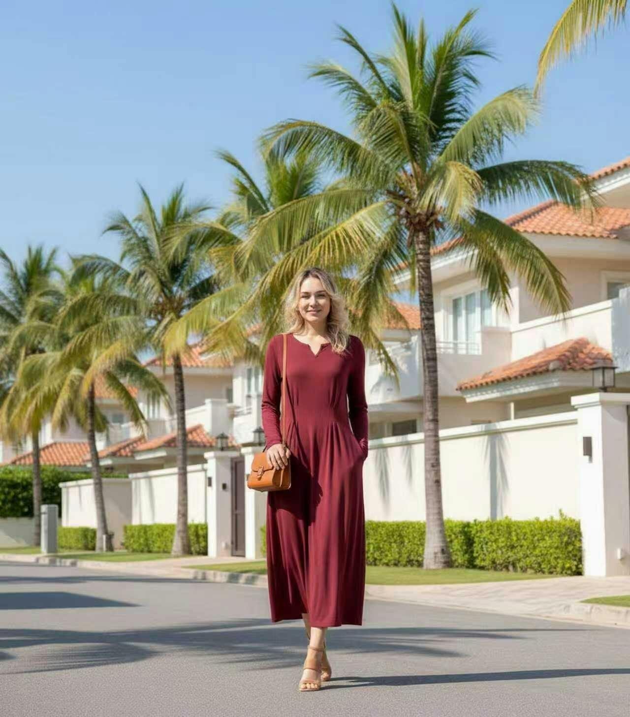 Such a lovely dress! The pleats fall nicely and the length is perfect for my height. The V neck flatters my figure and the material is breathable. Wore it to a party and received so many positive comments. Happy with my purchase.