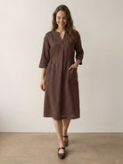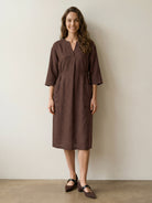 100% Linen V-neck Bell Pocket Midi Dress EVELINA