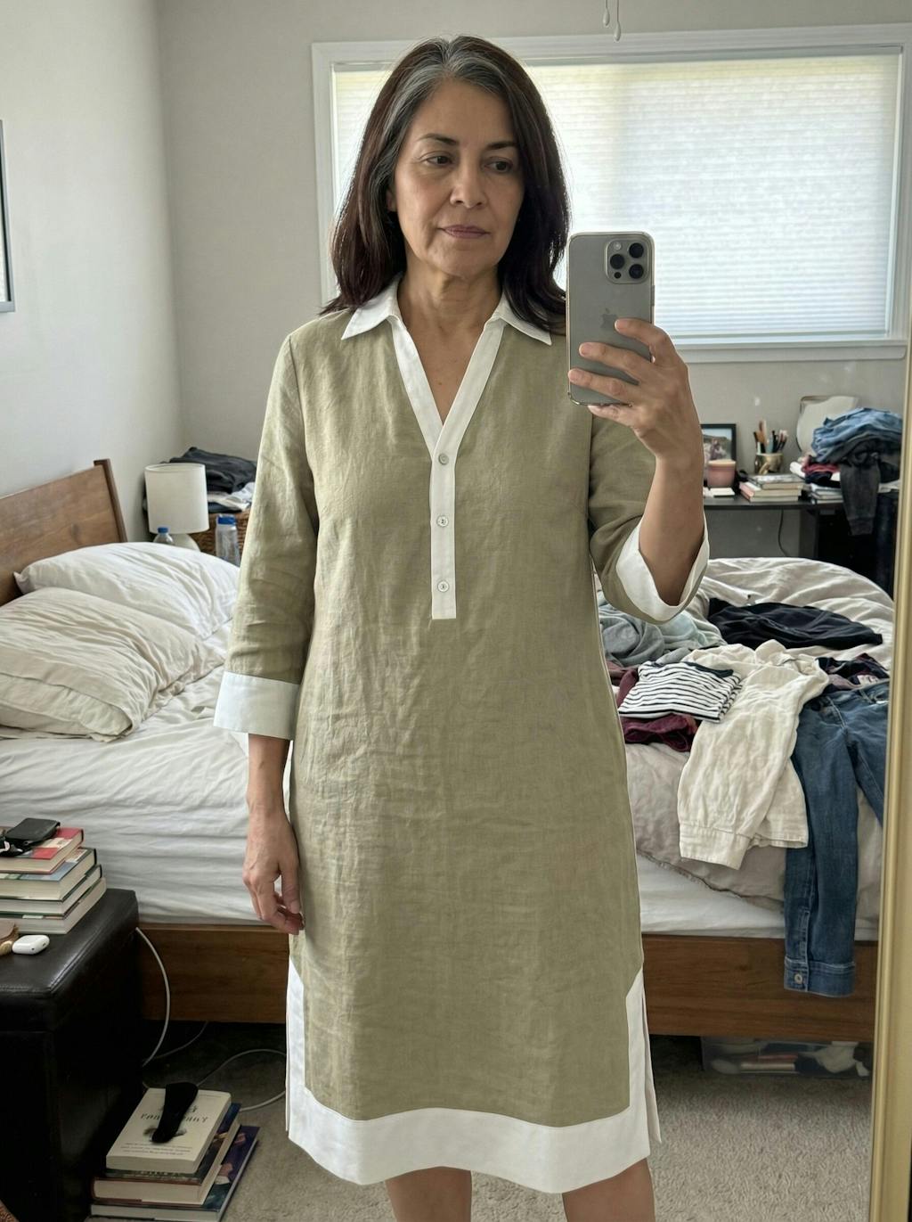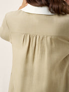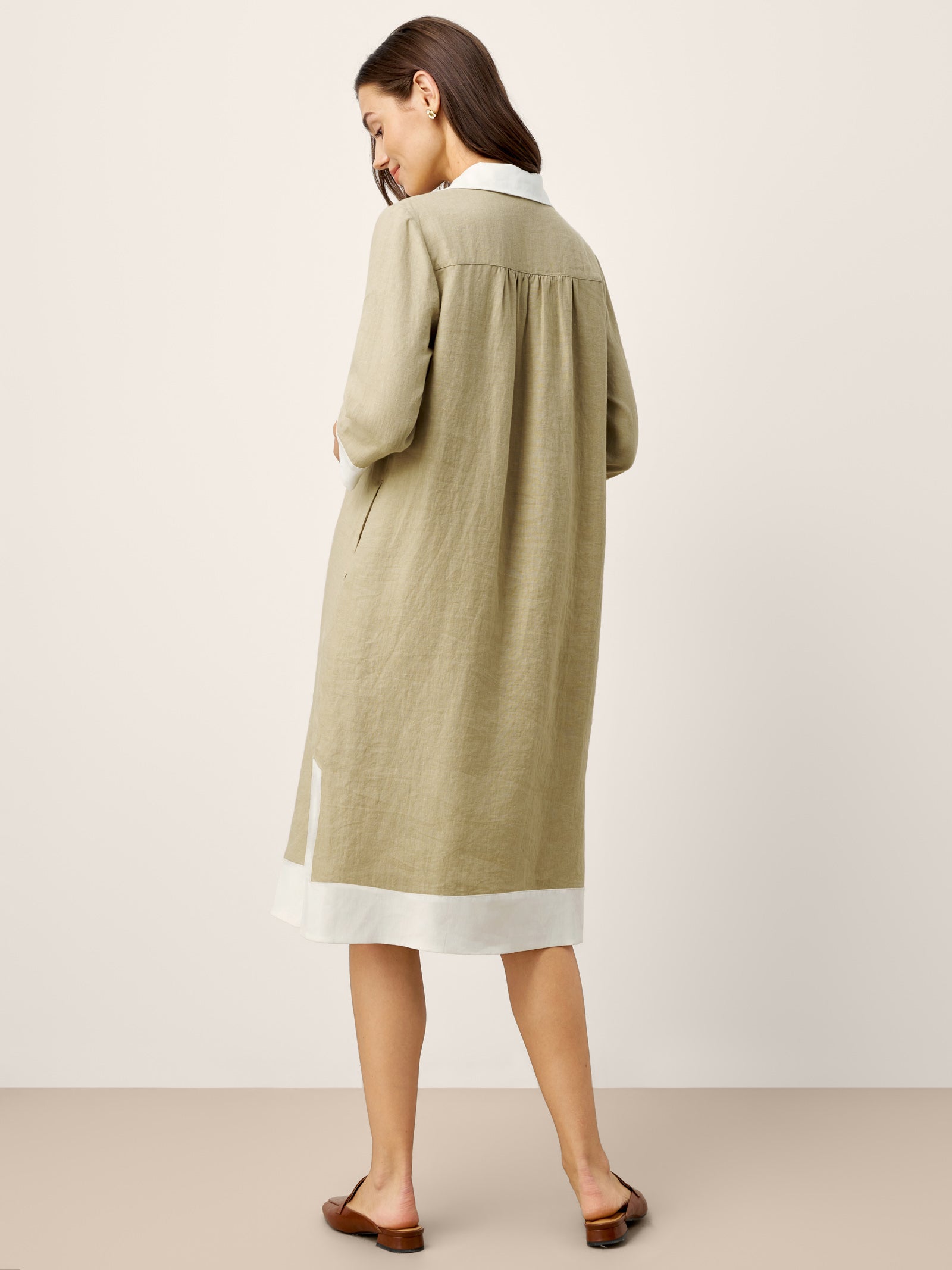 Lightweight linen flows over your figure in elegant ease, accented by crisp white trim and a V-placket neckline that sculpts and flatters.