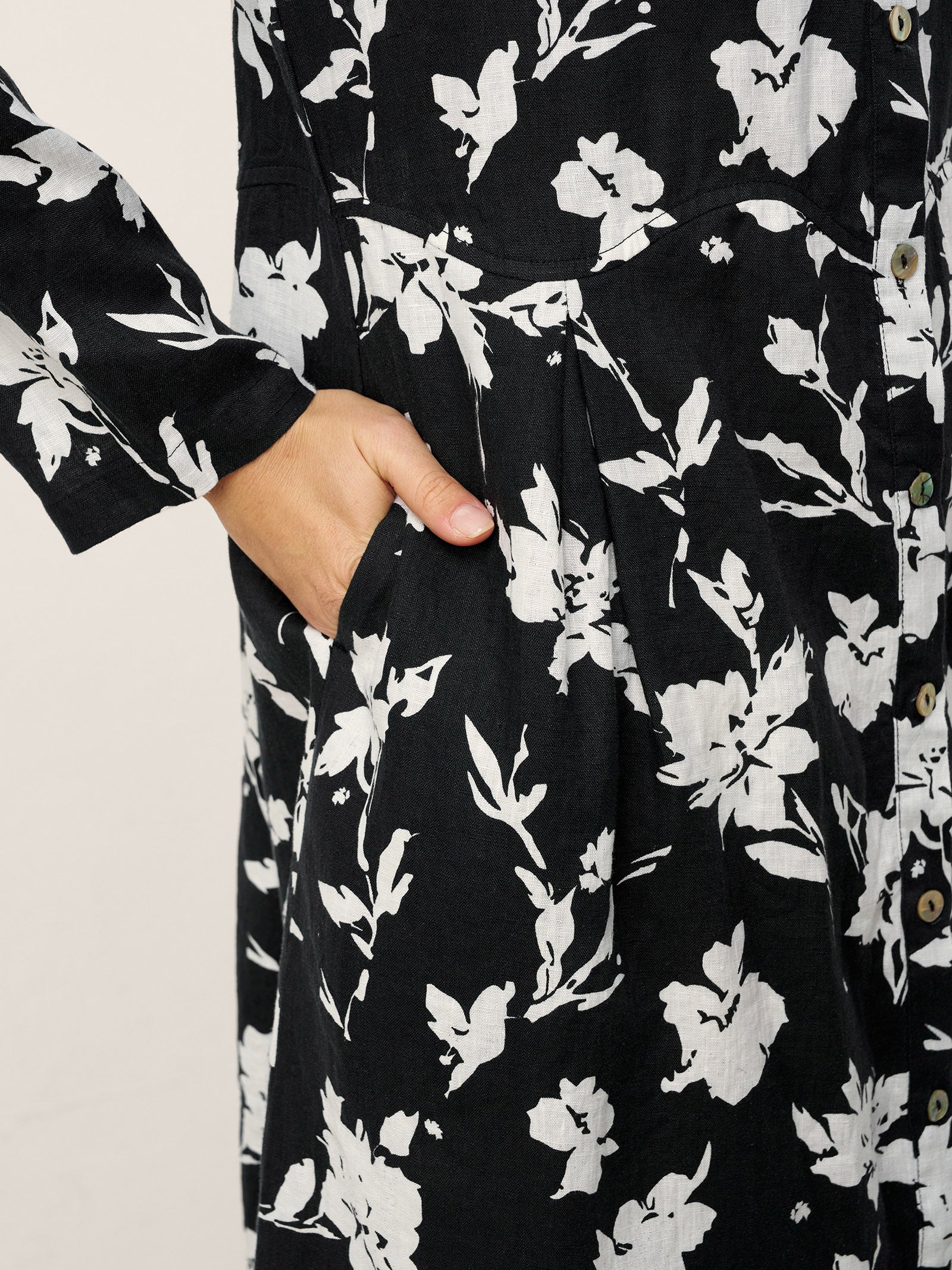 This 100% linen maxi dress brings effortless elegance to life with a high-contrast magnolia print and sculptural inverted pleats, offering breathable comfort and quiet confidence in every step.