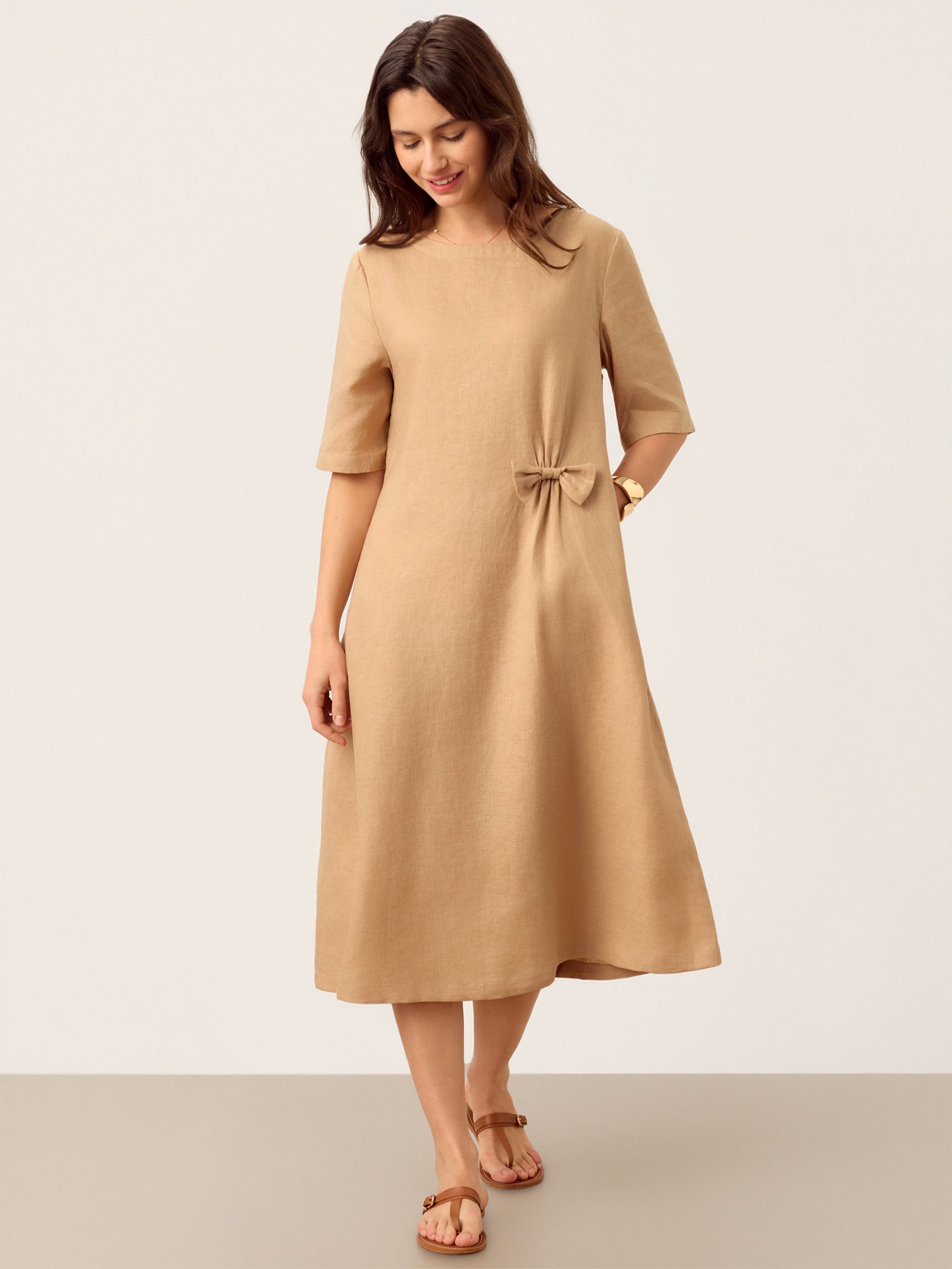 100% Linen Side-Gathered Bow Maxi Dress ESMERALDA