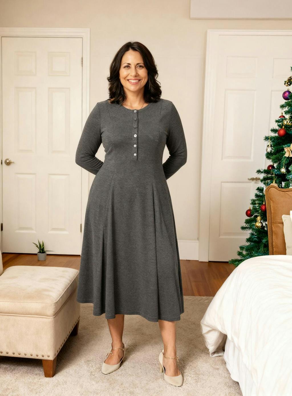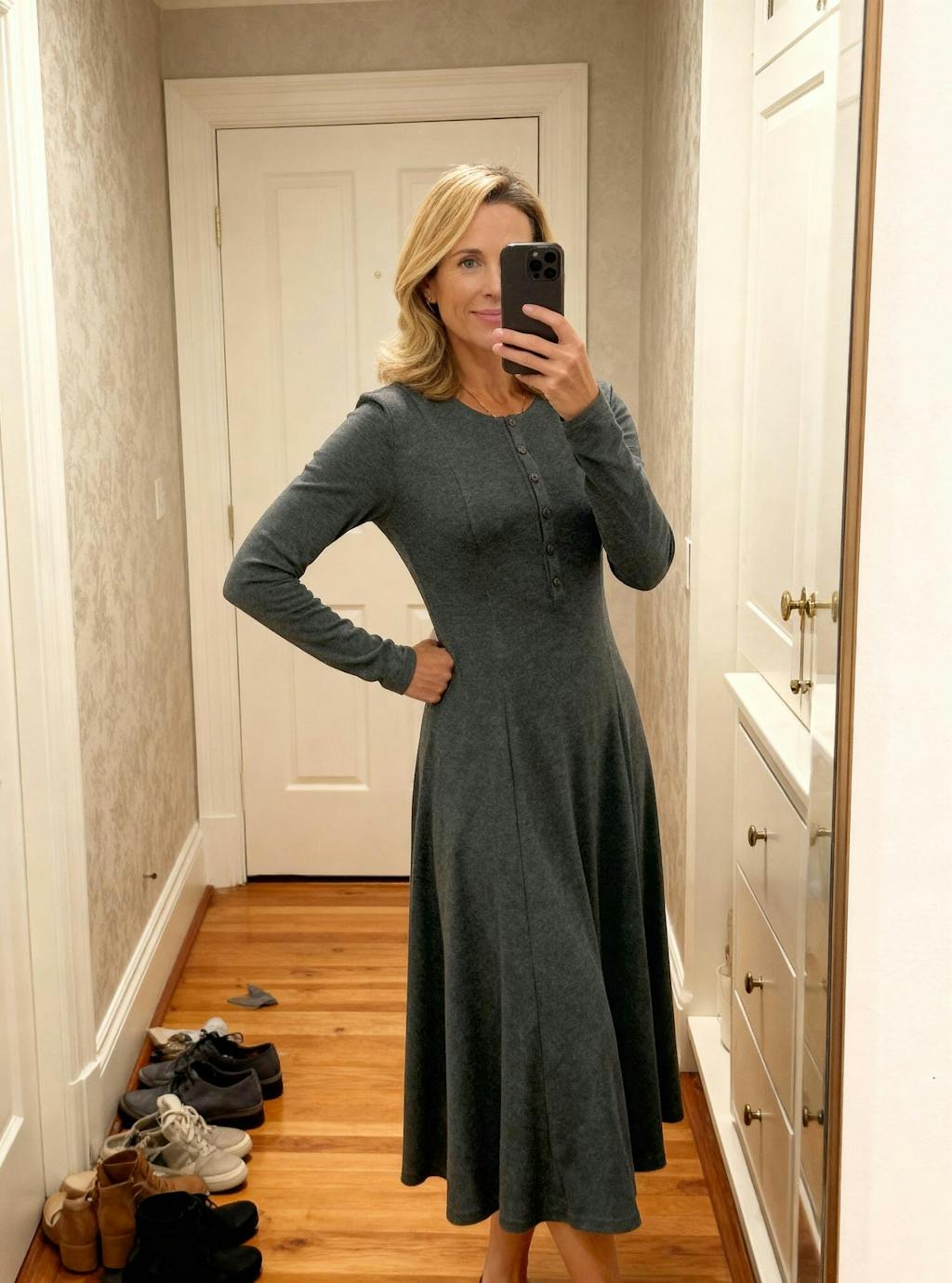 Drift through seasons with effortless sophistication in this charcoal grey cashmere maxi, where flowing gusset panels and luminous shell buttons craft an artfully draped silhouette designed for timeless grace and everyday luxury.