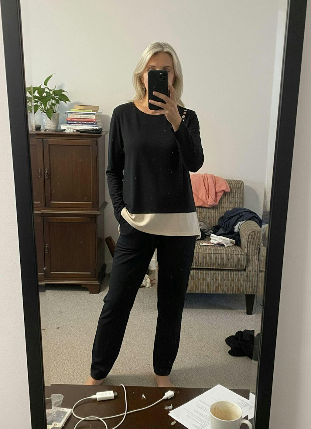 - False Layering: Black-and-cream split hem creates dimensional "two-piece" styling without added bulk