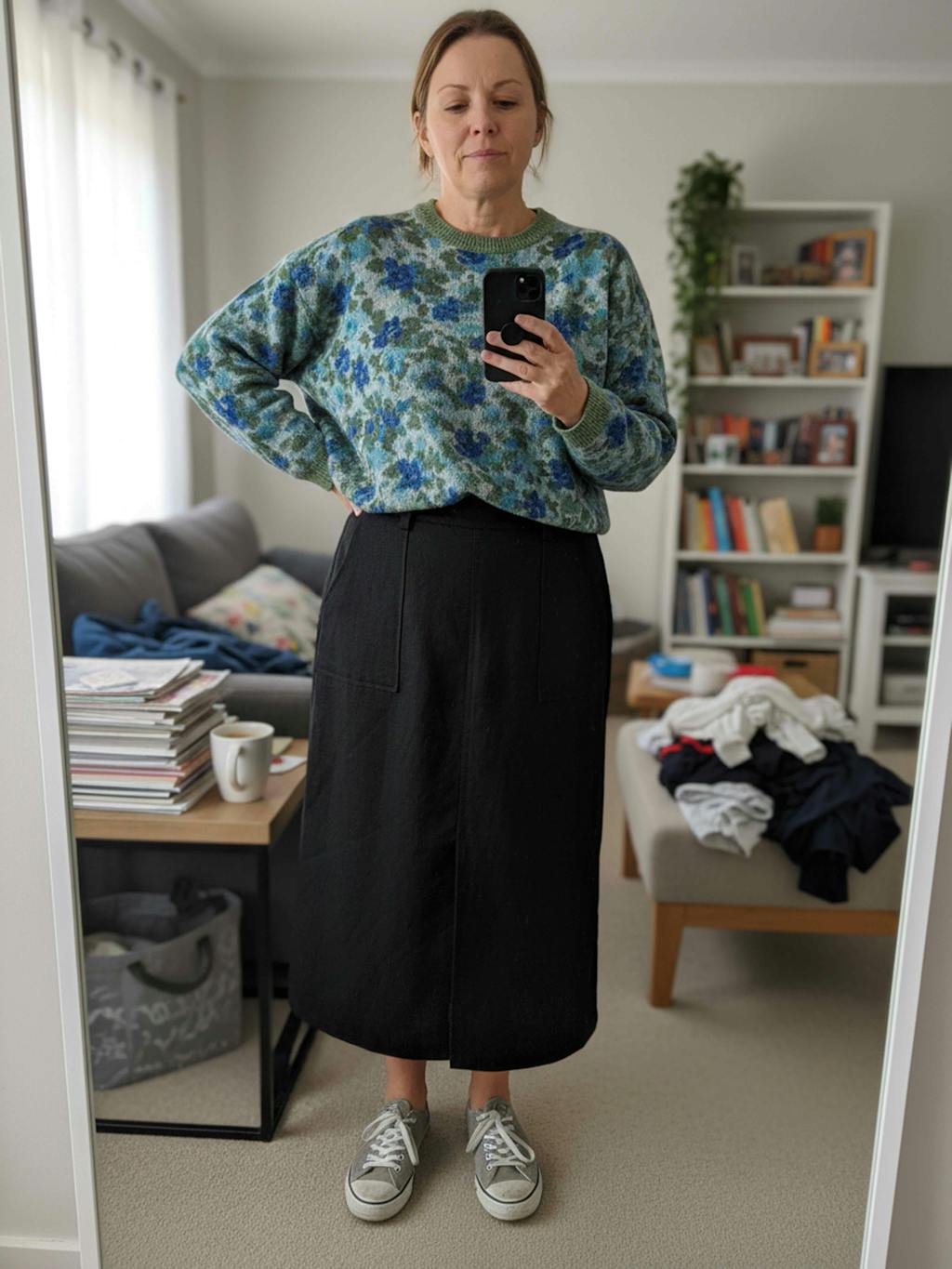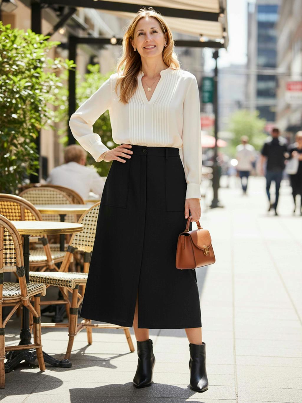 - Creative Workspace: Fitted turtleneck + block-heel ankle boots + structured satchel