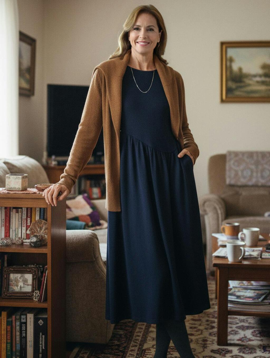 - Coastal Weekend Charm: Layer under cream cable-knit poncho + cognac knee-high boots + woven tote