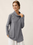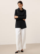A jersey top with asymmetric design elements combining diagonal stitching, button accents, and unexpected hem detailing. Ideal as a standalone piece or layered undergarment, offering year-round comfort and resilience.