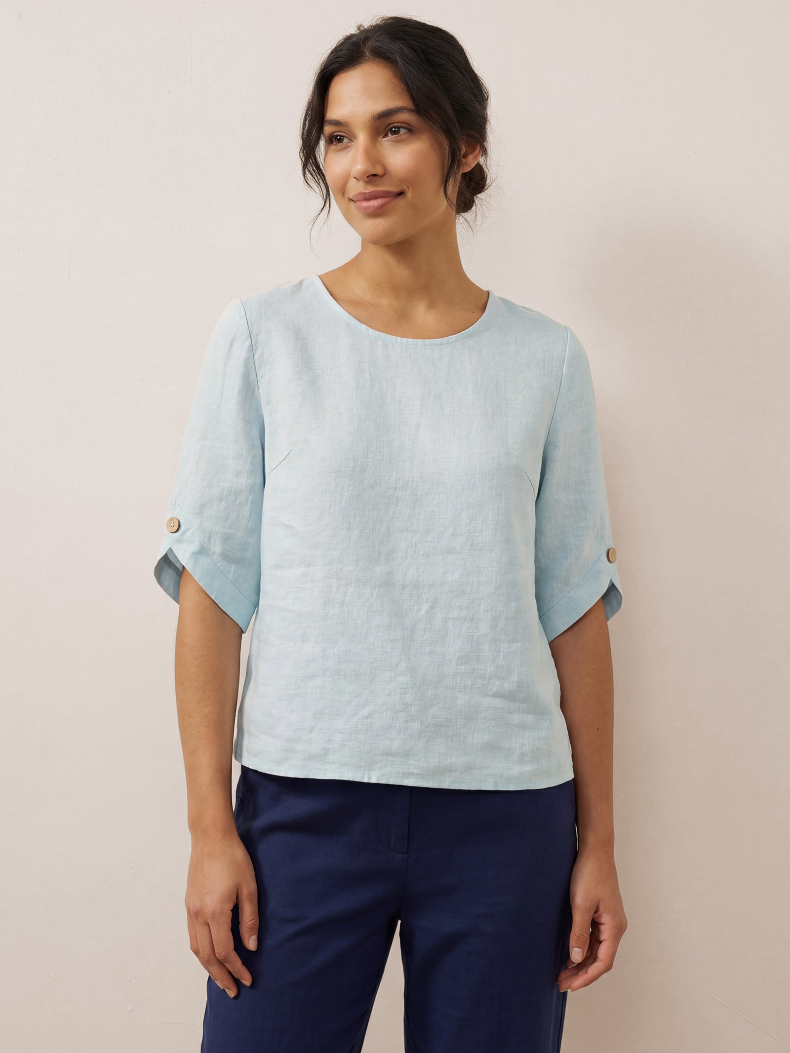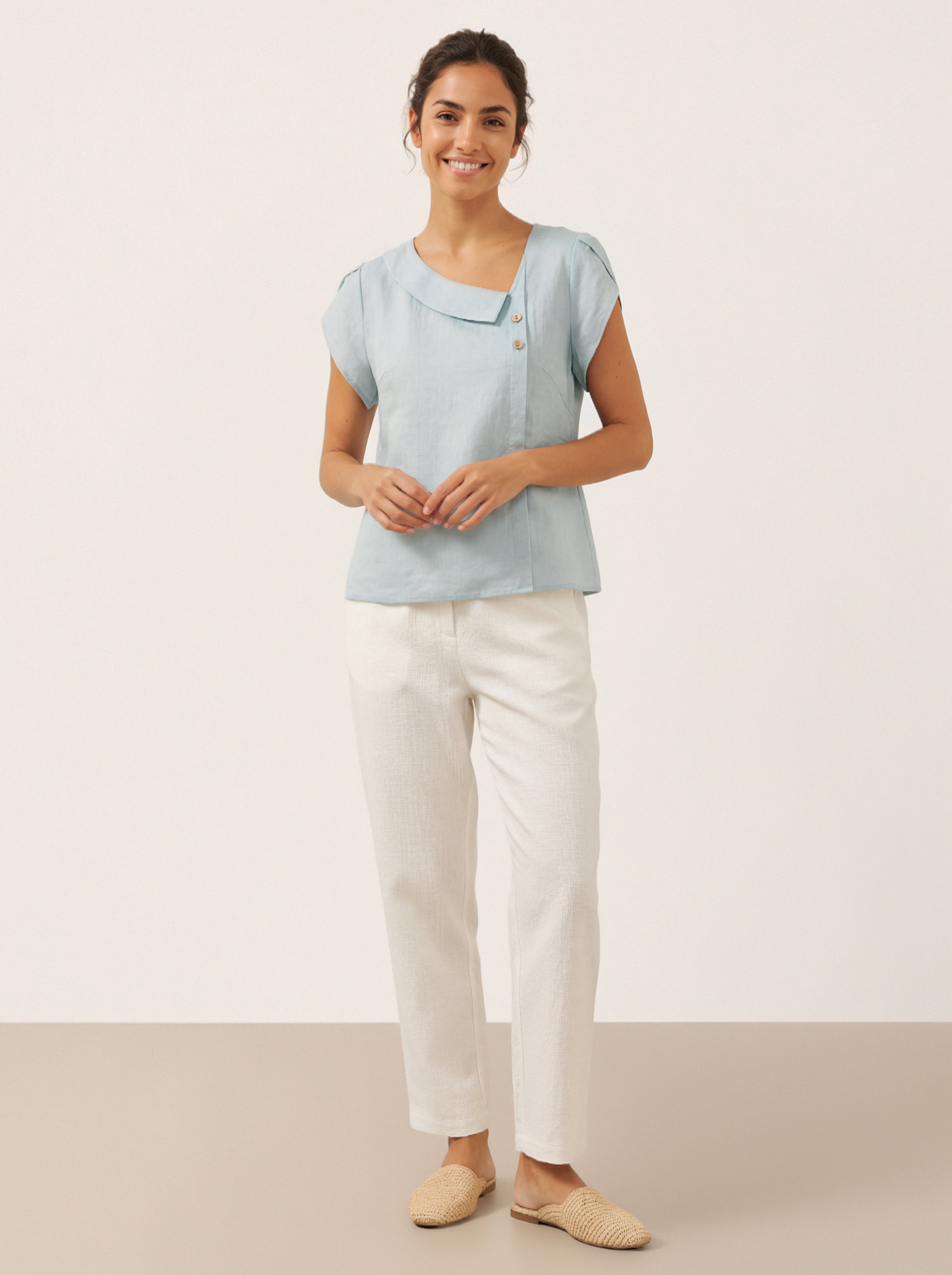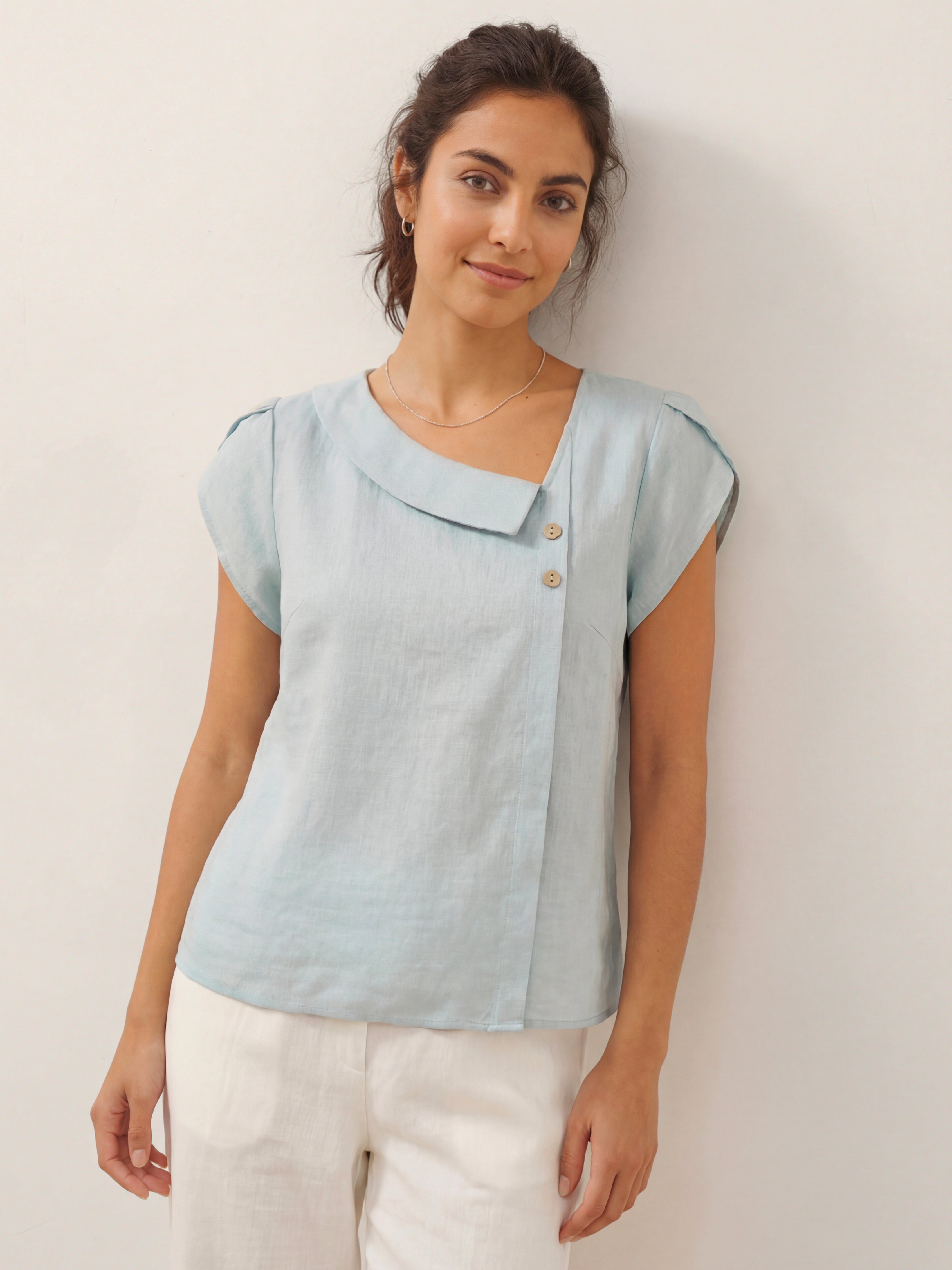 100% Linen Shawl V-Neck Half Sleeve Top JADE