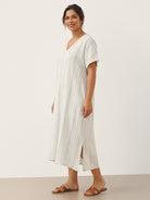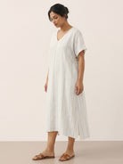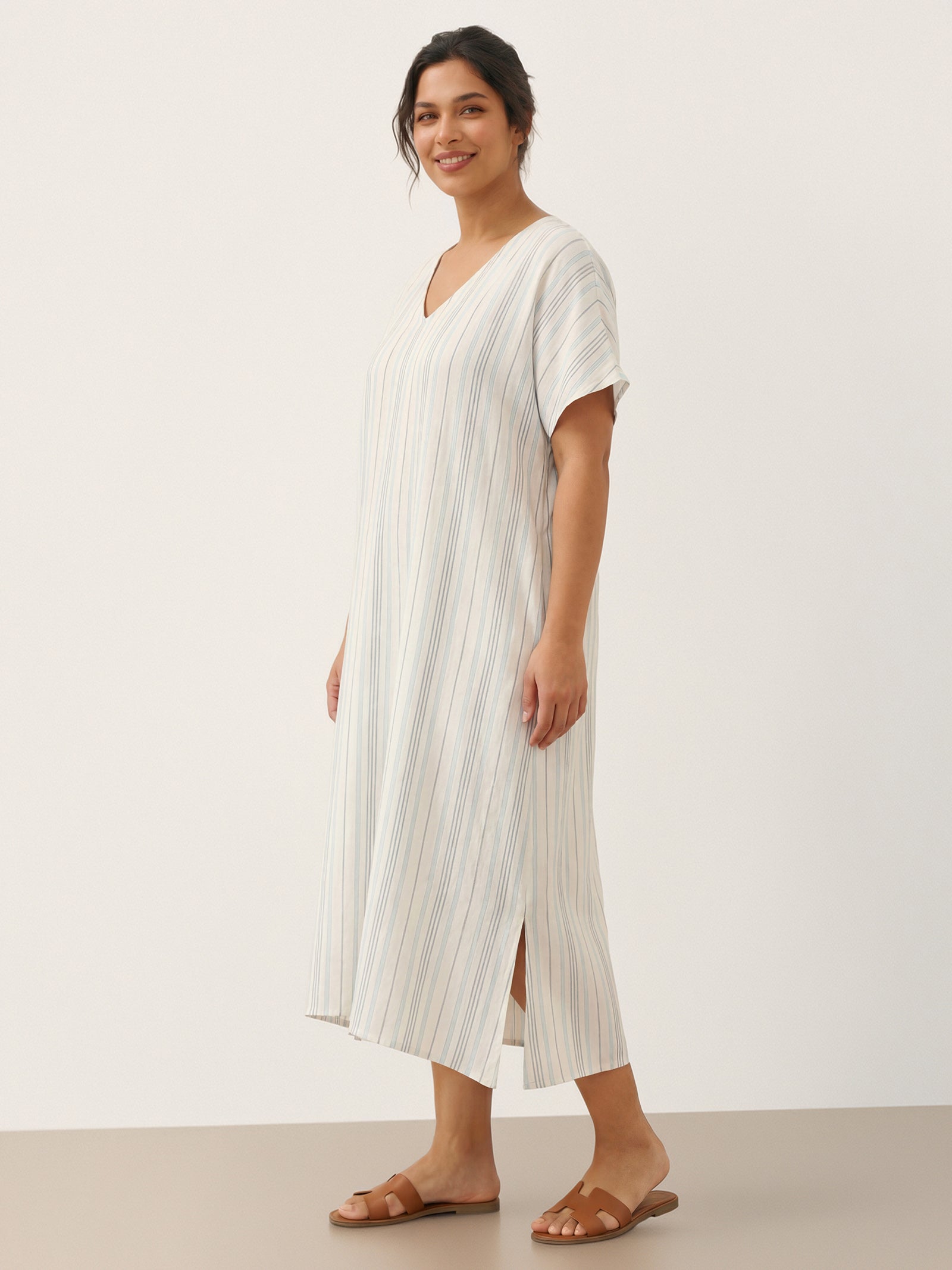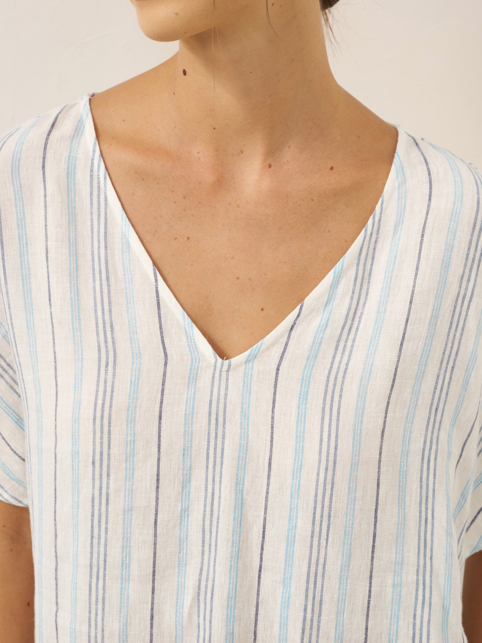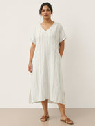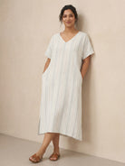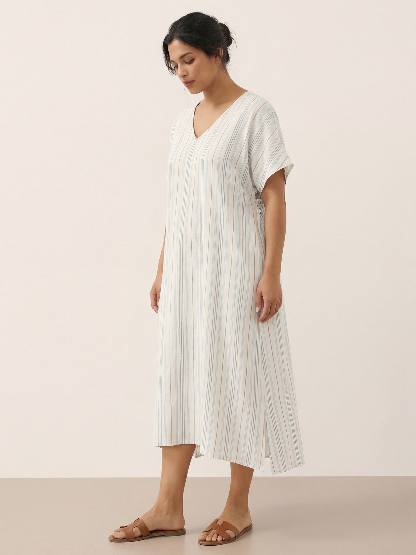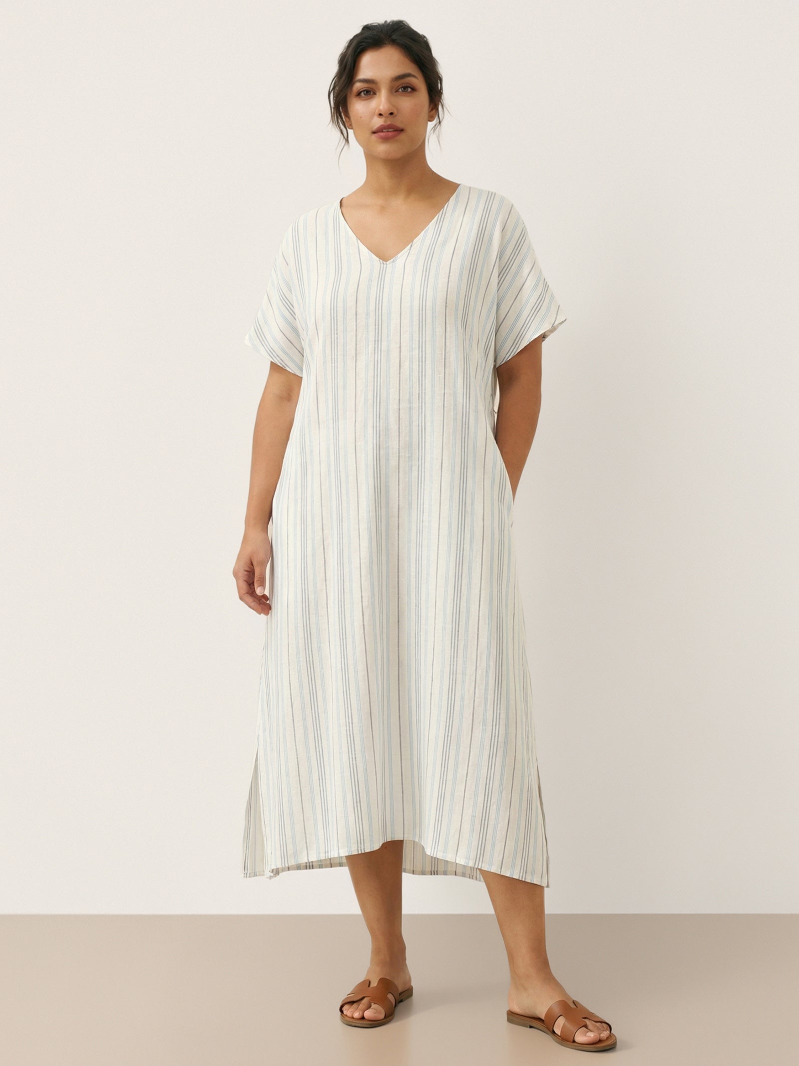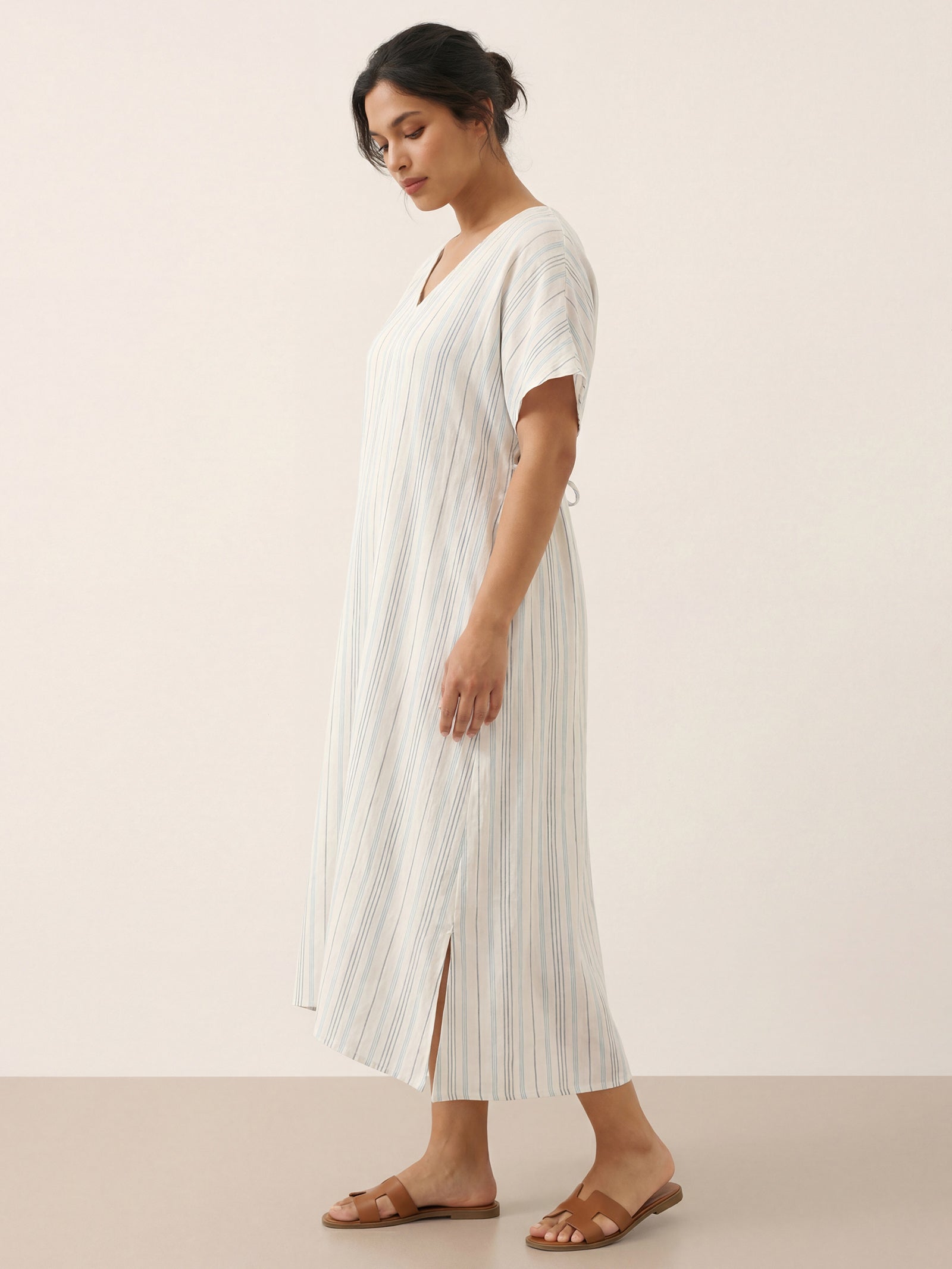 This relaxed linen dress combines breathable comfort with subtle elegance, featuring a flattering V-neck and adjustable back tie for a customizable fit.