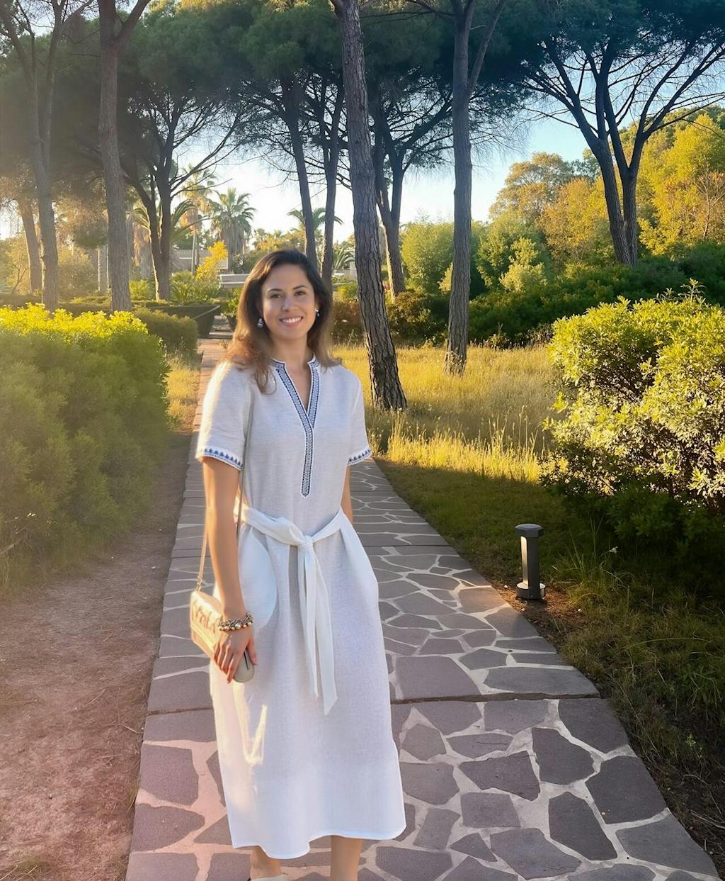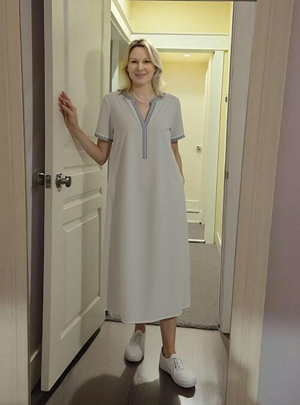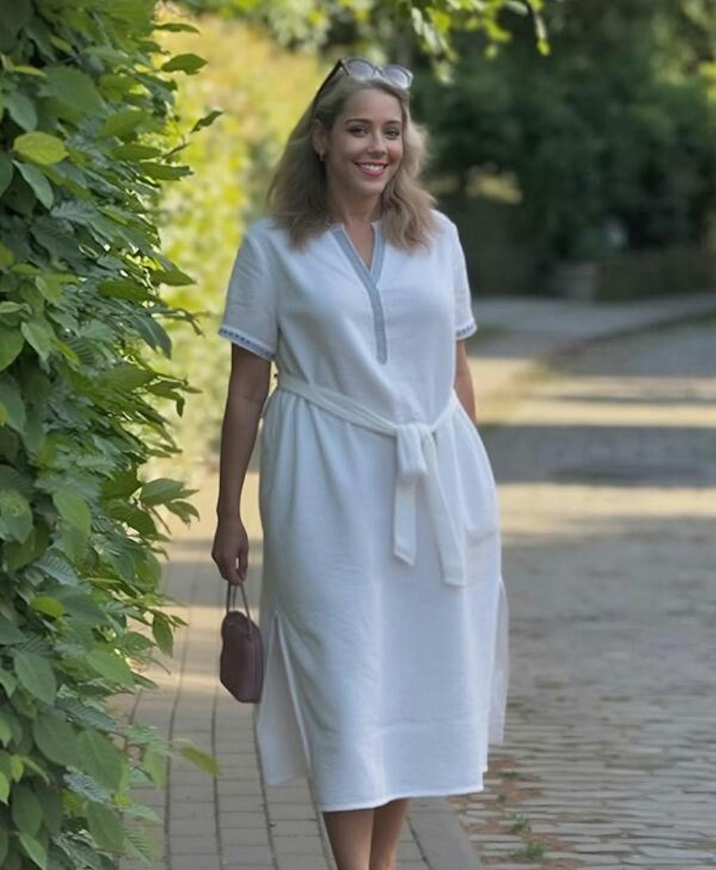 This linen dress balances relaxed elegance with thoughtful functionality, featuring a flattering embroidered V-neck, structured short sleeves, and subtle design details that make everyday wear feel effortless and refined.