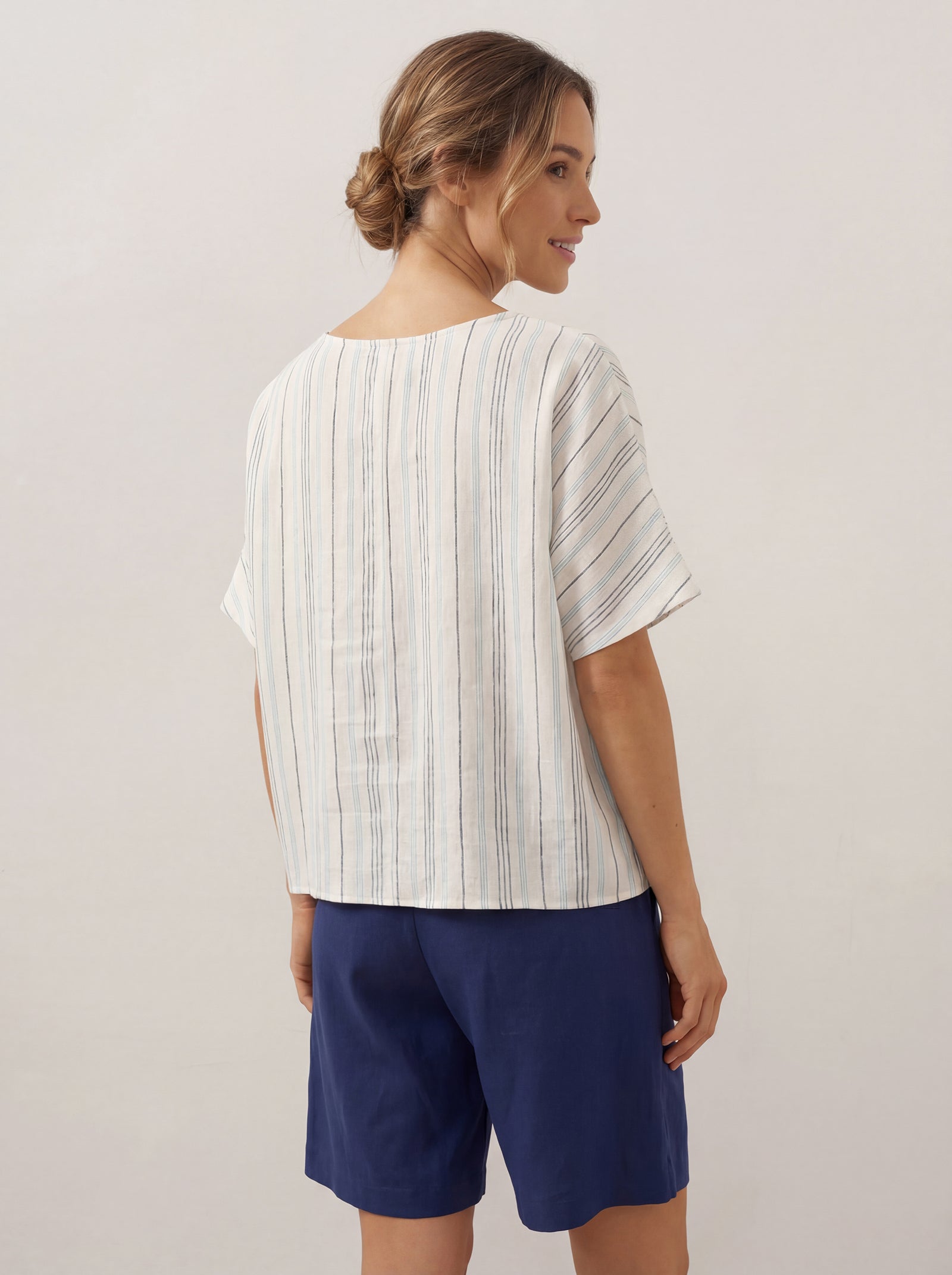 A blue and white striped linen top where relaxed silhouettes meet artful tailoring for an effortlessly polished look.