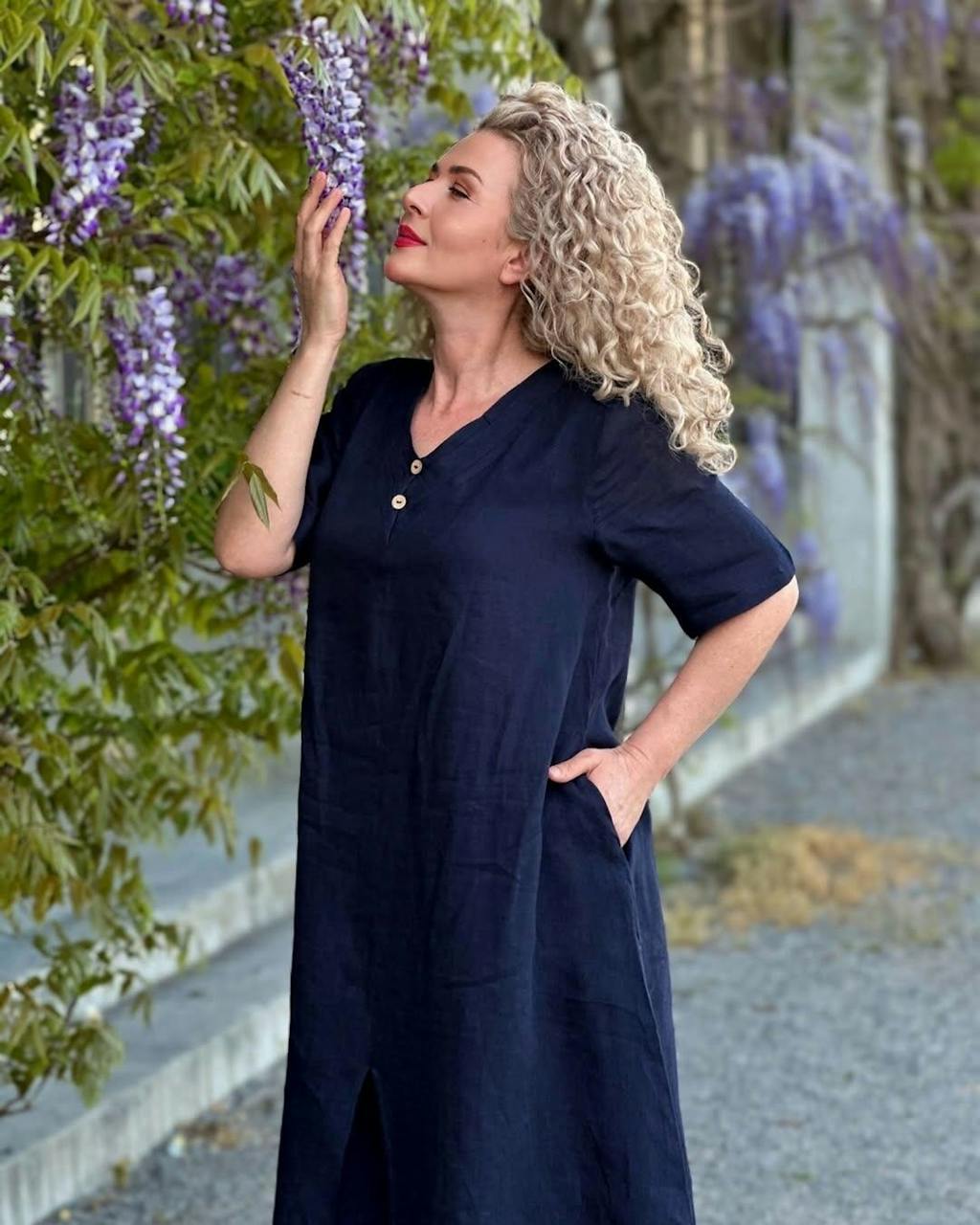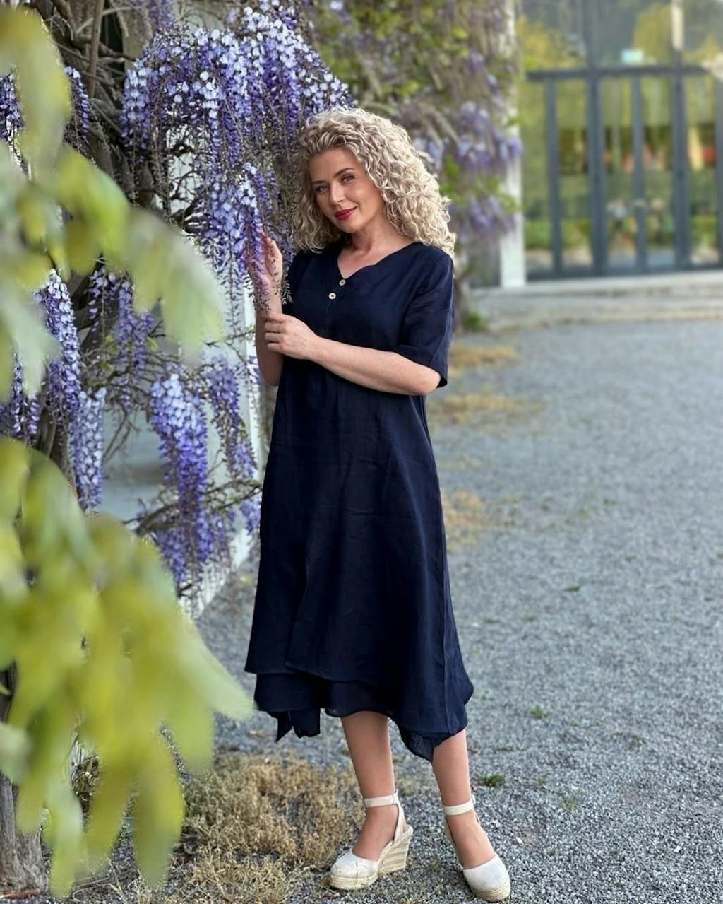 100% Linen V-Neck Double-Layer Midi Dress JAYDA