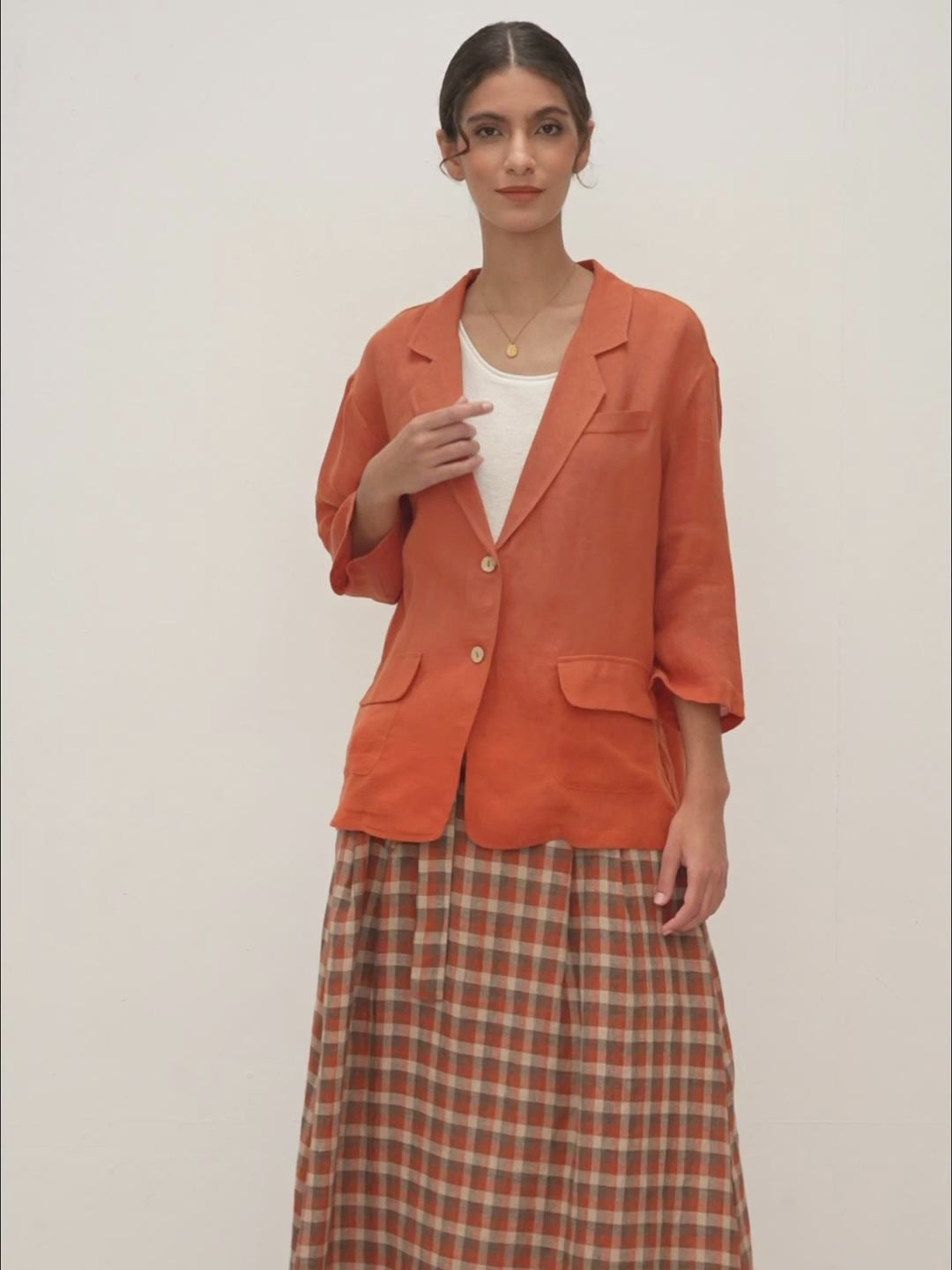 - Dropped shoulder three-quarter sleeves with a blazer collar, reimagining the classic blazer silhouette into a relaxed fit for versatile and comfortable wear.