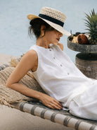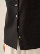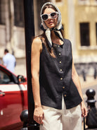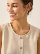 - Elevate your summer with this sleek, sleeveless linen top. A chic row of buttons adds sophistication, making it your go-to for cool, minimalist style.