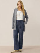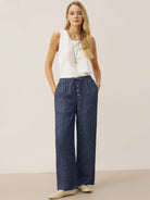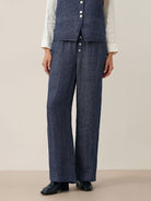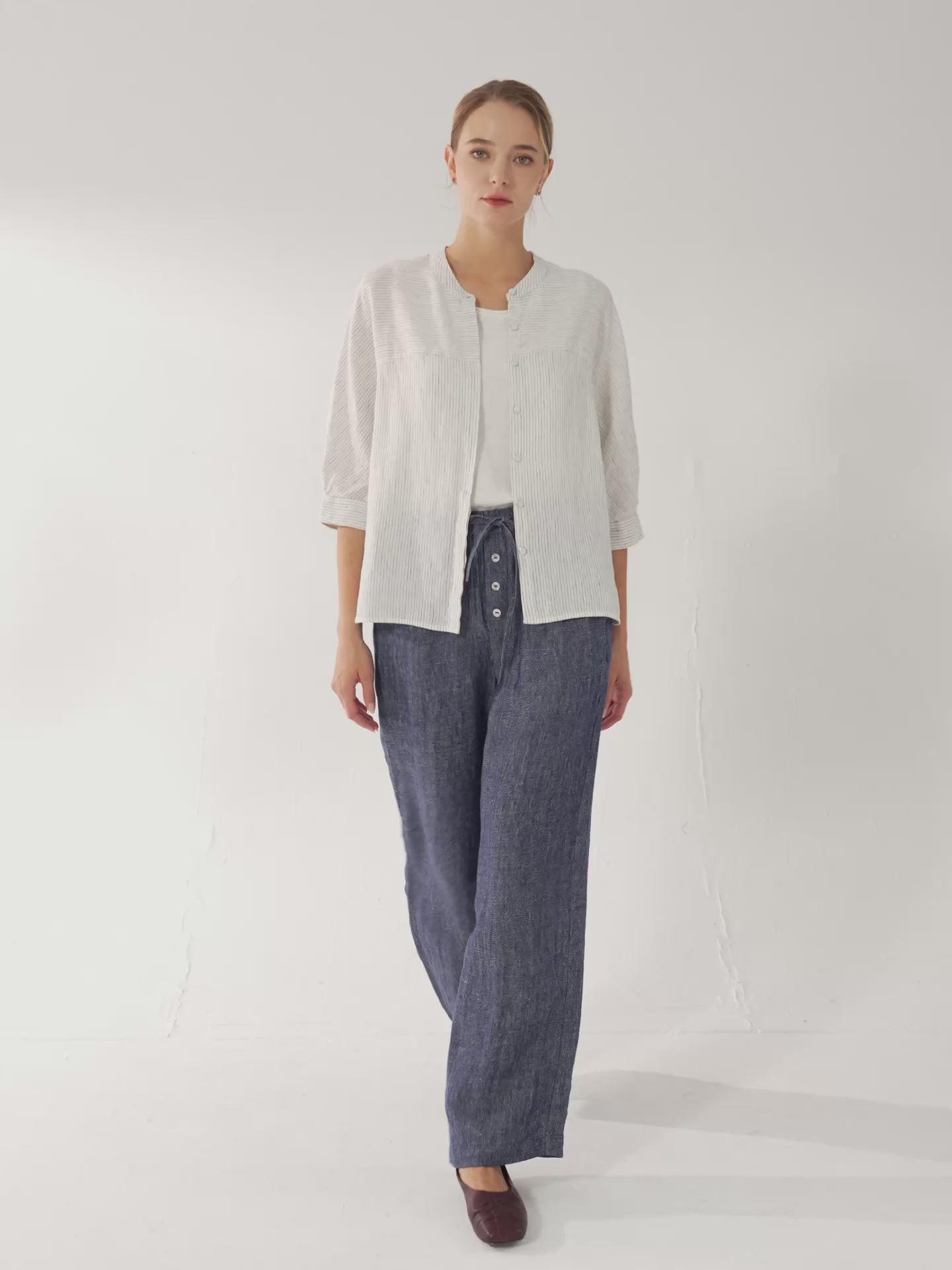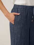 Natural-inspired relaxed linen denim pants blend comfort and functionality with artisanal details.