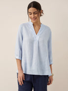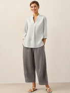 - Experience the ease of our soft, loose linen fabric, featuring a relaxed fit, stand-up collar, center pleat, and gentle side vents. Pair it with jeans or casual pants for a perfect look.