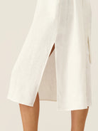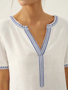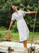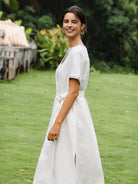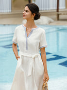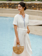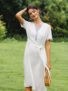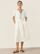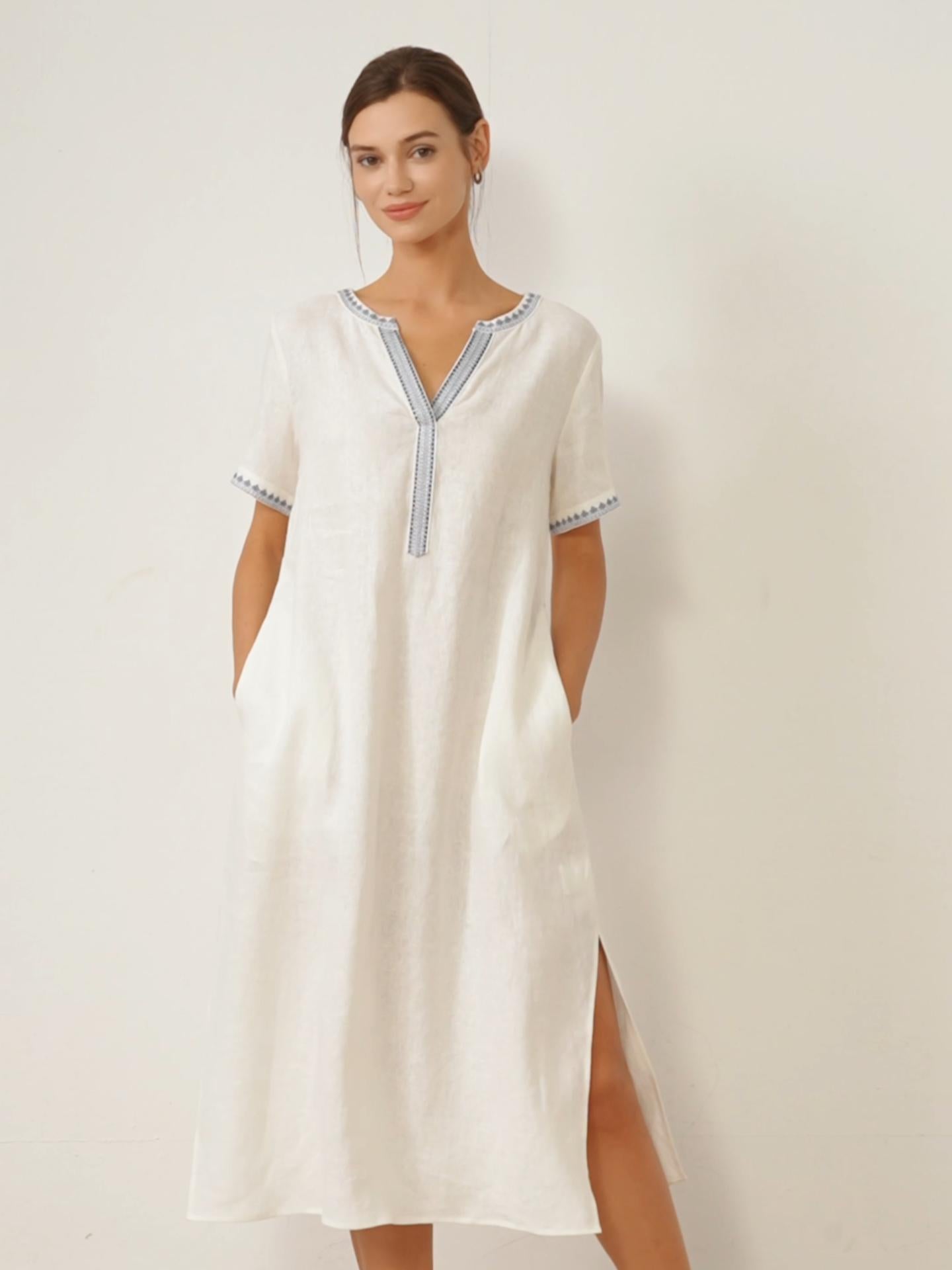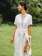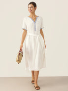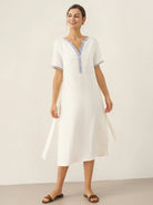 100% Linen Embroidered V-Neck Midi Dress with Belt FELLIS