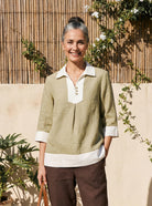 100% Linen Contrast Panel Lapel Sculpted Pleated Pullover Top VICTORIA