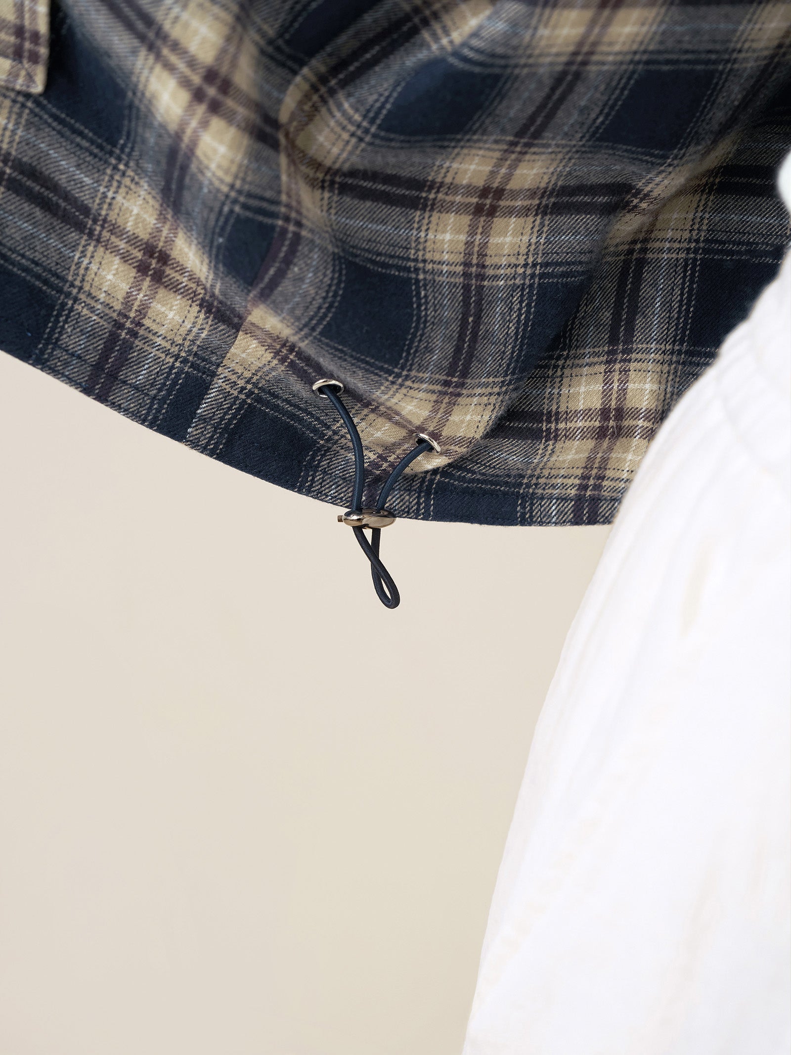 A reversible crew neck jacket crafted from Tencel linen and cotton checkered fabric, designed for versatile styling with adjustable details and relaxed comfort in Twilight Blue.