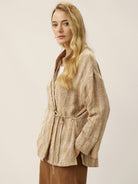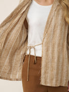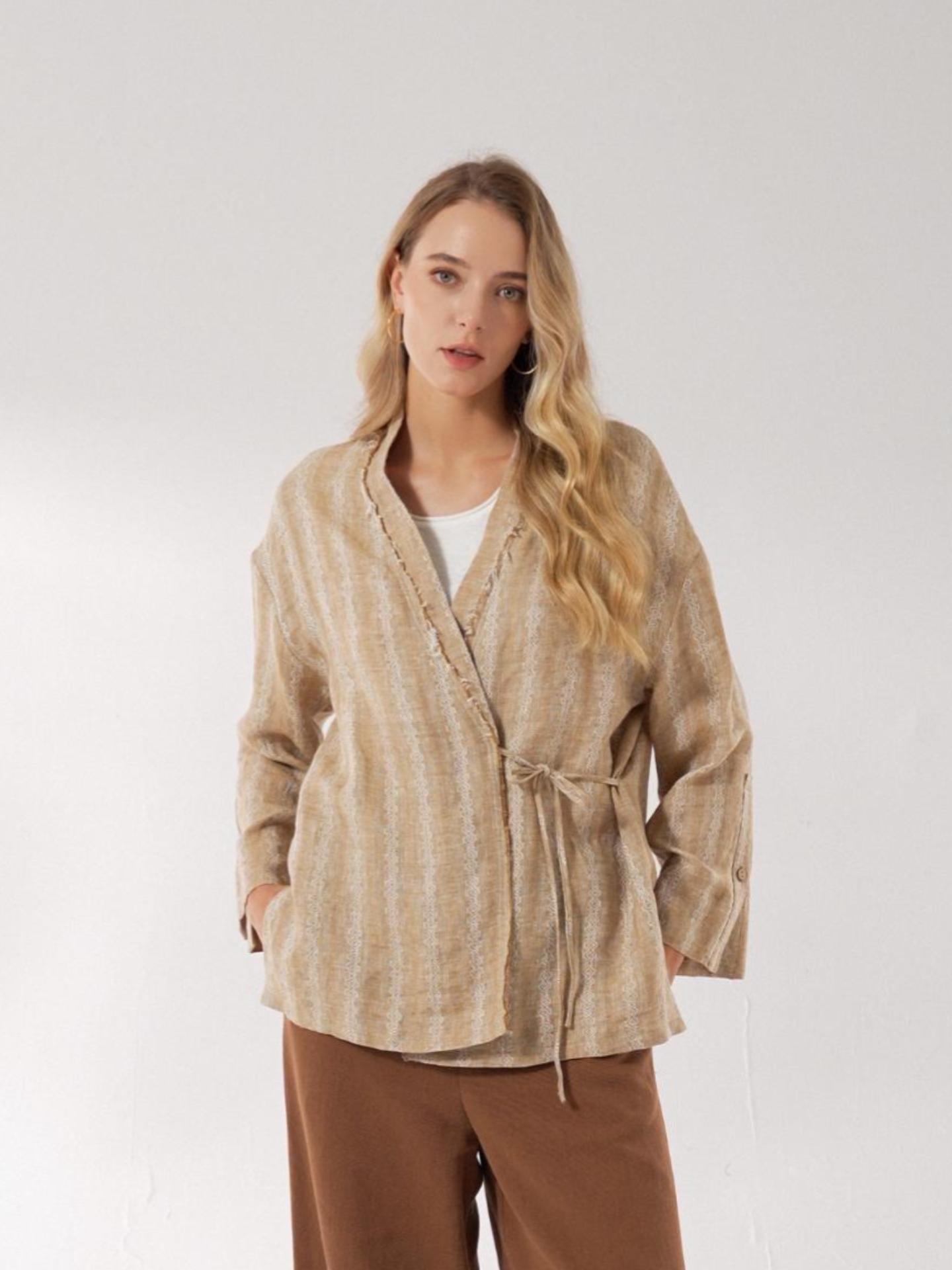 A relaxed linen wrap jacket featuring textured jacquard fabric and artisanal detailing with bohemian-inspired functional elements.