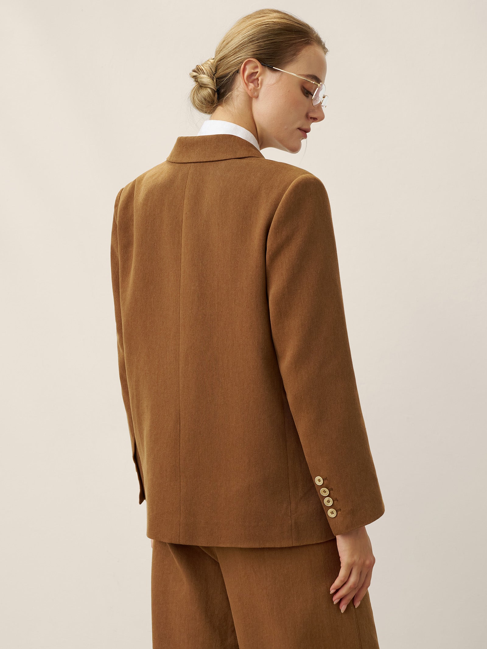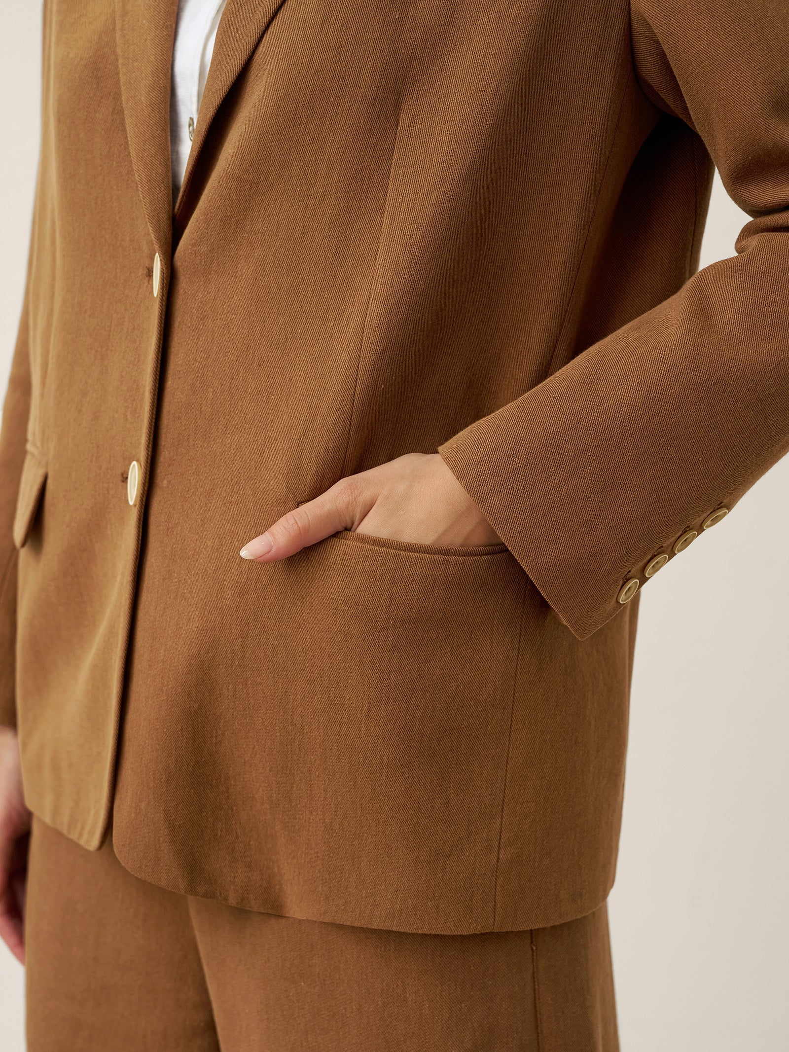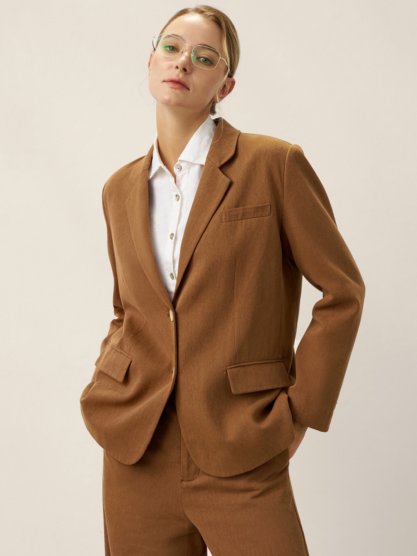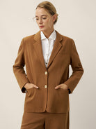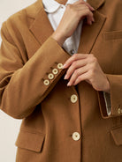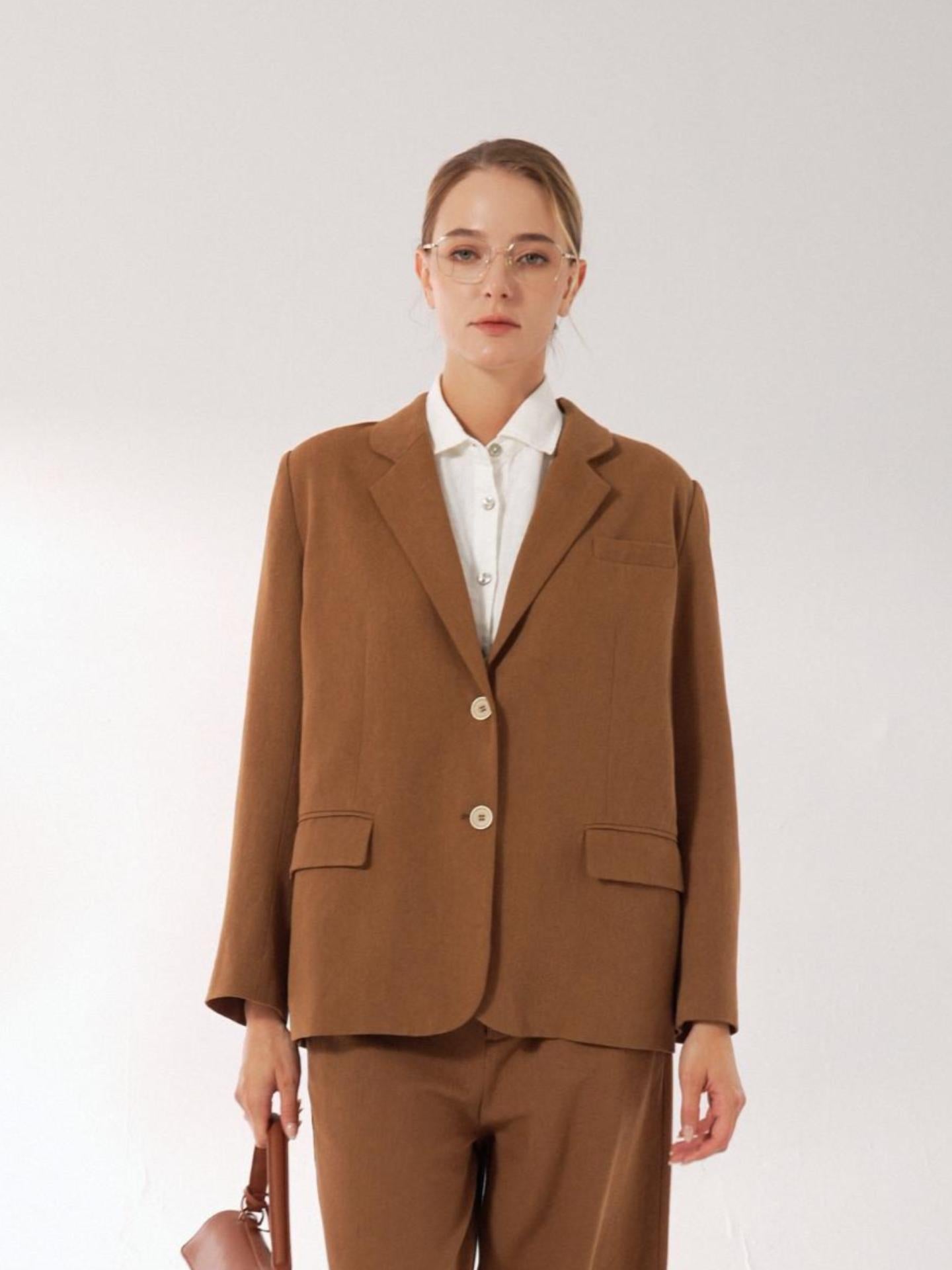 A tailored Tencel linen blazer in Cocoa Brown, blending relaxed sophistication with functional details like adjustable closures and versatile pockets.