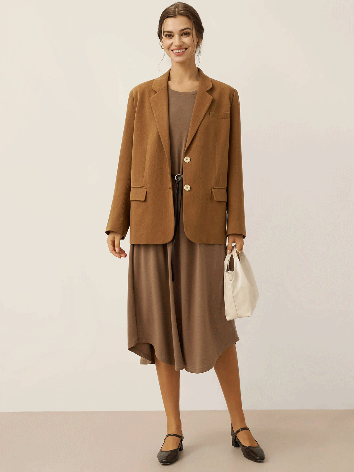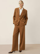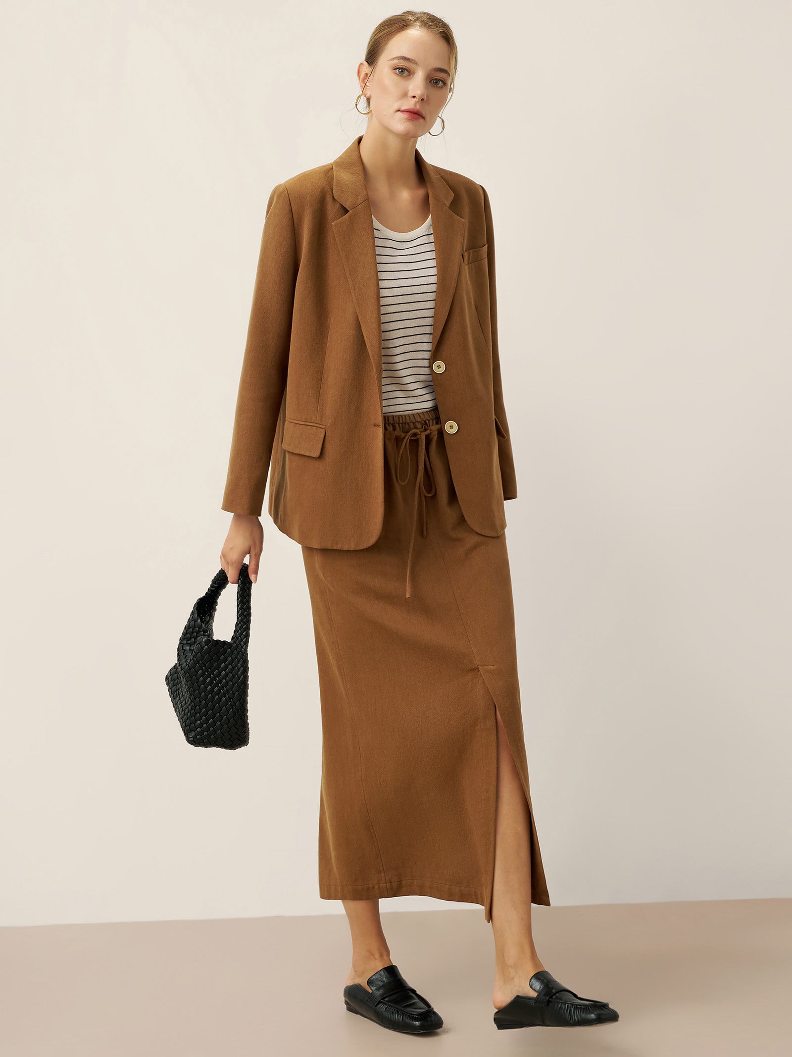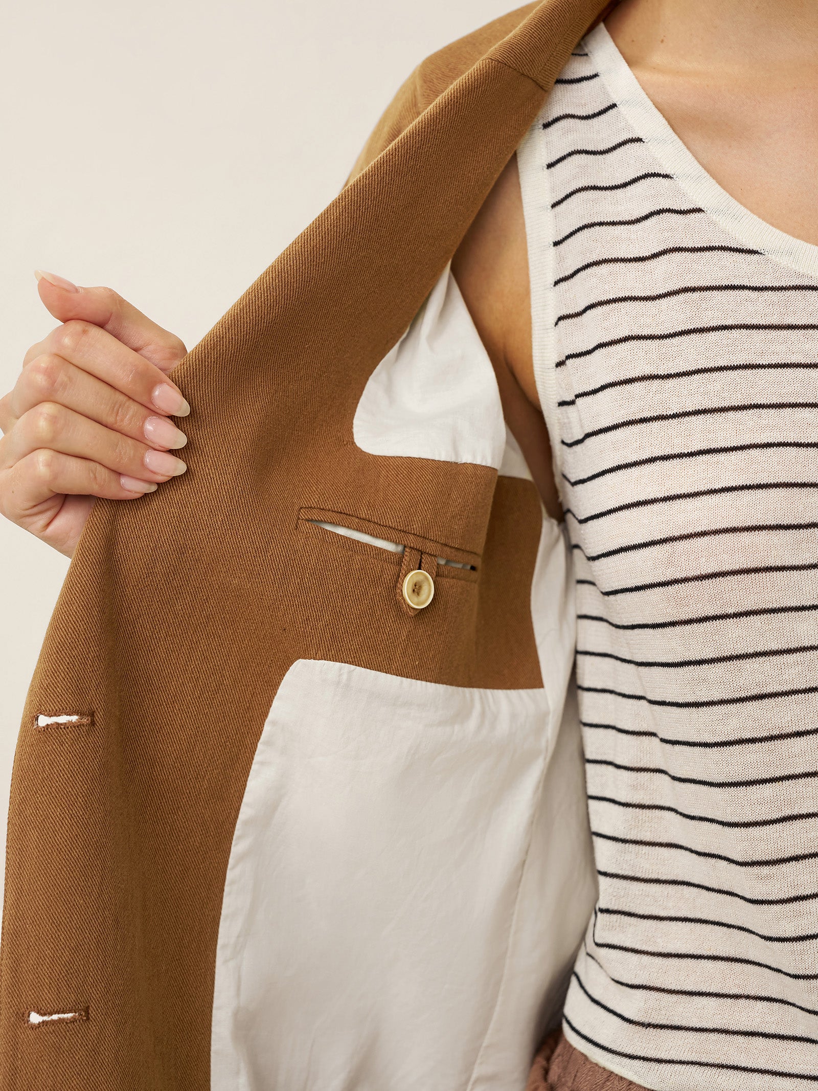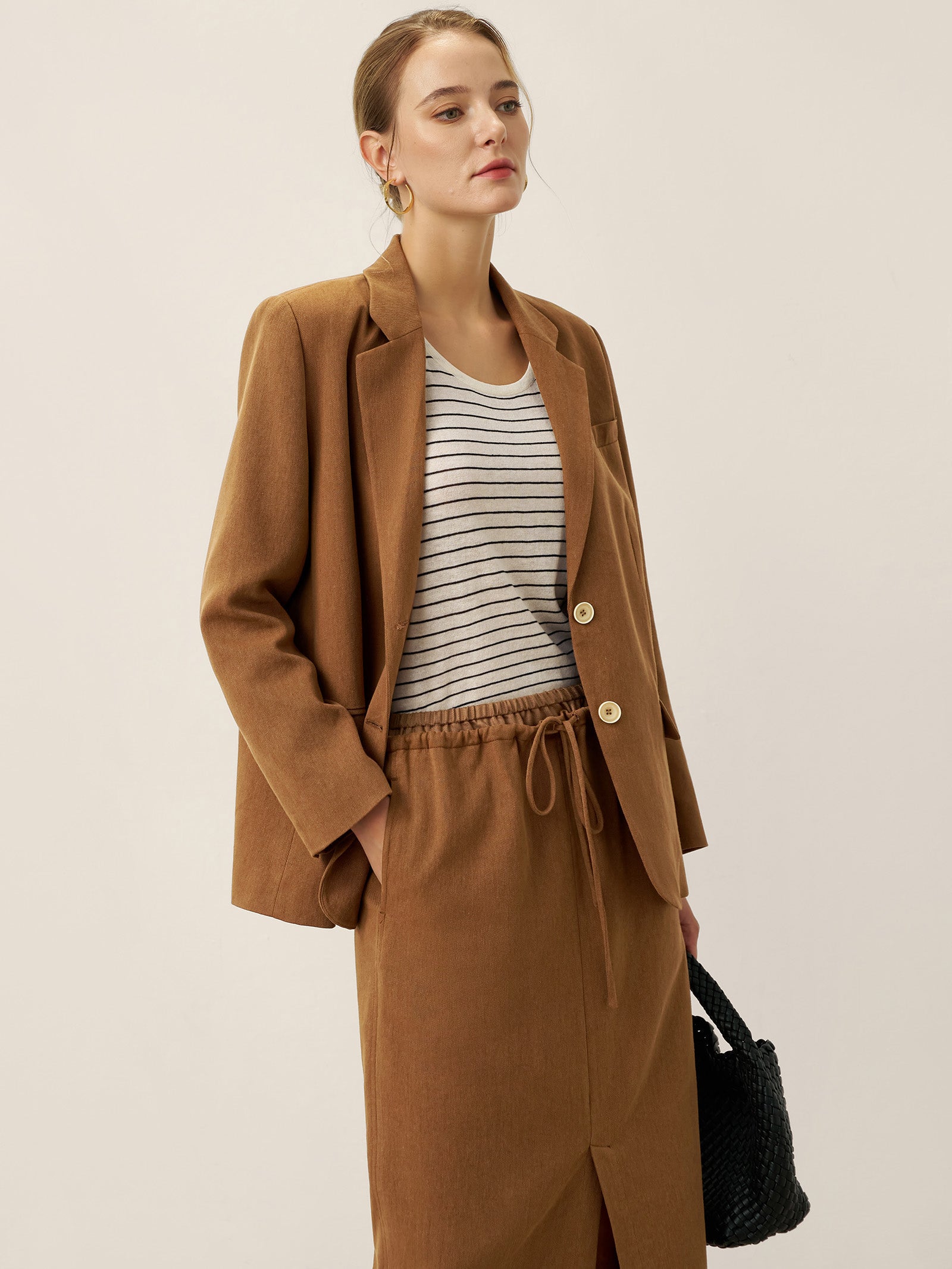 A tailored Tencel linen blazer in Cocoa Brown, blending relaxed sophistication with functional details like adjustable closures and versatile pockets.