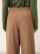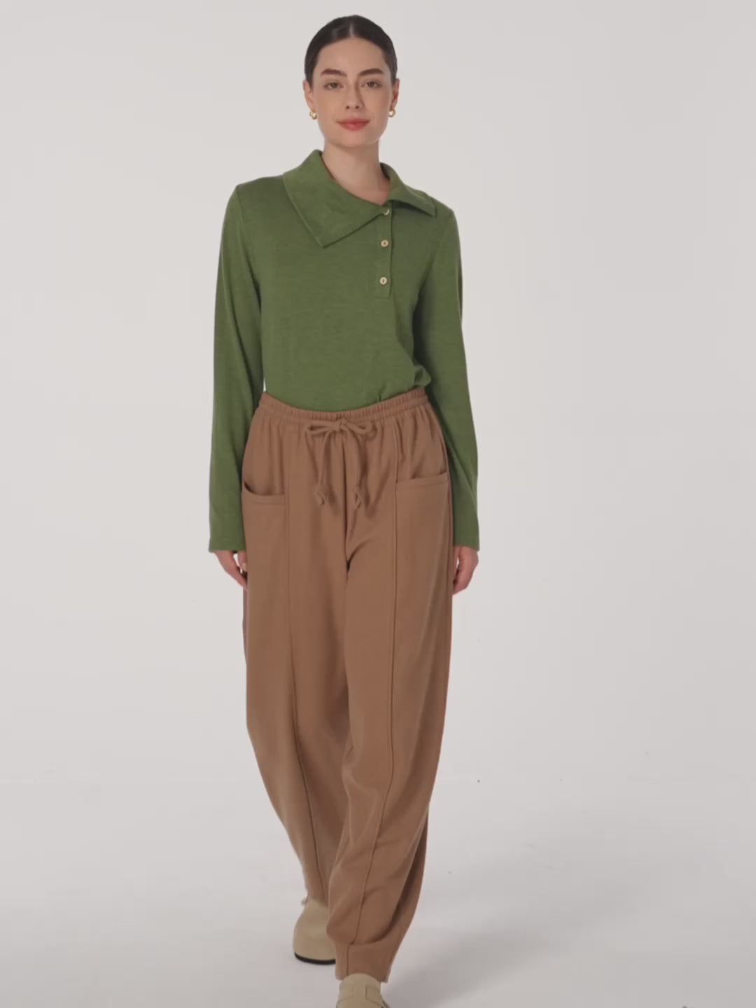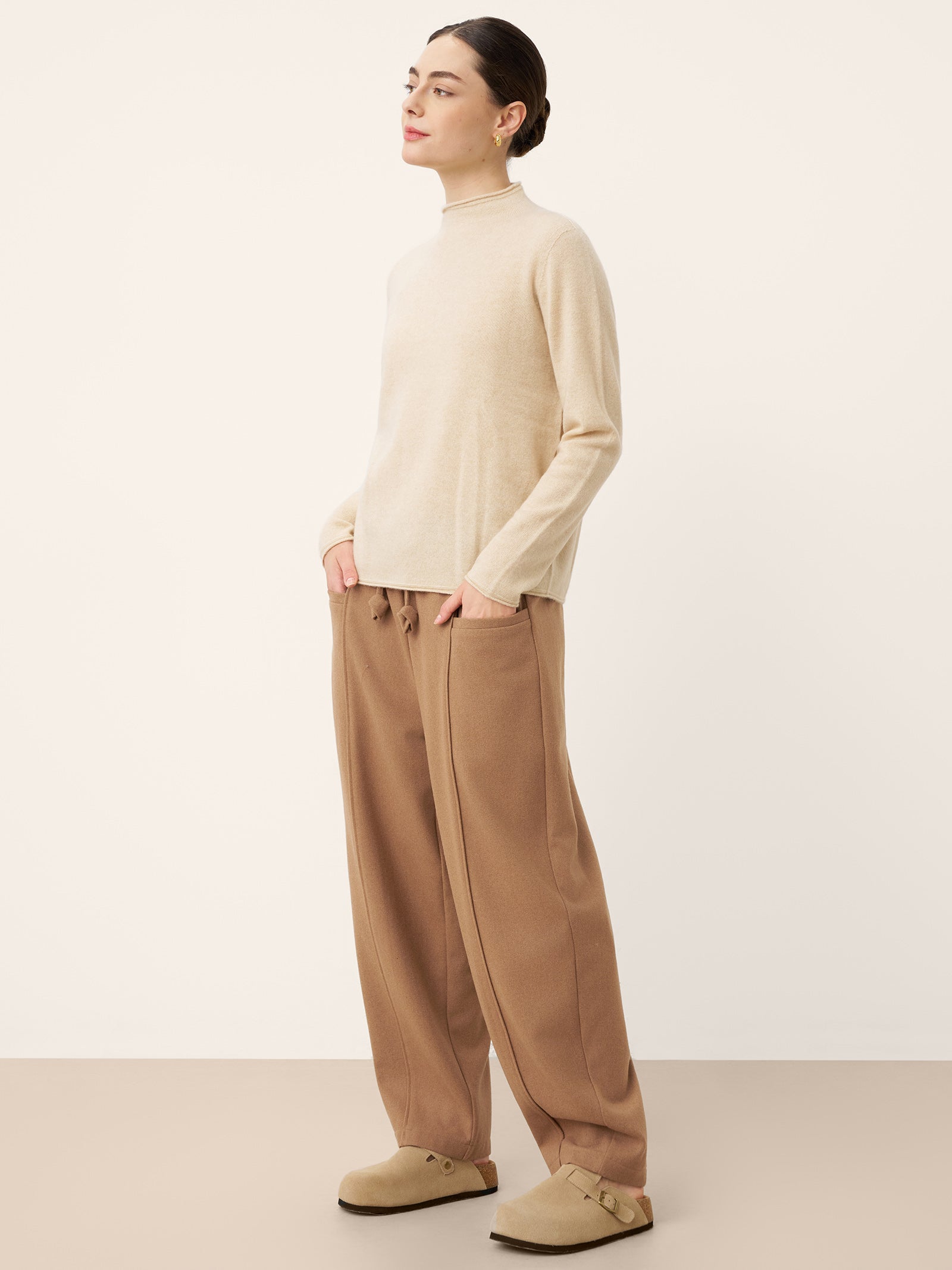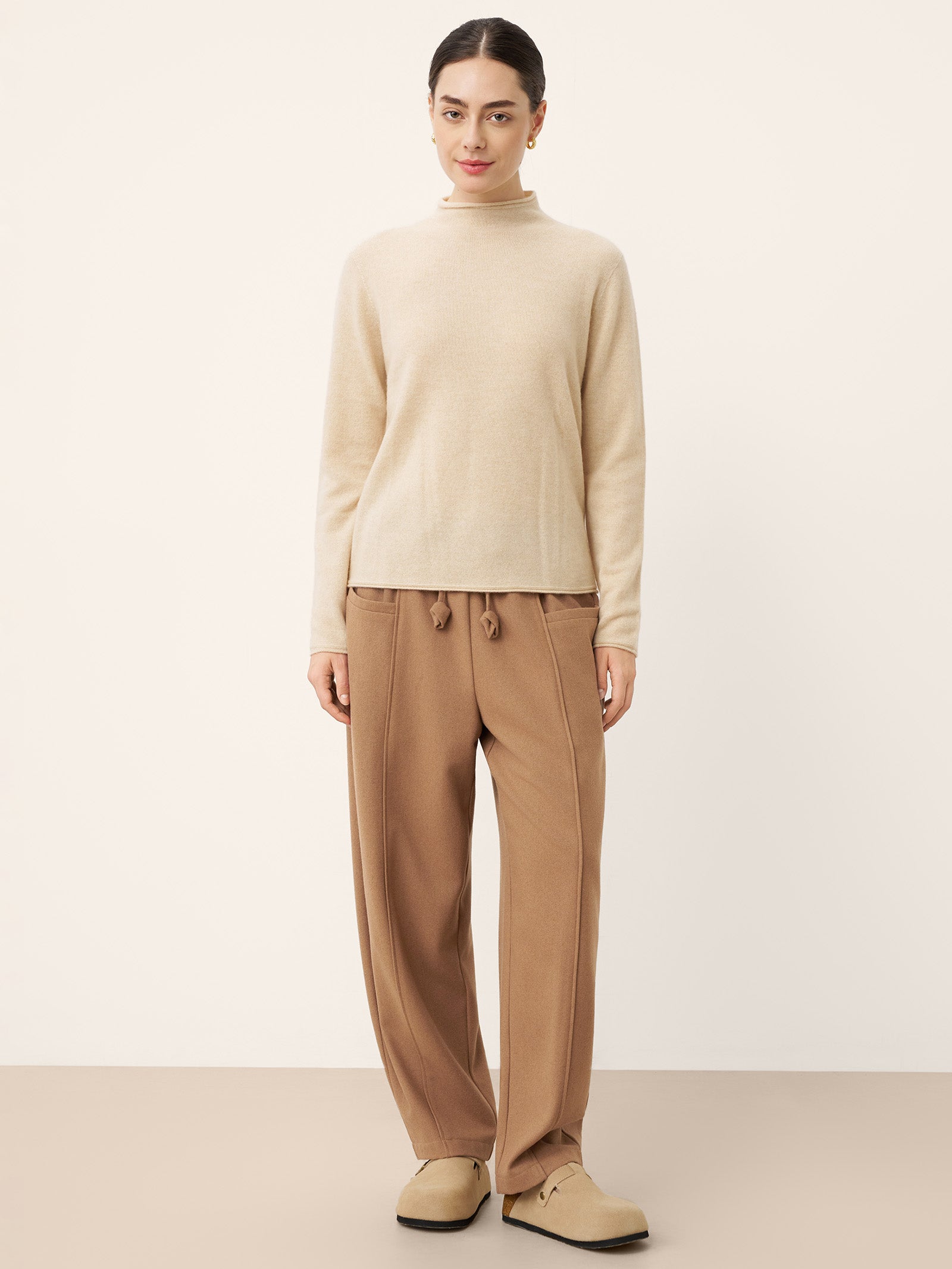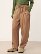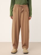 This caramel brown drawstring straight leg pant sculpts your silhouette with figure-flattering vertical seams while soft wool drapes luxuriously, blending all-day comfort with polished everyday versatility.