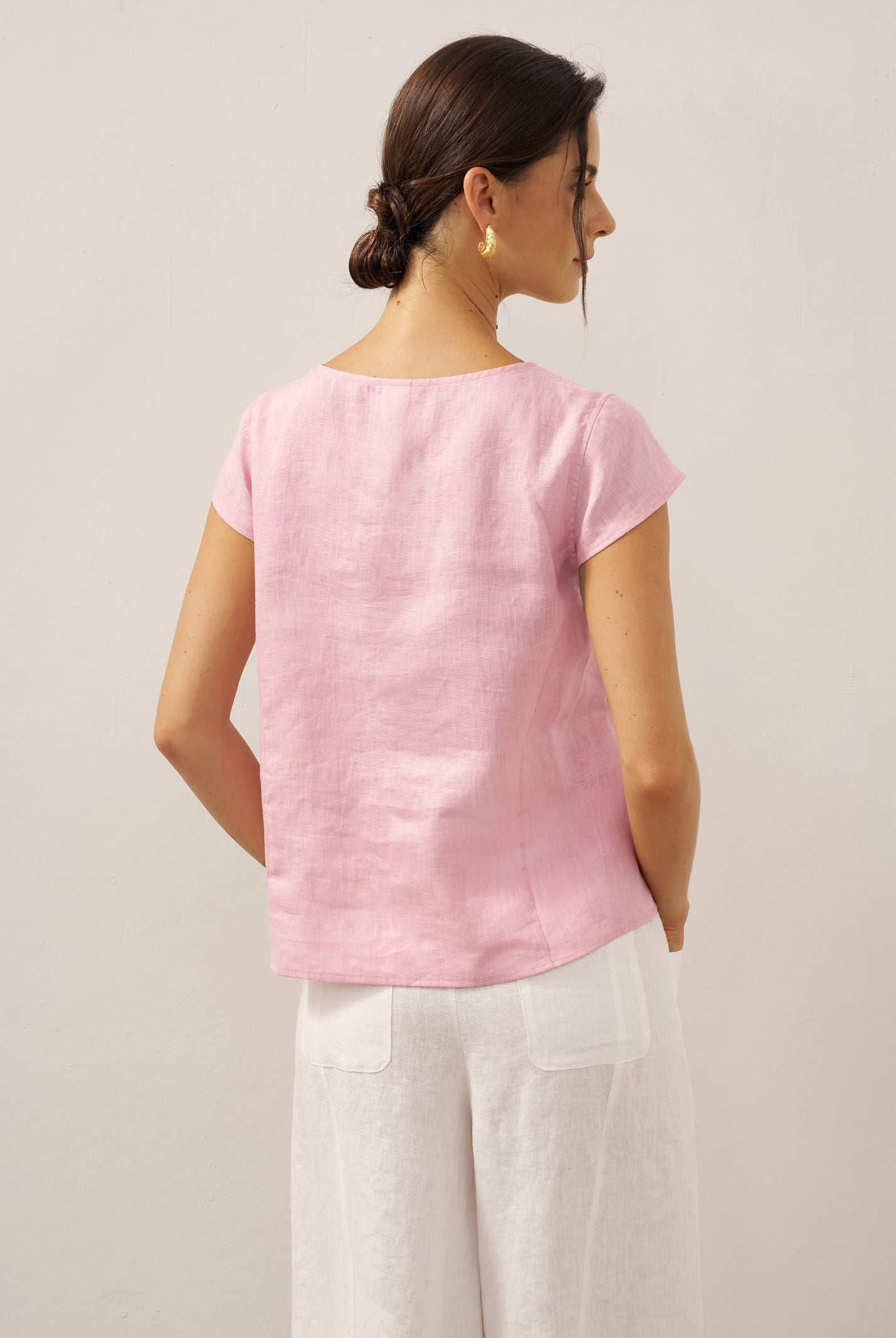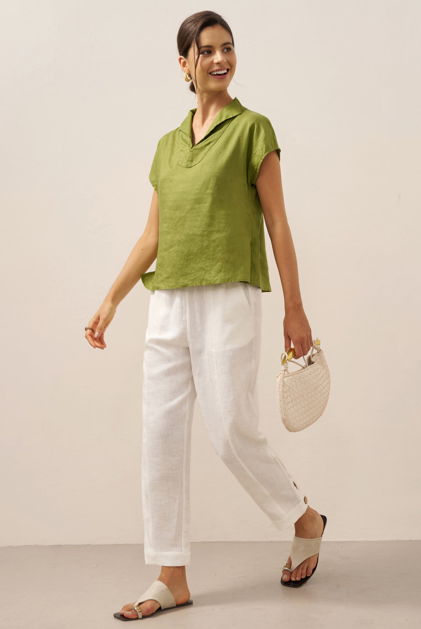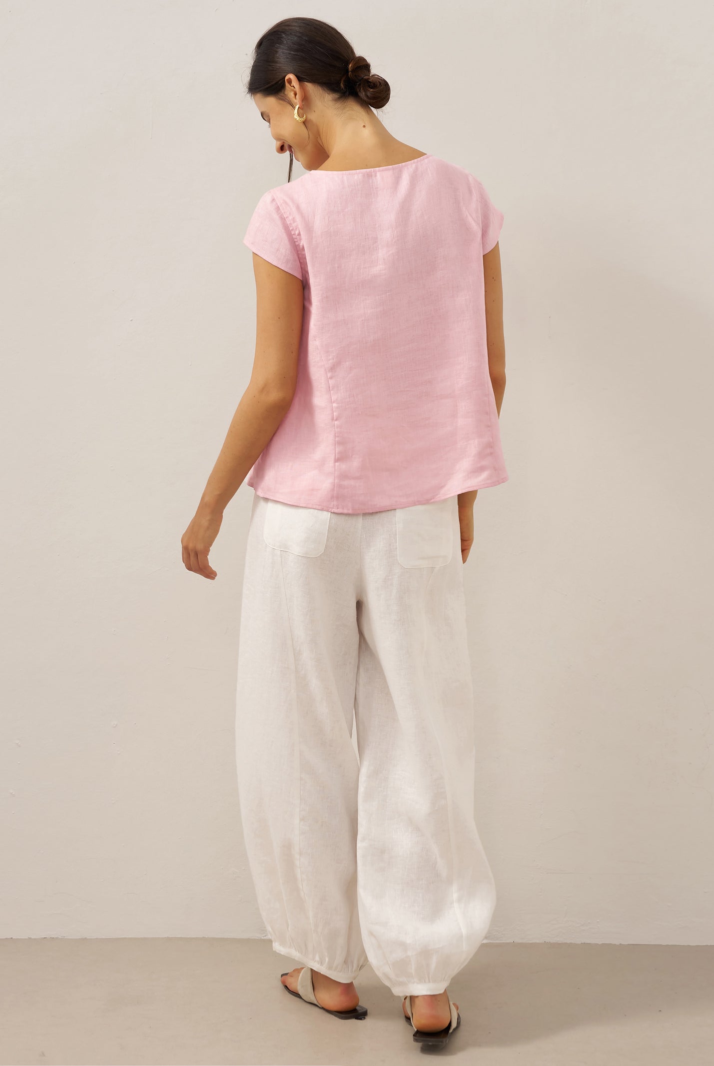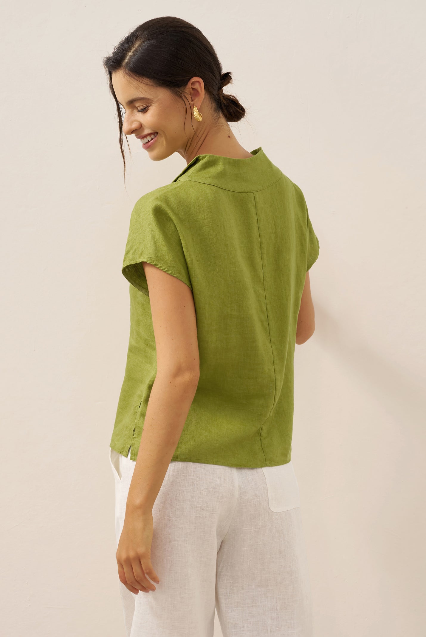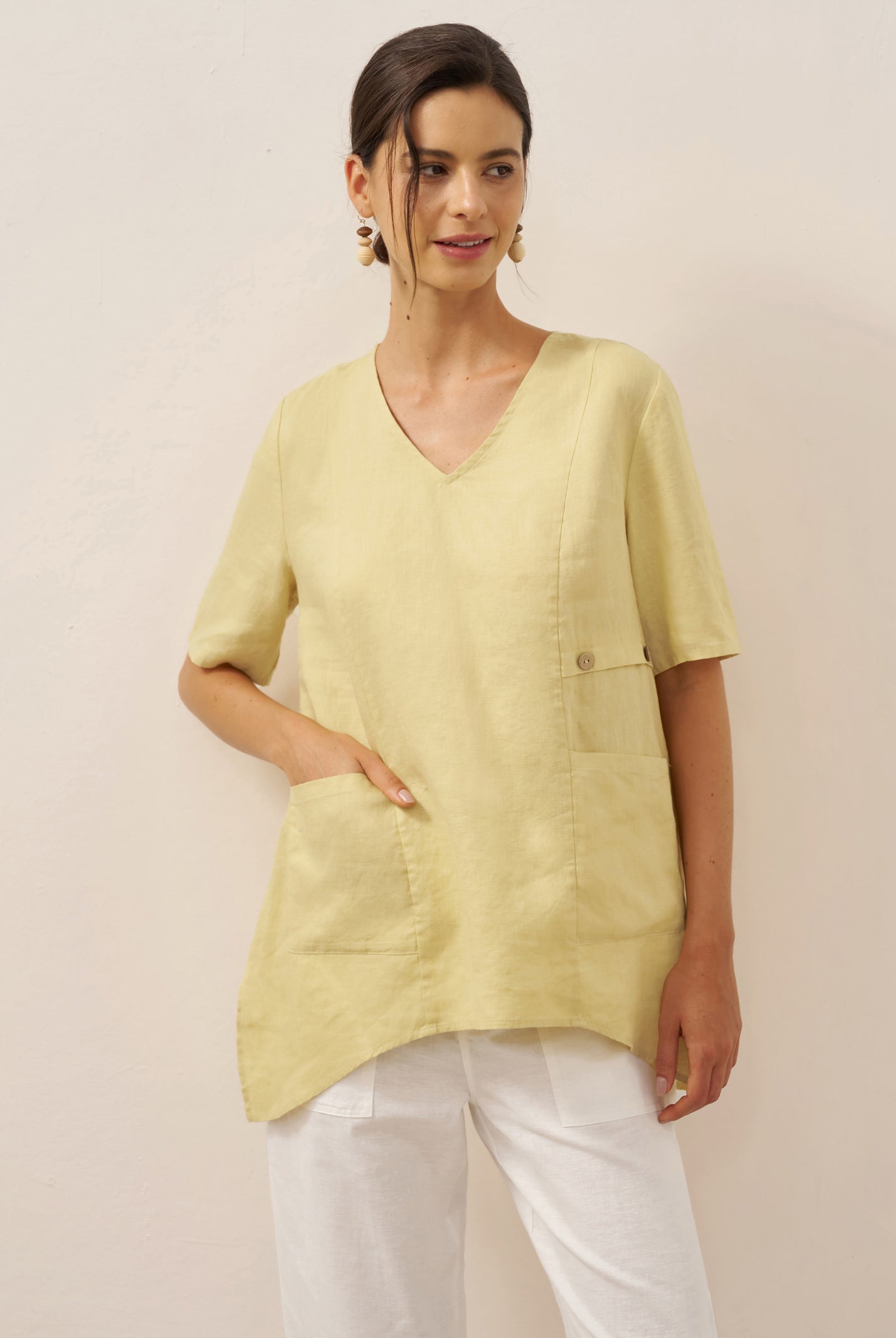 100% Linen Stripe Shawl V-Neck Half Sleeve Top