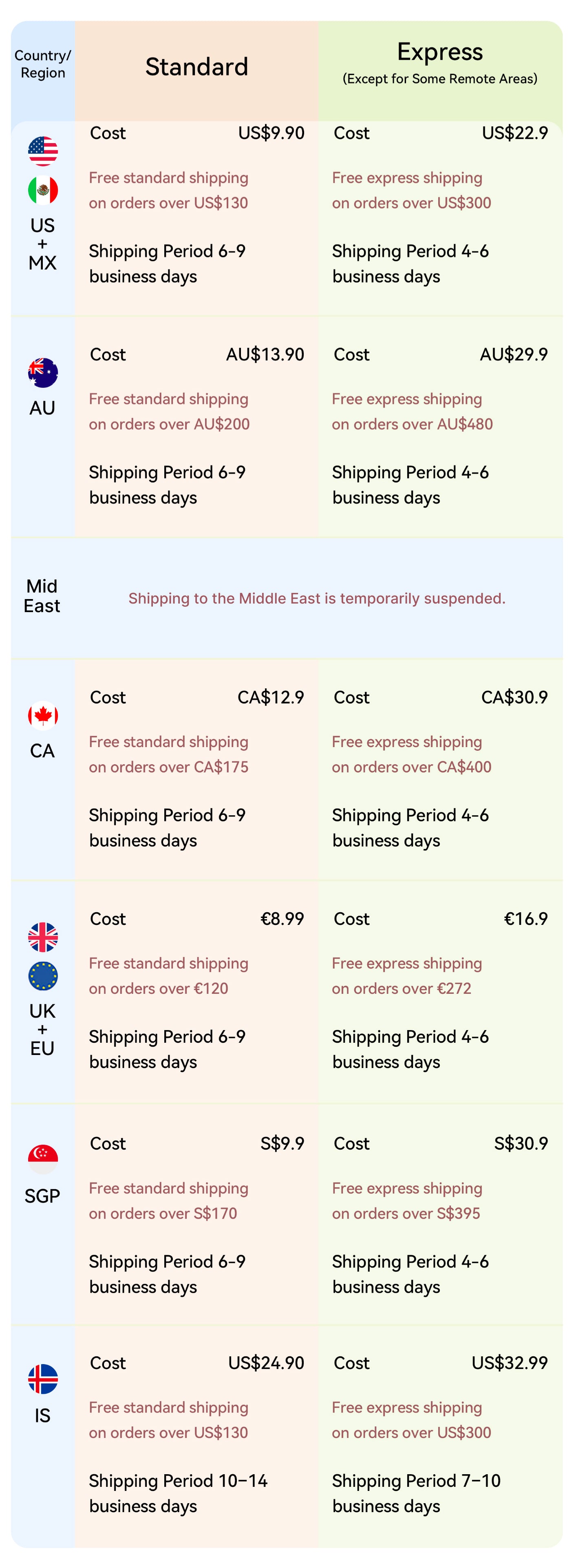 Shipping Countries, Costs, and Delivery Times