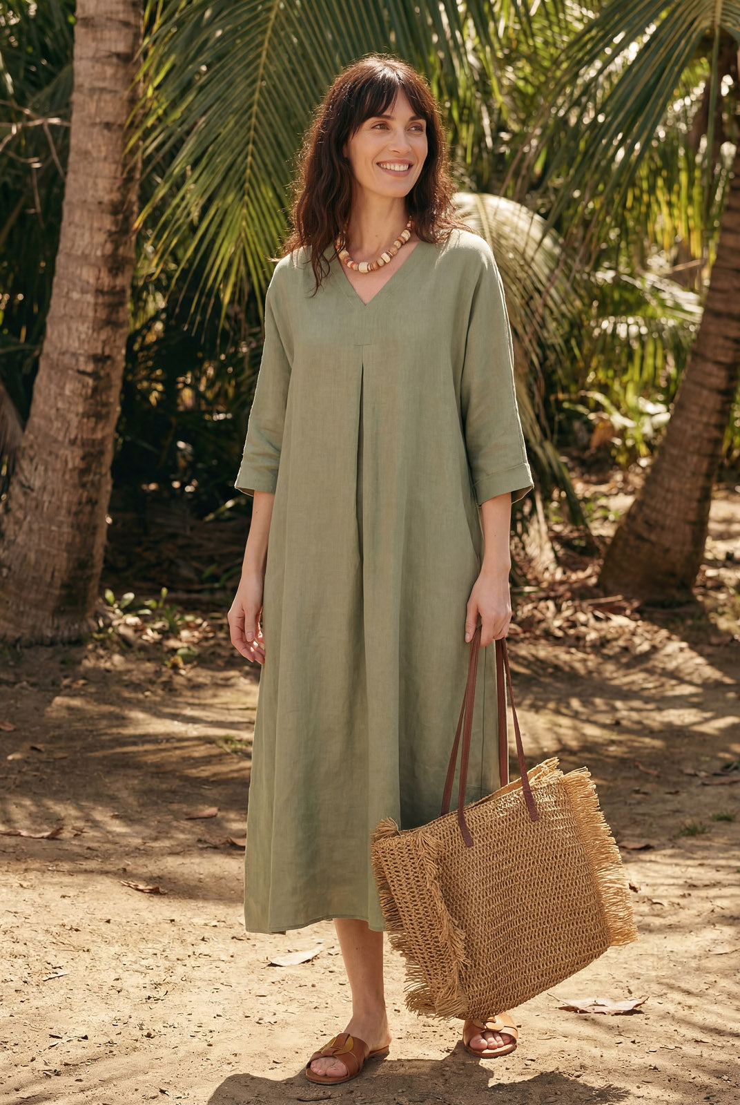 This linen dress feels light but still structured enough to look polished. The earthy green shade is so flattering and easy to style with sandals or flats. I love how comfortable it is while still looking put together.