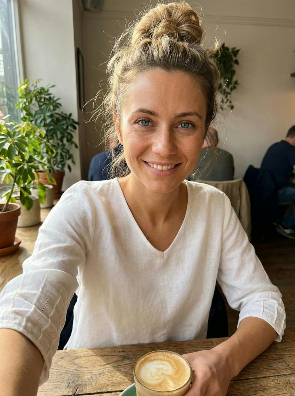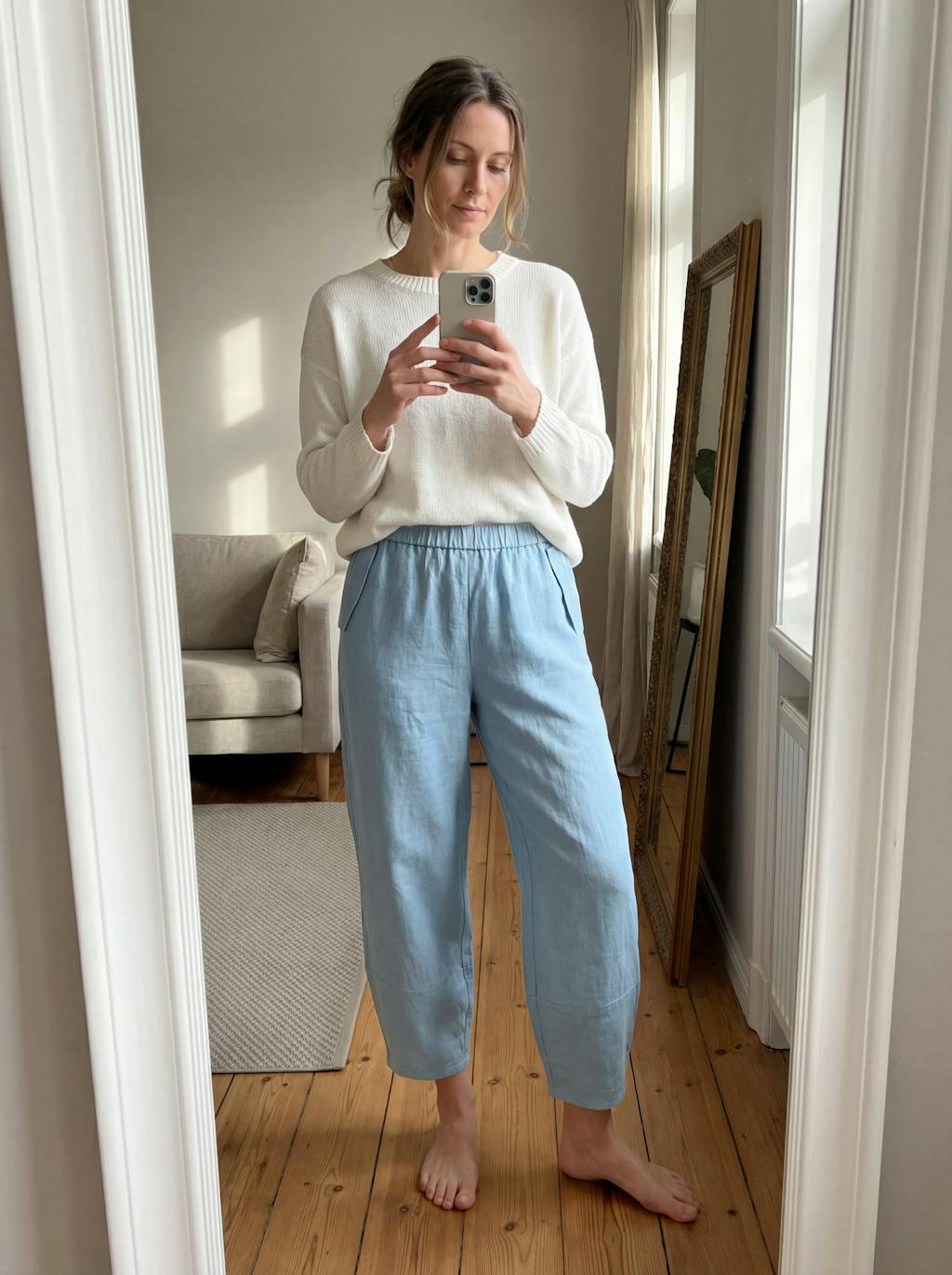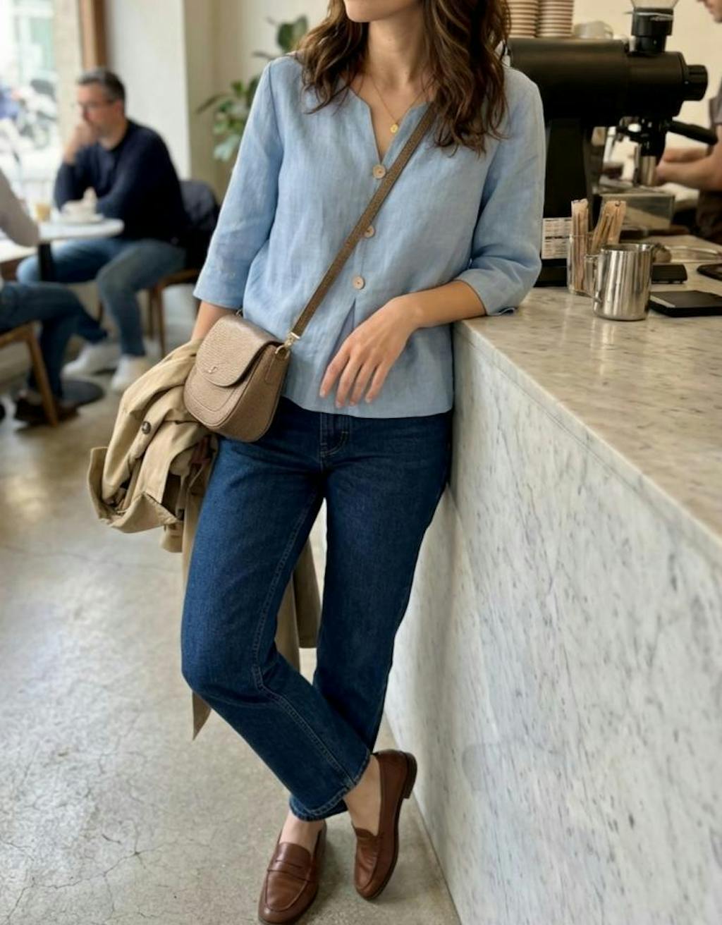 This top has such a relaxed Mediterranean feel to it. I wore it while having my morning coffee and instantly loved how easy and comfortable it felt. The blue linen blend has a really nice texture, and the wooden buttons add a subtle, natural detail without being too much.