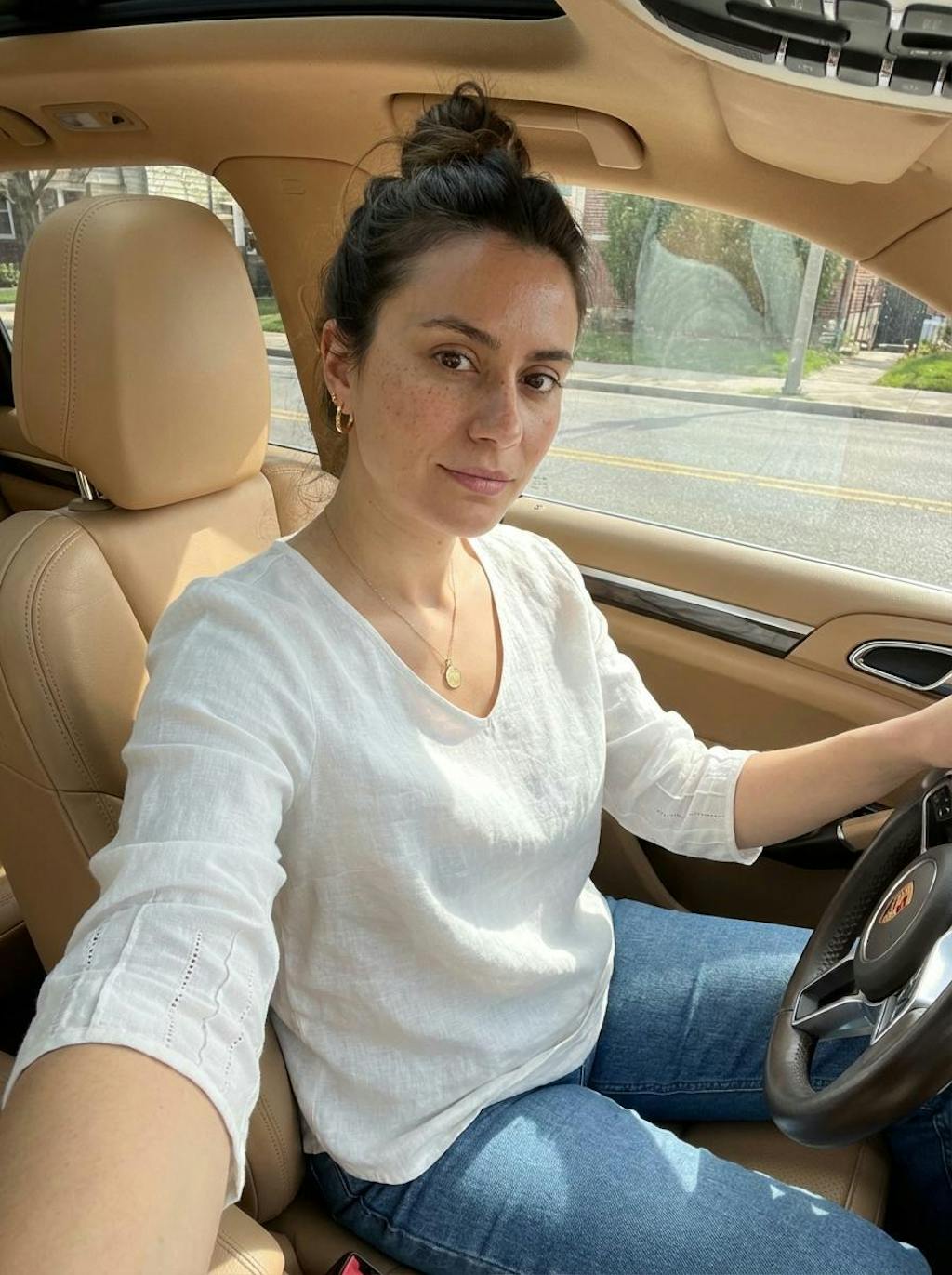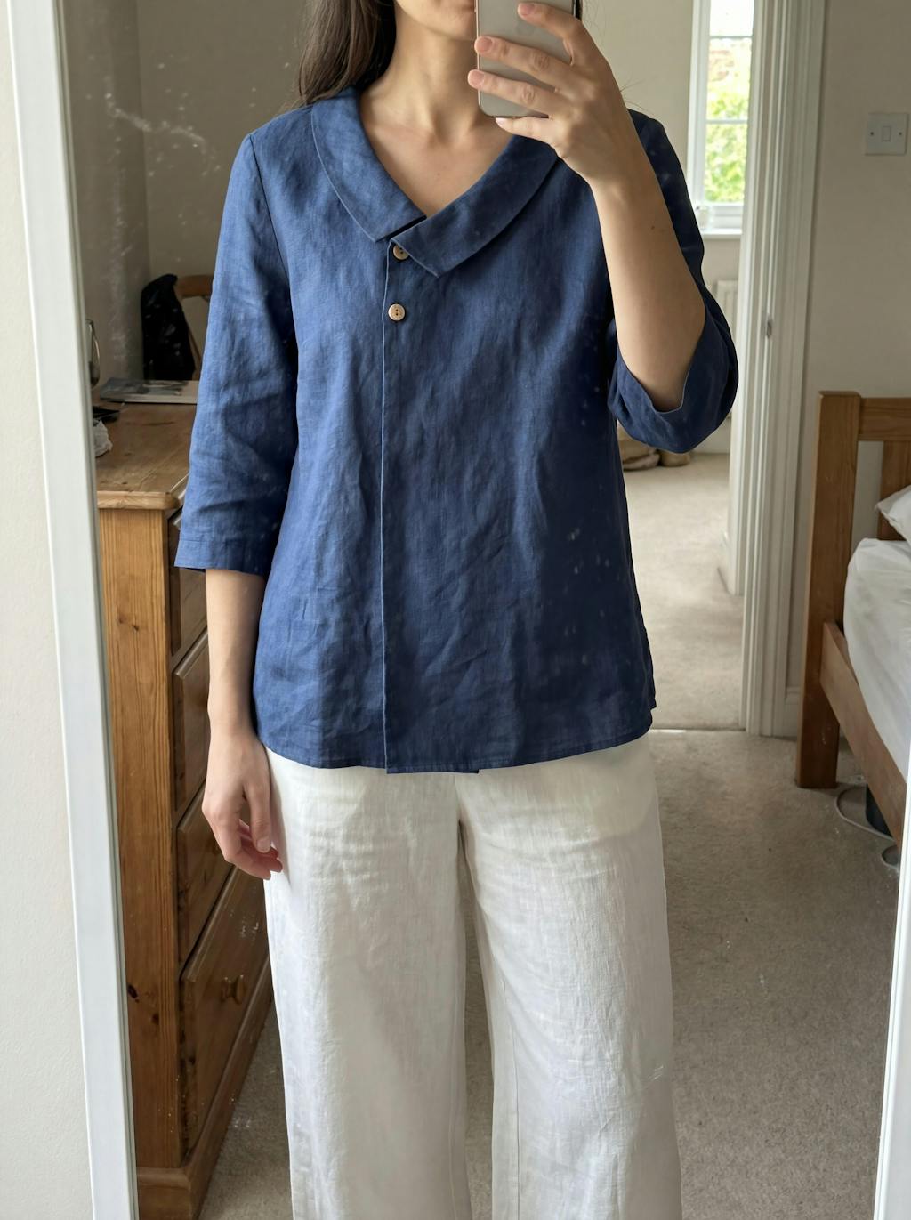 I was wearing this top and instantly loved how it looked. The blue linen feels like great quality, and the wooden buttons add a nice, natural detail. I ordered a size S, and it fits true to size. It’s lightweight, breathable, and easy to style—perfect for simple summer outfits.