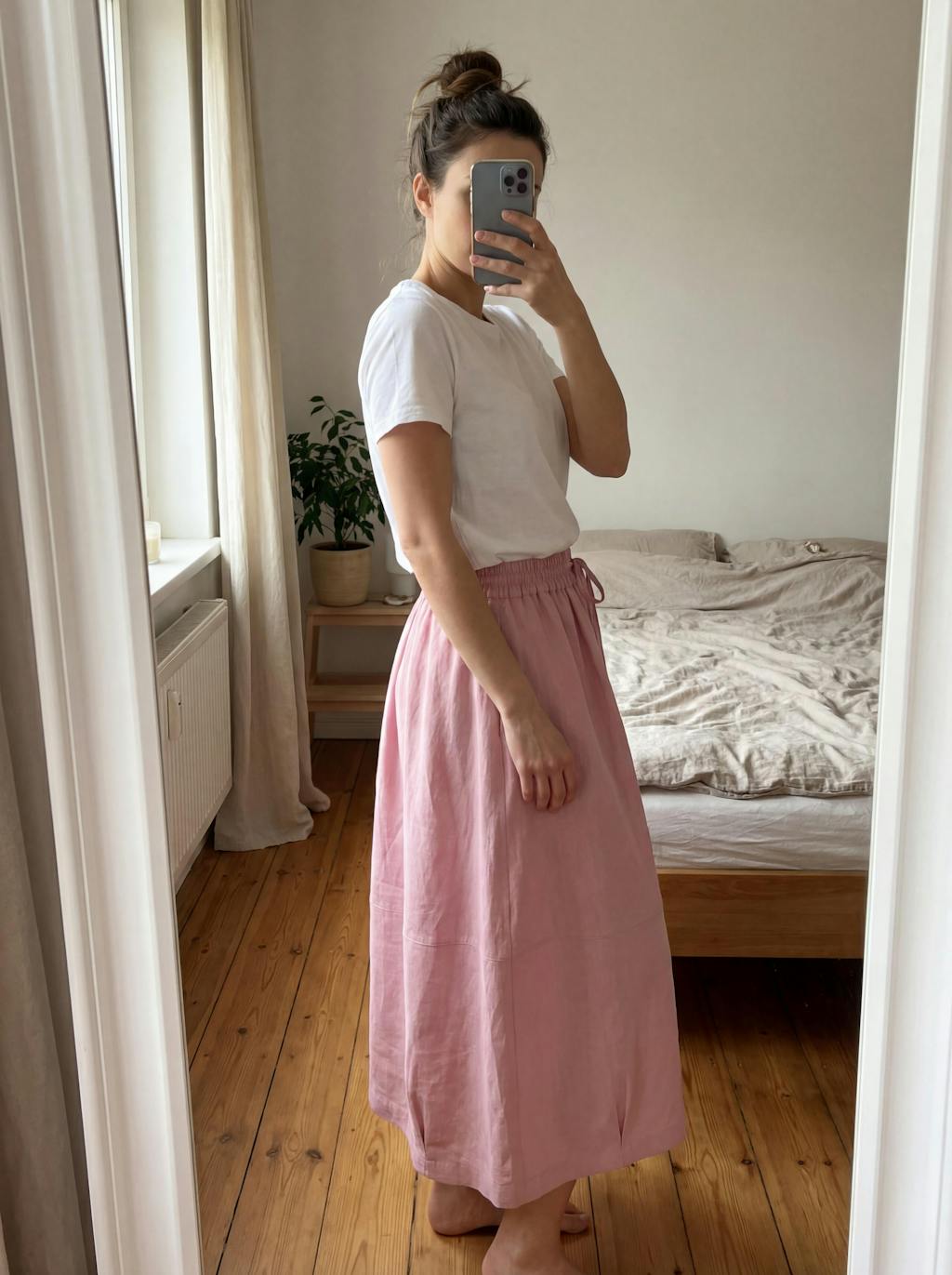 This linen texture is exactly what I needed for today's garden party. The drape is effortless, and the pink hue is so soft. It fits true to size, hitting just right. I did find a single thread on the hem, but otherwise, the quality is wonderful. Breathable and chic!