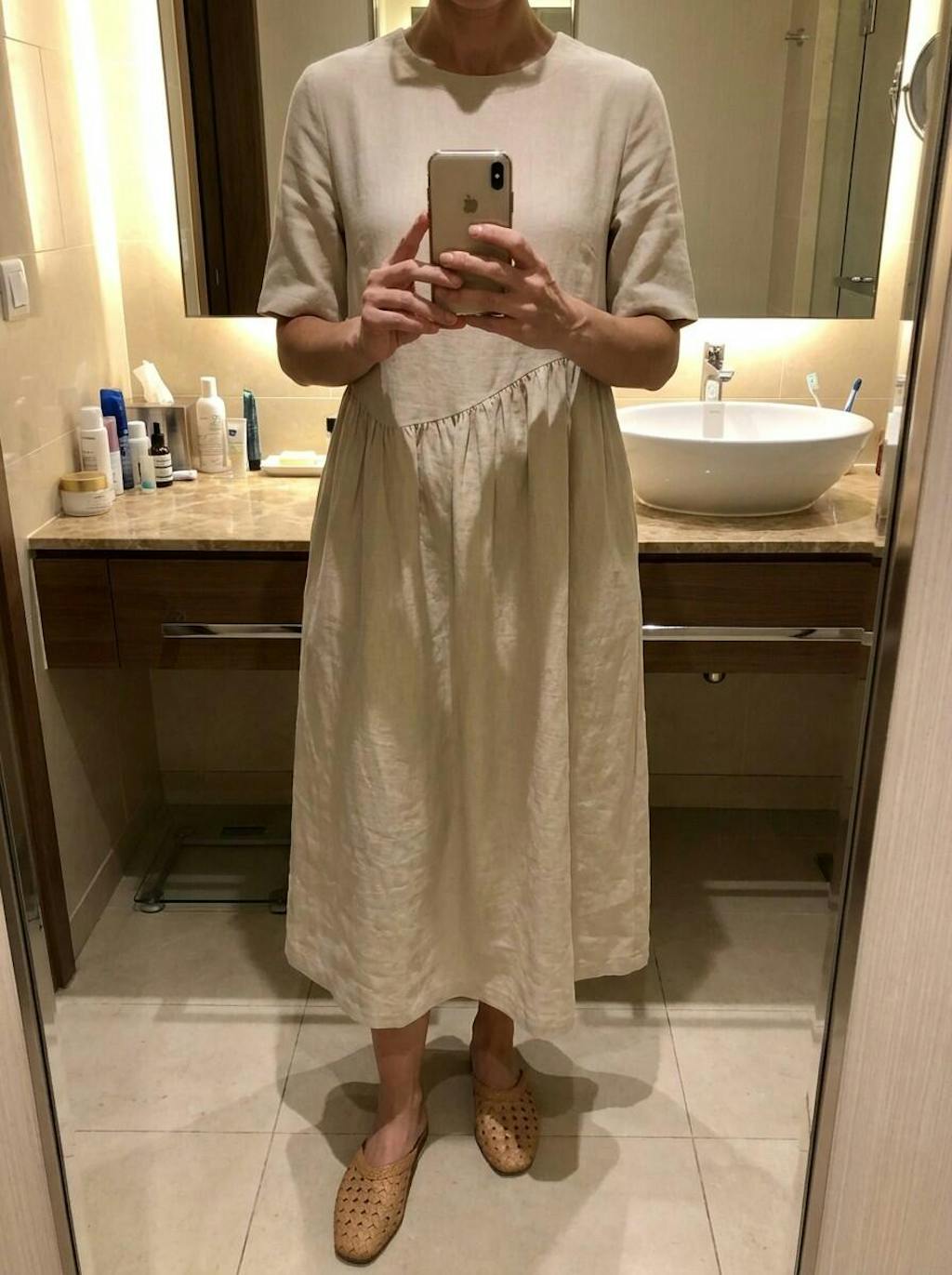 The linen texture is wonderfully authentic and breathable. Looking in my vanity mirror, the drop-waist silhouette feels very high-end and sophisticated. It is true to size for my medium frame.