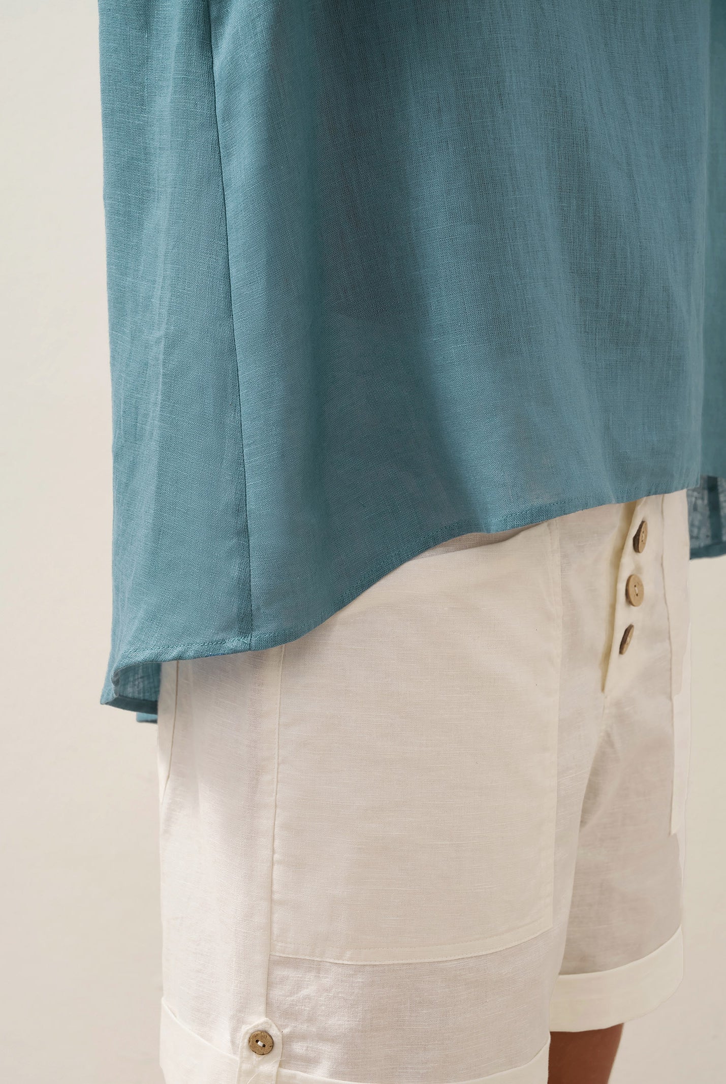 This off-white linen shirt is a dream! Adore the collar with a tie! The chest pockets add a casual, utilitarian vibe, and the oversized fit is relaxed yet stylish. I paired it with brown trousers and received so many compliments while exploring the city.