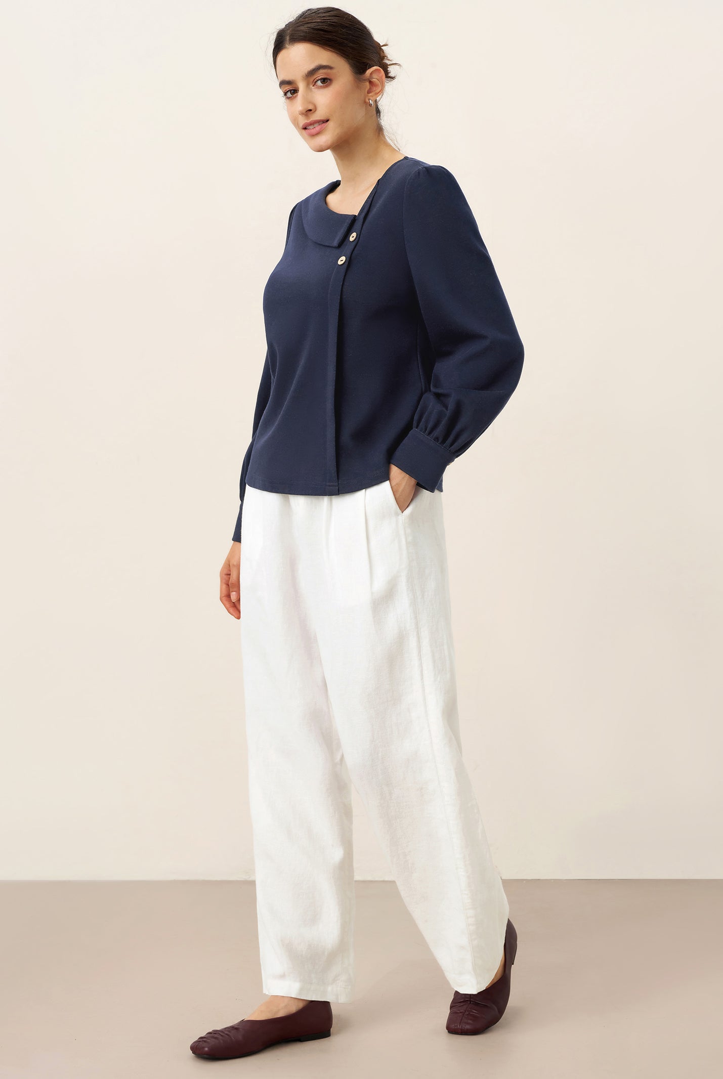 Its that time of year when I am packing summer away and making room for fall, and these linen pants are just what I needed. The navy blue goes with everything, the fit is comfortable, and the fabric feels breathable yet structured. A classic piece that makes the wardrobe switch a lot easier. Size: M