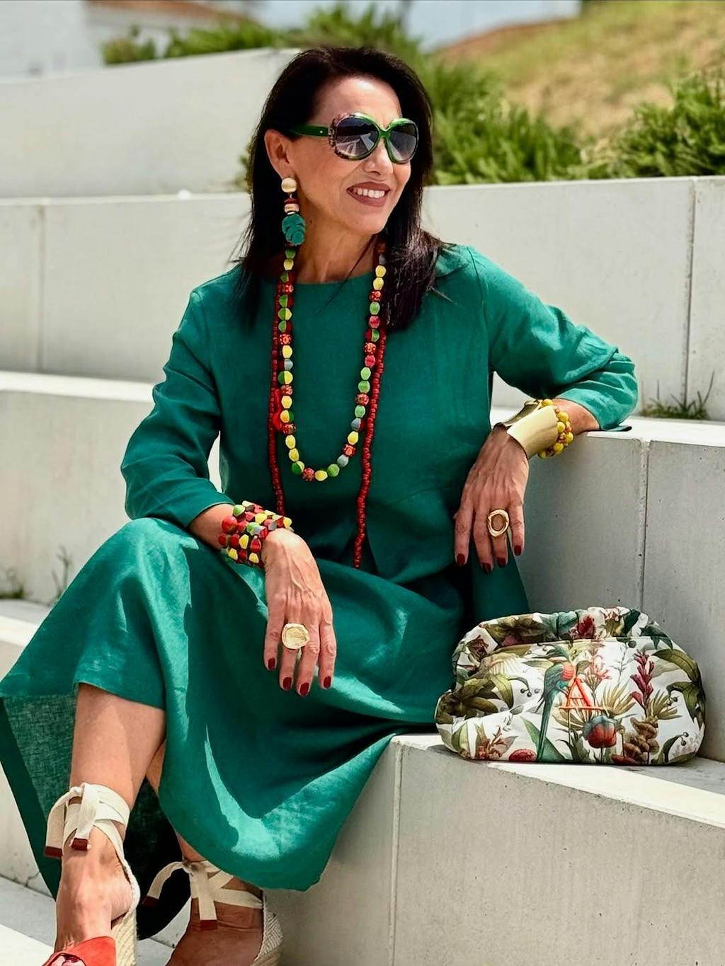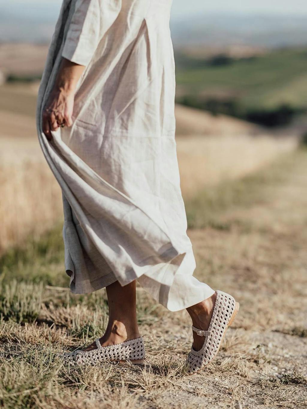 Garden Party Charm: Strappy sandals + floral hairpin with a lightweight shawl