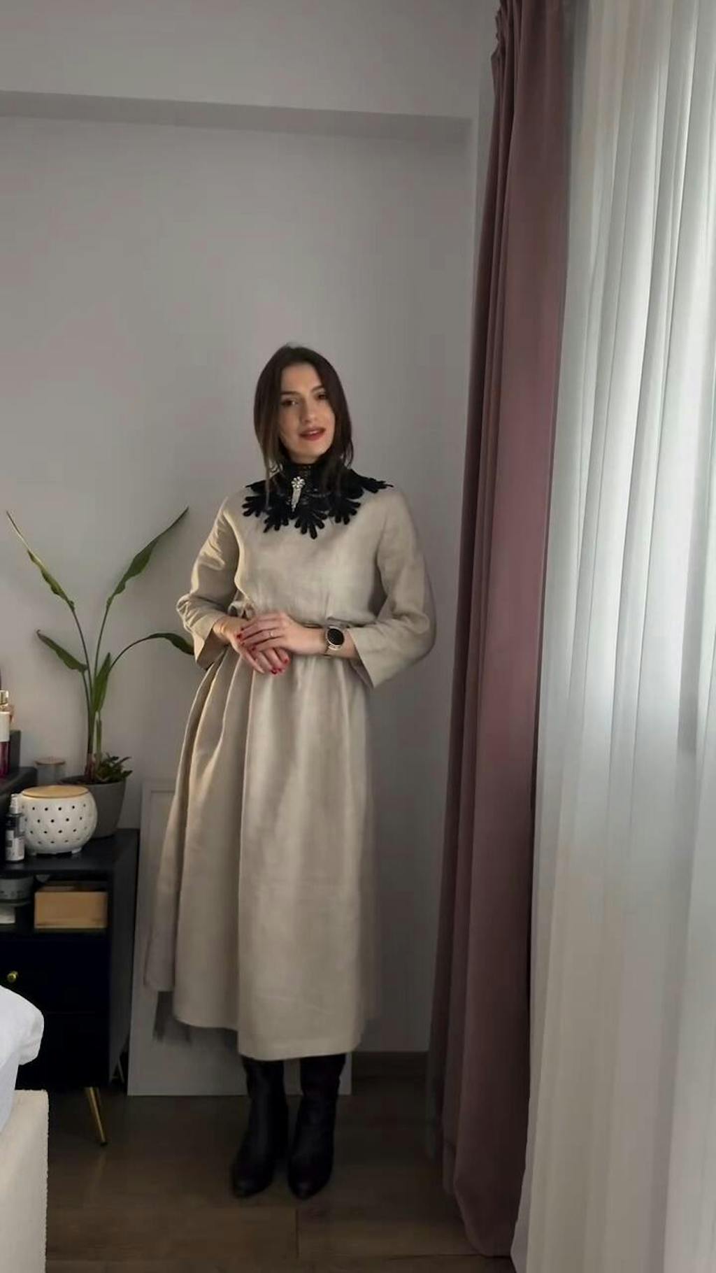 Discreet Side Pockets: Adds practical functionality without disrupting the dress’s clean, sophisticated lines